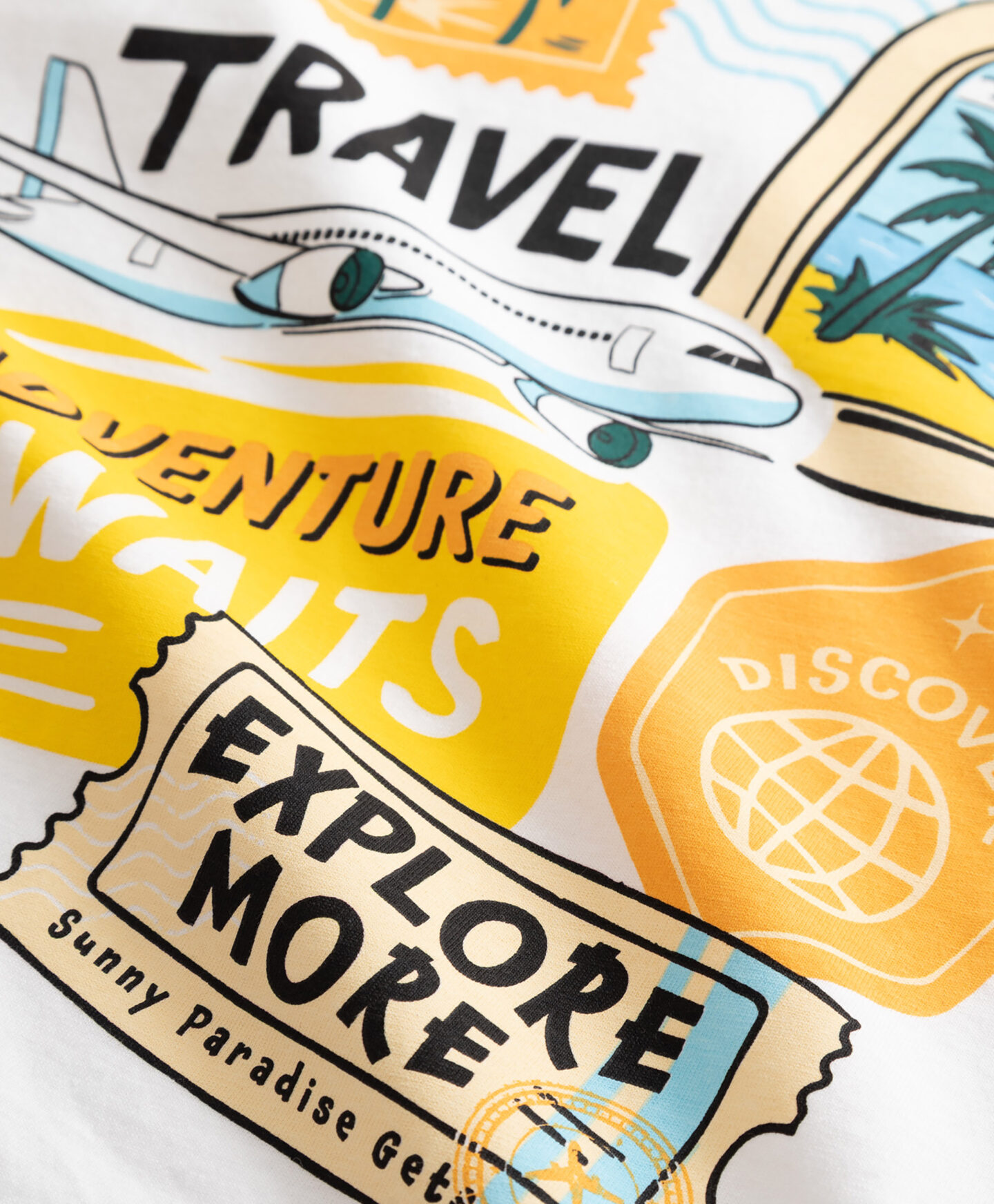 Ova bela majica za dečake od 100% pamuka savršen je izbor za male ljubitelje putovanja. Pamuk je prozračan i izuzetno mekan na dodir. Print inspirisan dugim putovanjima lako unosi letnju, avanturističku atmosferu u odeću za dečake.