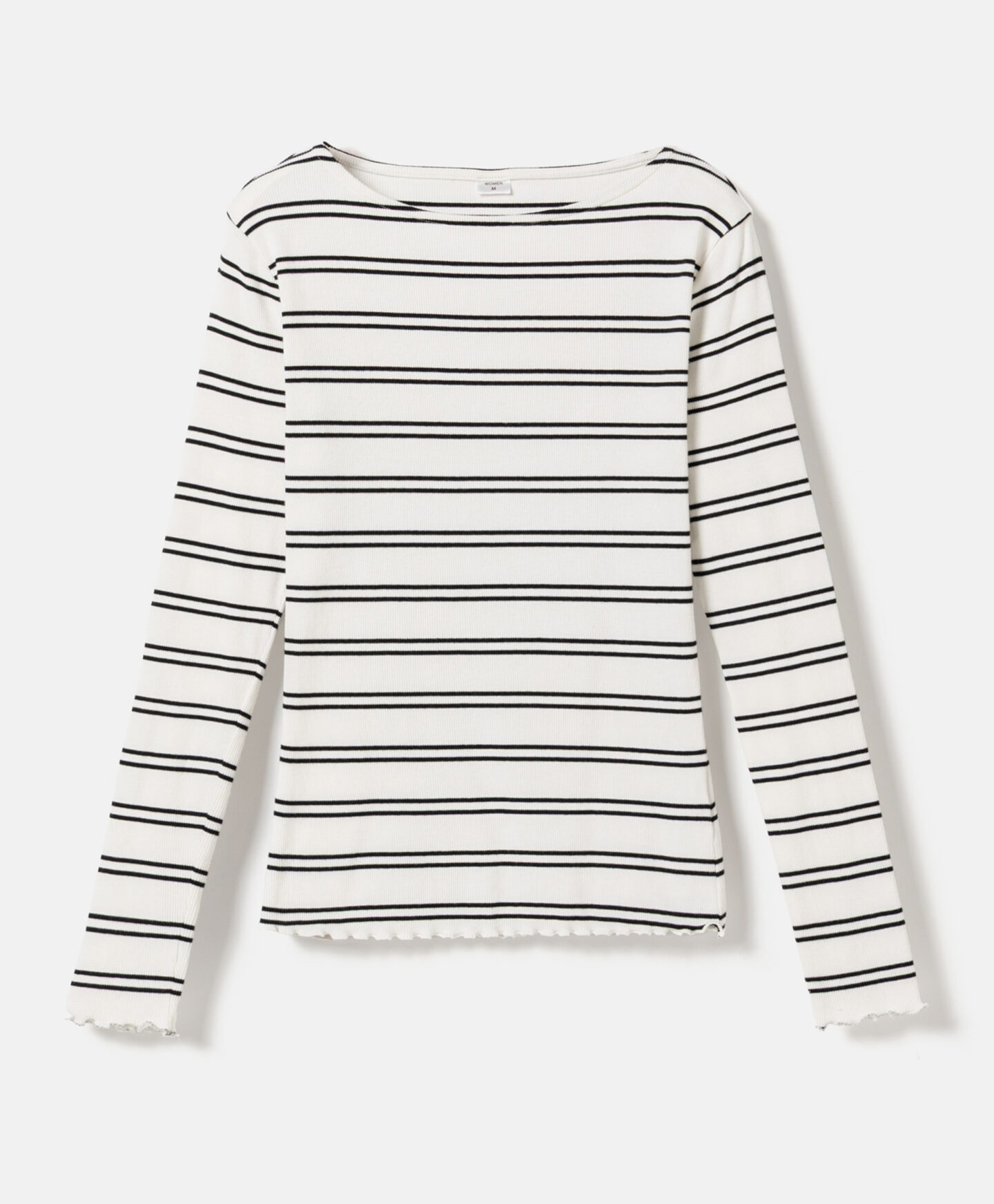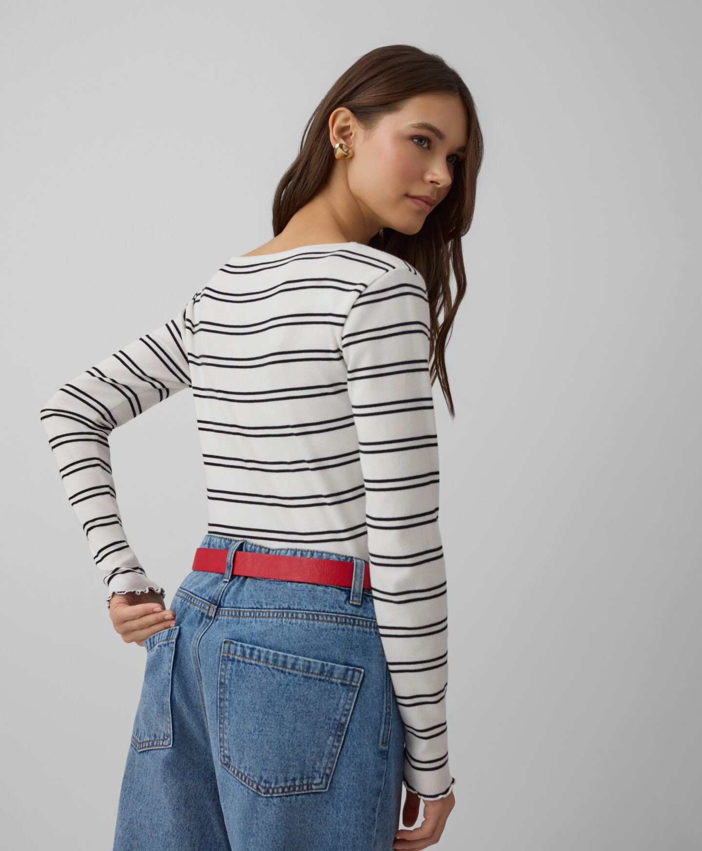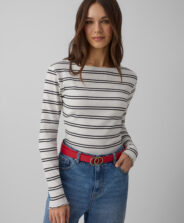 Bela prugasta majica za žene sa visokim sadržajem pamuka i dodatkom elastina savršeno se prilagođava figuri. Dekorativna obrada dodaje moderan pečat svakoj kombinaciji. Majica se odlično kombinuje i sa farmerkama i sa elegantnim pantalonama. Dostupna je u dve boje.