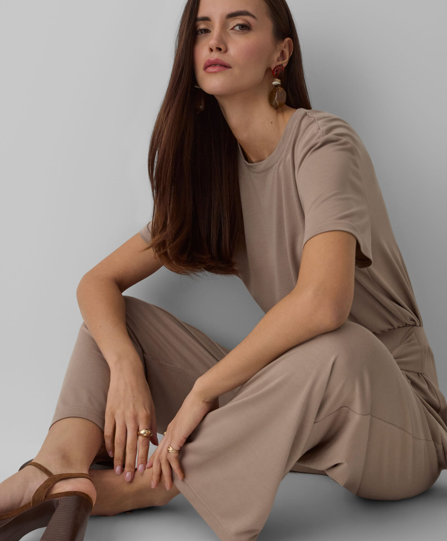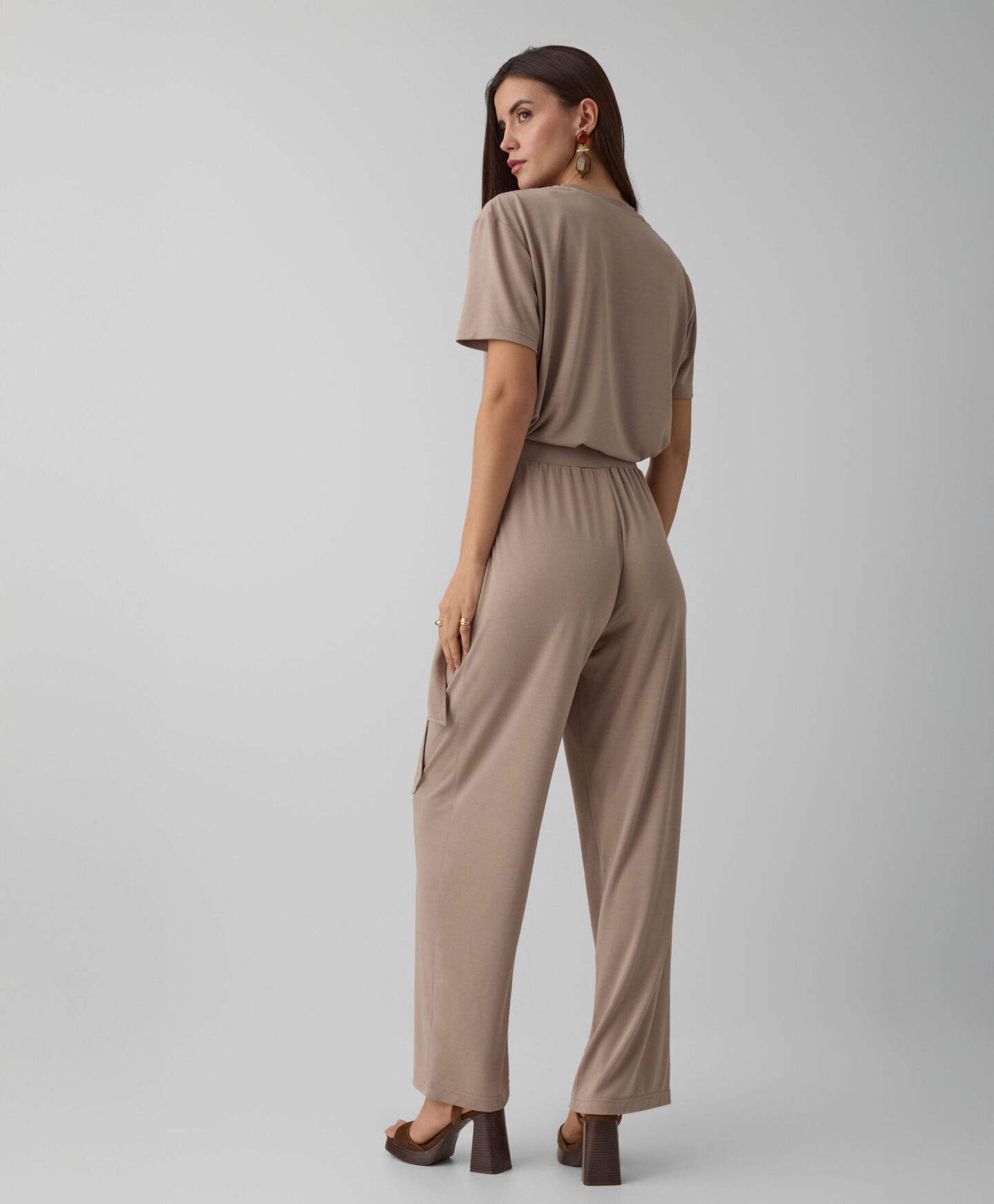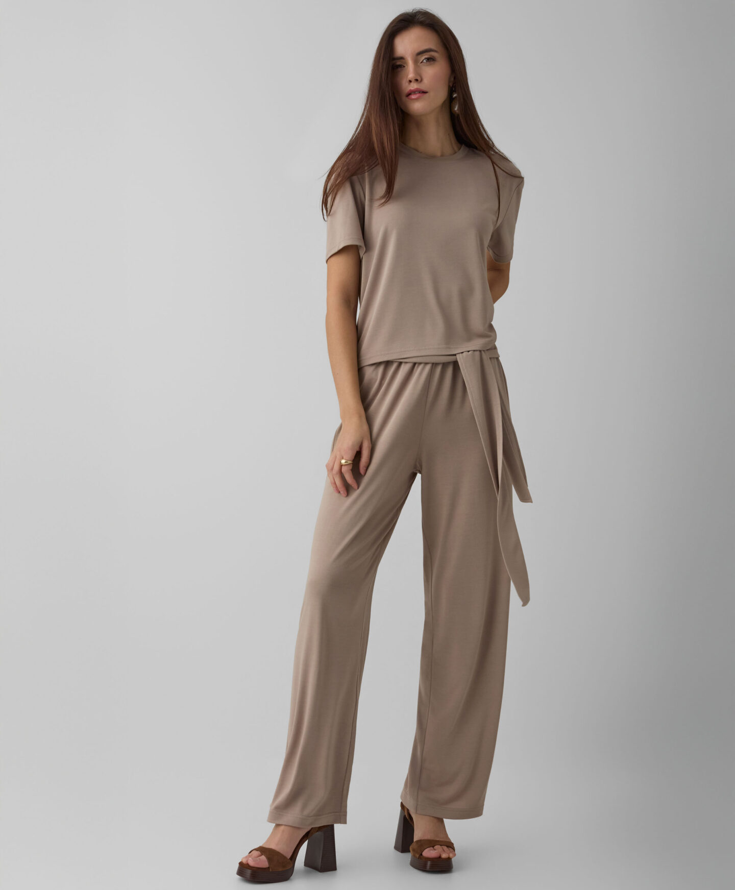 Bež majica za žene sa kratkim rukavima čini komplet sa pantalonama koje imaju vezivanje u struku, ali će se lepo uklopiti sa većinom odeće iz vašeg garderobera. Sve to zahvaljujući klasičnom kroju i univerzalnoj boji, koja nikada ne izlazi iz mode. Lagani materijal sa viskozom je lagan i prijatan na dodir. Majica će vam obezbediti udobnost tokom celodnevnog nošenja. Dva dizajna su dostupna u kolekciji.