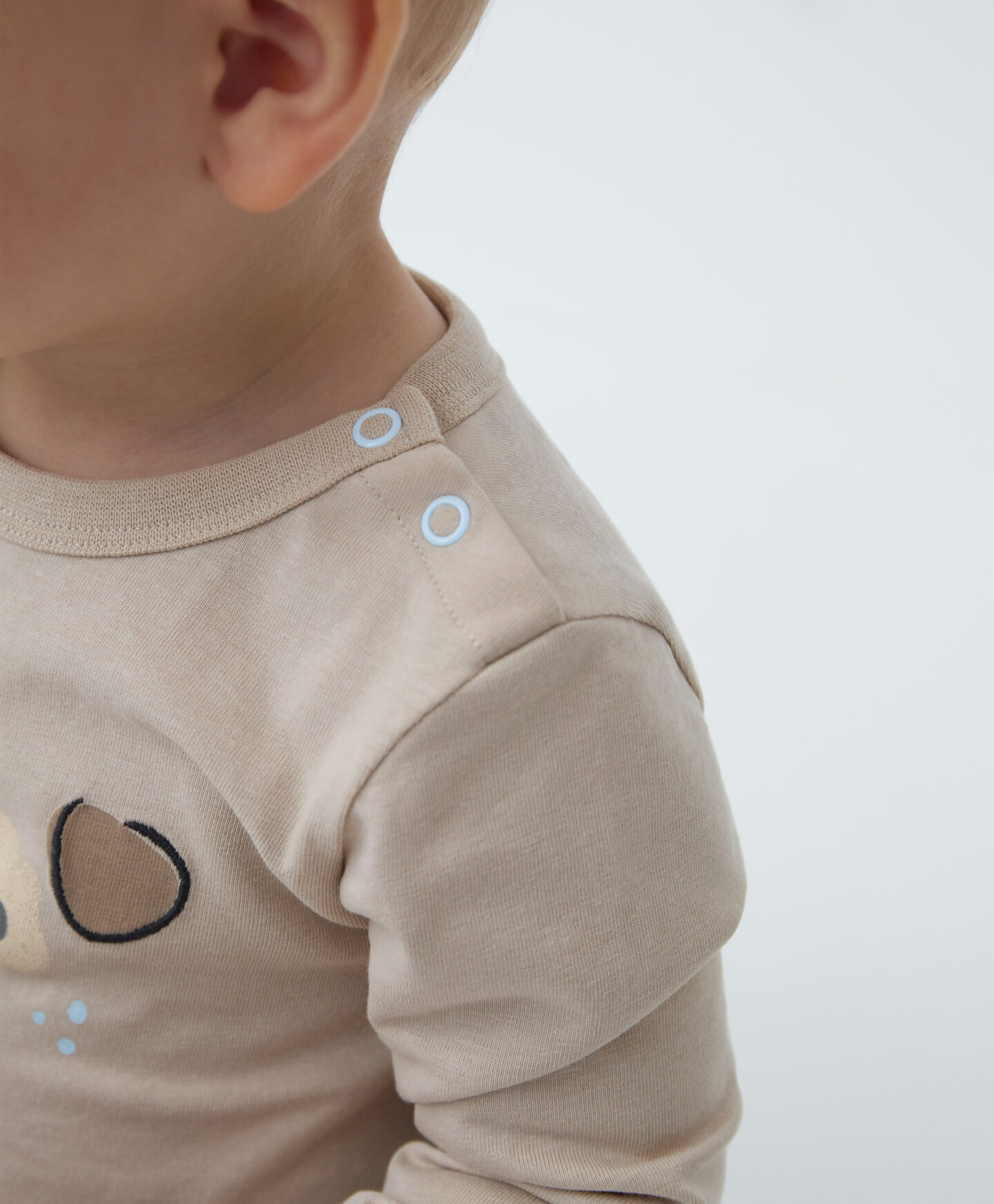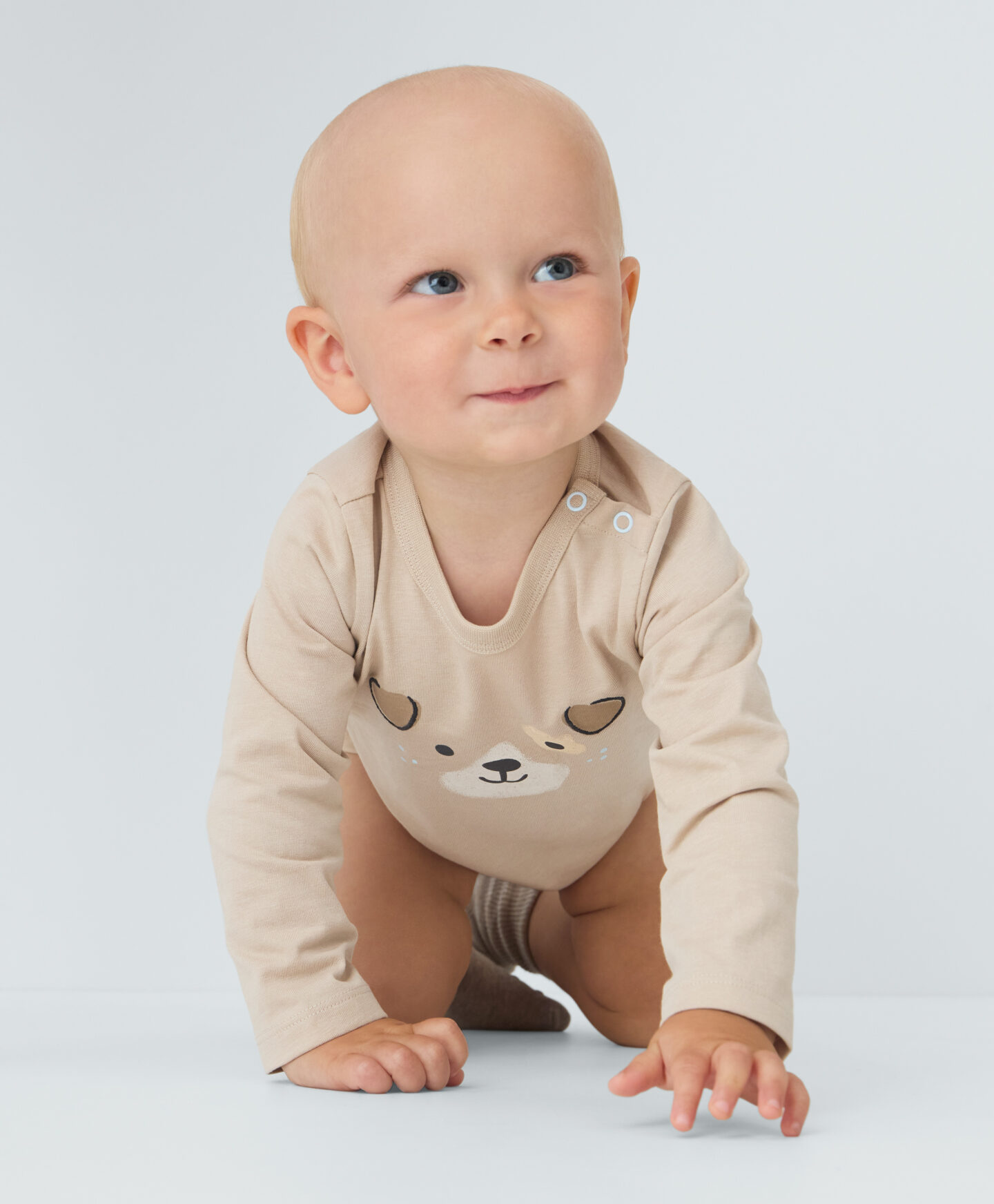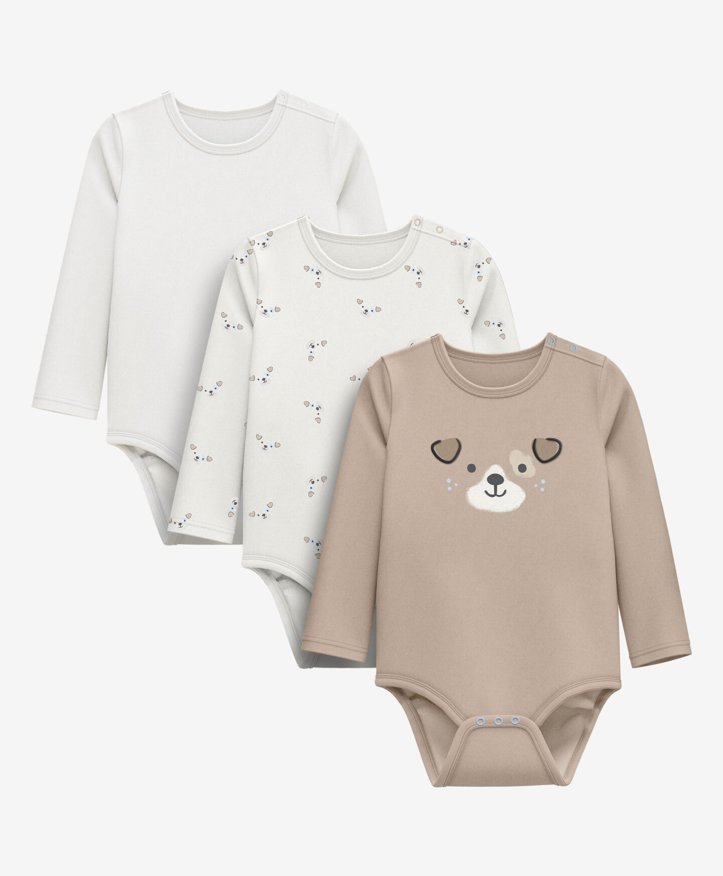 Bodi za bebe dečake, pakovanje od 3 komada 100% pamuk sa dezenom pasa dizajniran je za male obožavatelje životinja. Bodi je napravljen od prirodnih vlakana, što ga čini prozračnim i udobnim za nošenje. Praktično kopčanje na drikere olakšaće promenu pelena i oblačenje. Dezen sa psima dodaje šarm i karakter. Dostupni su i drugi dezeni.
