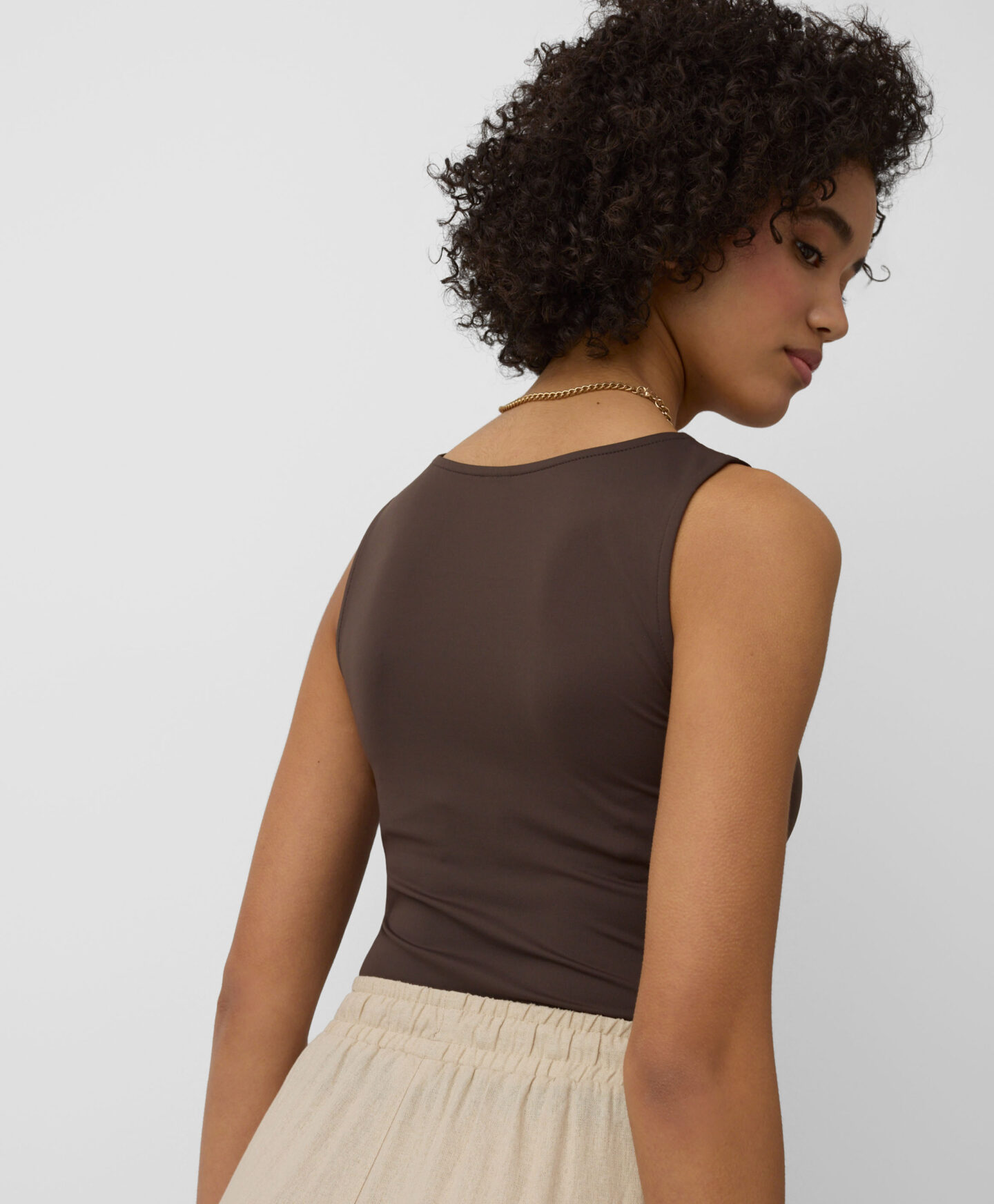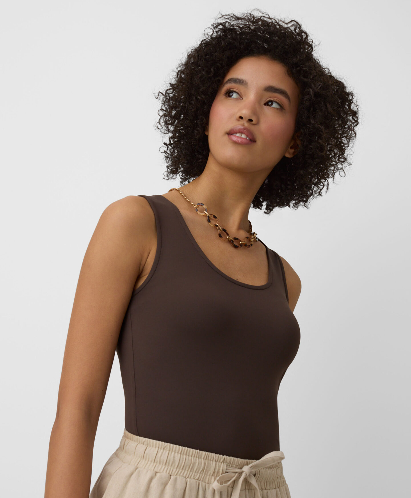 Braon top za žene izuzetno je raznovrsan. Lako se kombinuje uz farmerke, chino pantalone, šorts ili trenerku. Možete ga nositi ispod jakne ili dukserice. Glatka tekstura i jednobojni dizajn čine ga osnovom svake uspešne odevne kombinacije. Dostupan je u tri boje.