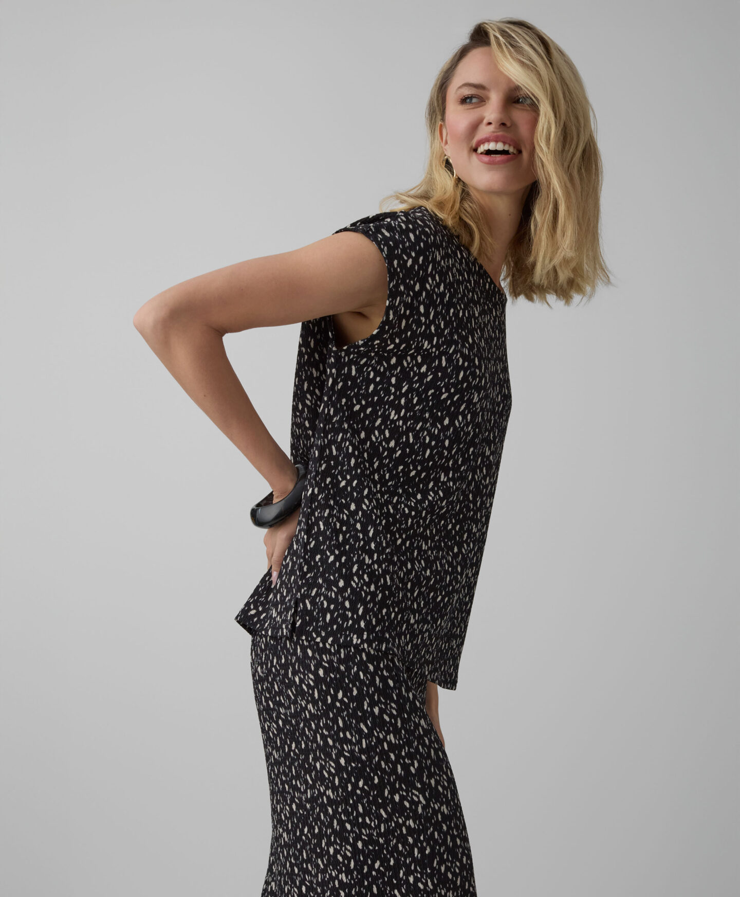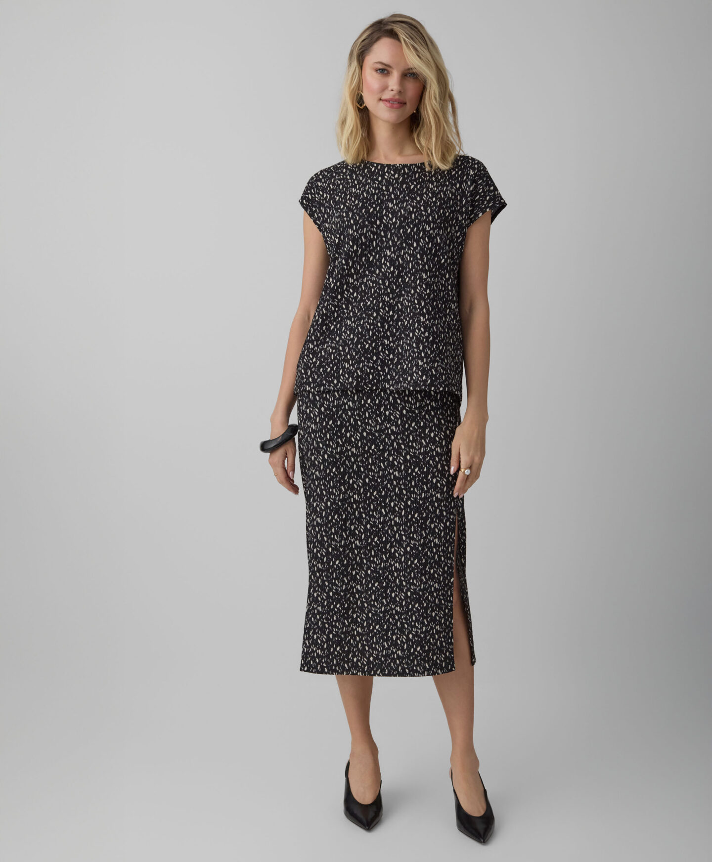 Crna košulja za žene sa naborima i dezenom čini komplet sa suknjom iz iste kolekcije. Međutim, možete je lako upariti i sa omiljenim farmerkama ili elegantnijim pantalonama. Kratki rukav je čini savršenom za slojevito oblačenje u prelaznim periodima. Odlično se slaže i uz klasični sako i kardigan.