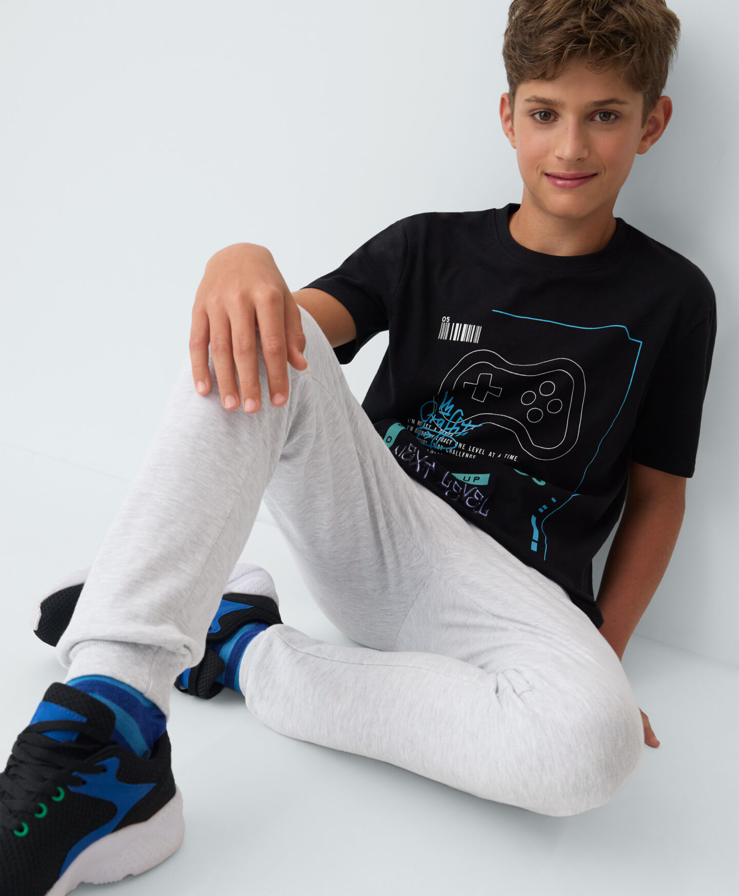 Crna majica kratkih rukava za dečake 100% pamuk odlična je za nošenje ispod duksa ili džempera. Lagana je, prozračna i mekana na dodir. Print na prednjoj strani je izdvaja i daje joj poseban karakter. Biće odličan izbor za školu, vannastavne aktivnosti ili slobodno vreme.