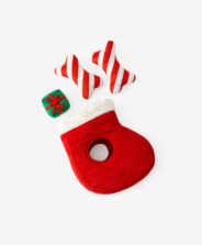 Poklon set za kućne ljubimce nudi raznovrsne dodatke koji obogaćuju svakodnevne aktivnosti psa. Plišane kosti u šarama poput bombona i mali poklon su odlični za žvakanje, dok čarapa u prazničnim bojama služi kao skladište za igračke.