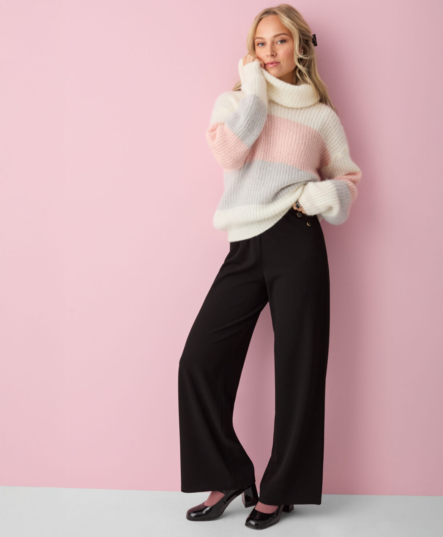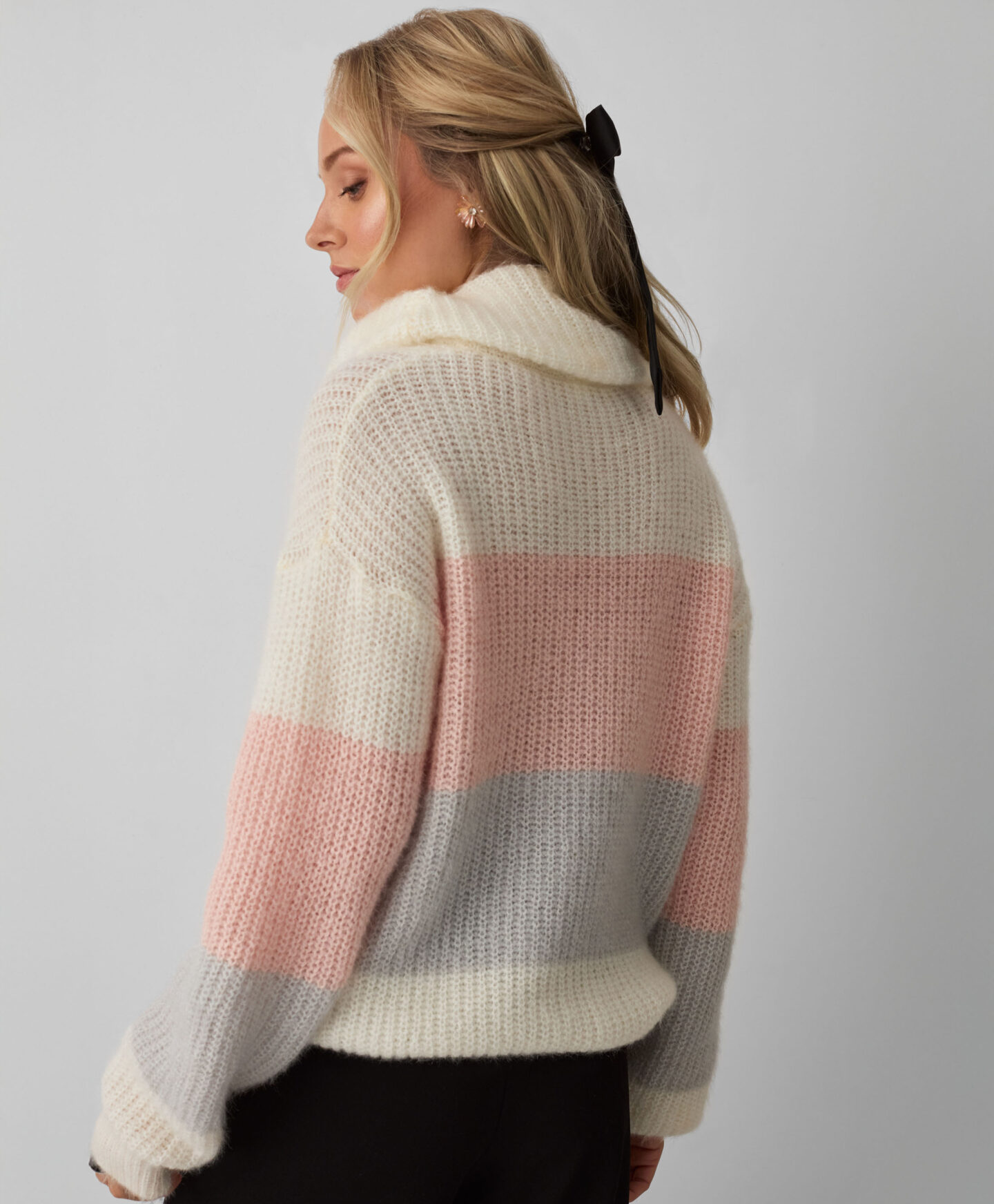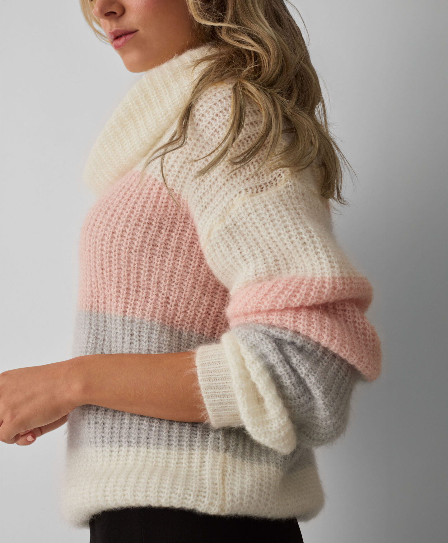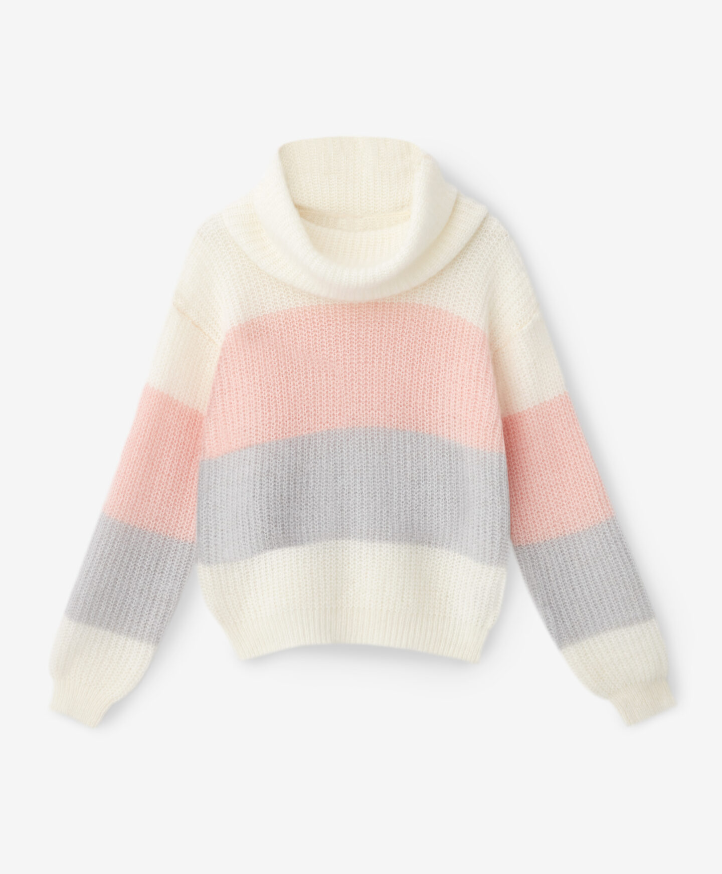 Džemper na pruge za žene sa rol-kragnom ugrejaće vas tokom hladnih dana. Topao je, mekan na dodir i udoban za nošenje. Široke pruge u pastelnim bojama dodaju nežnost. Izgledaće sjajno u kombinaciji sa klasičnim farmerkama, elegantnim pantalonama, ali i sa donjim delom trenerke.