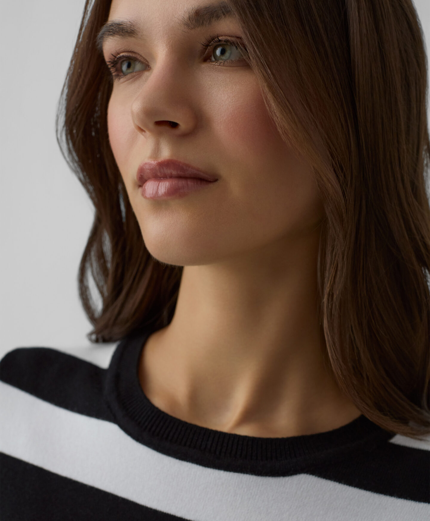 Džemper na pruge za žene sa viskozom je izuzetno moderan komad garderobe. Viskozni materijal je mekan i prozračan, zbog čega je džemper prijatan za nošenje i lepo pristaje uz figuru. Prugasti dezen daje mu savremen karakter i savršeno se kombinuje i sa farmerkama i sa suknjama.