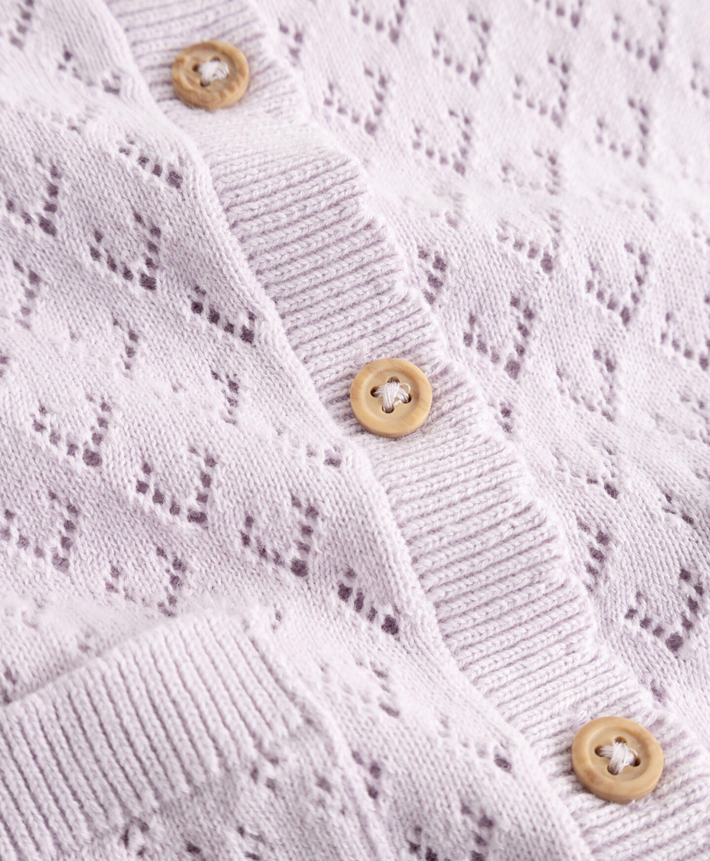 Ovaj džemper za bebe devojčice od 100% pamuka sa rupičastim dezenom lagan je i elegantan. Prirodan materijal omogućava koži da diše i bezbedan je za nošenje već od prvih nedelja života. Cvetni vez na džepiću predstavlja elegantan detalj koji će se istaći u svakoj kombinaciji. Džemper je savršen za nošenje preko majice, košuljice ili haljinice. Prolećna boja uneće svežinu i razigranost u garderobu vaše male princeze.