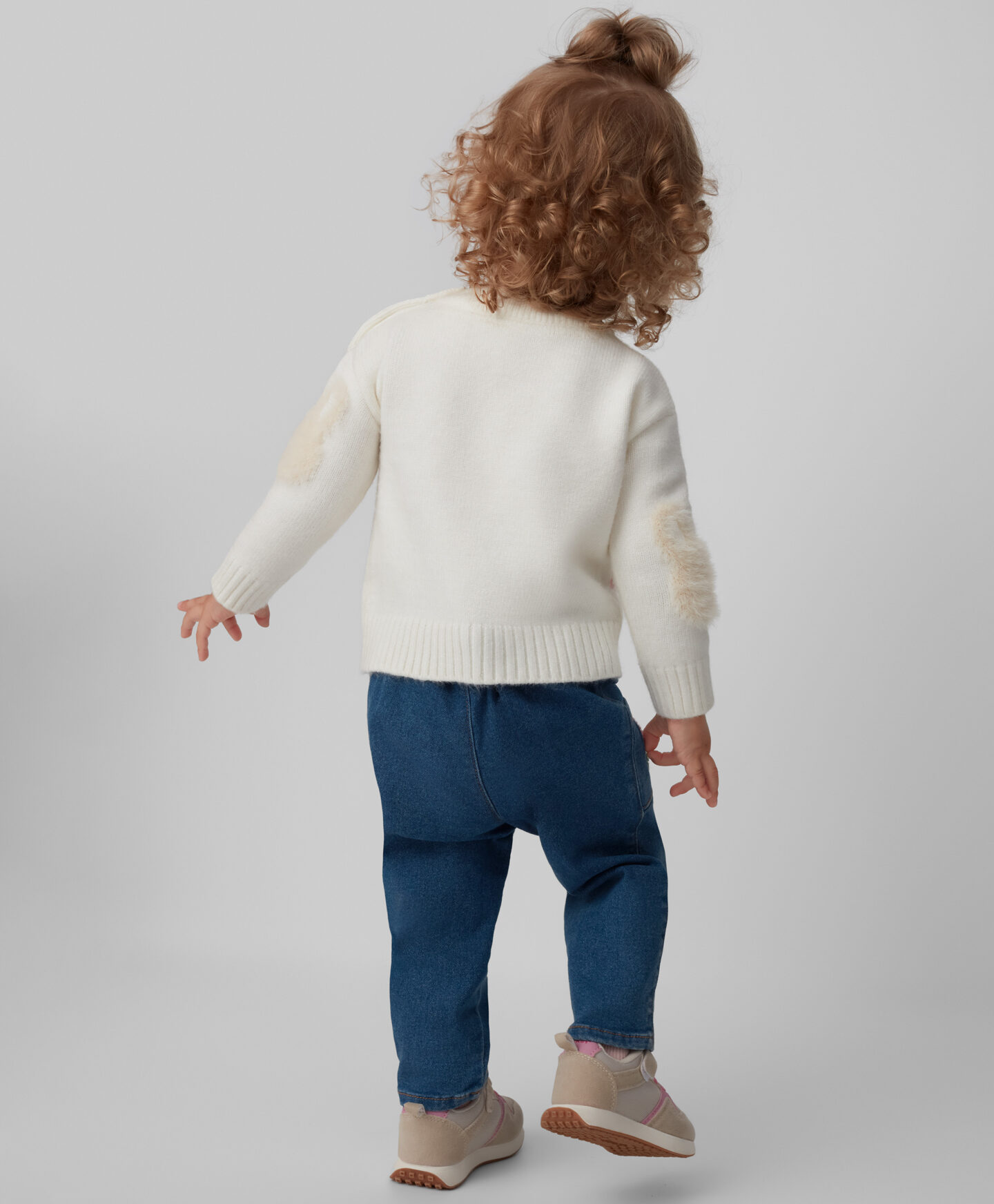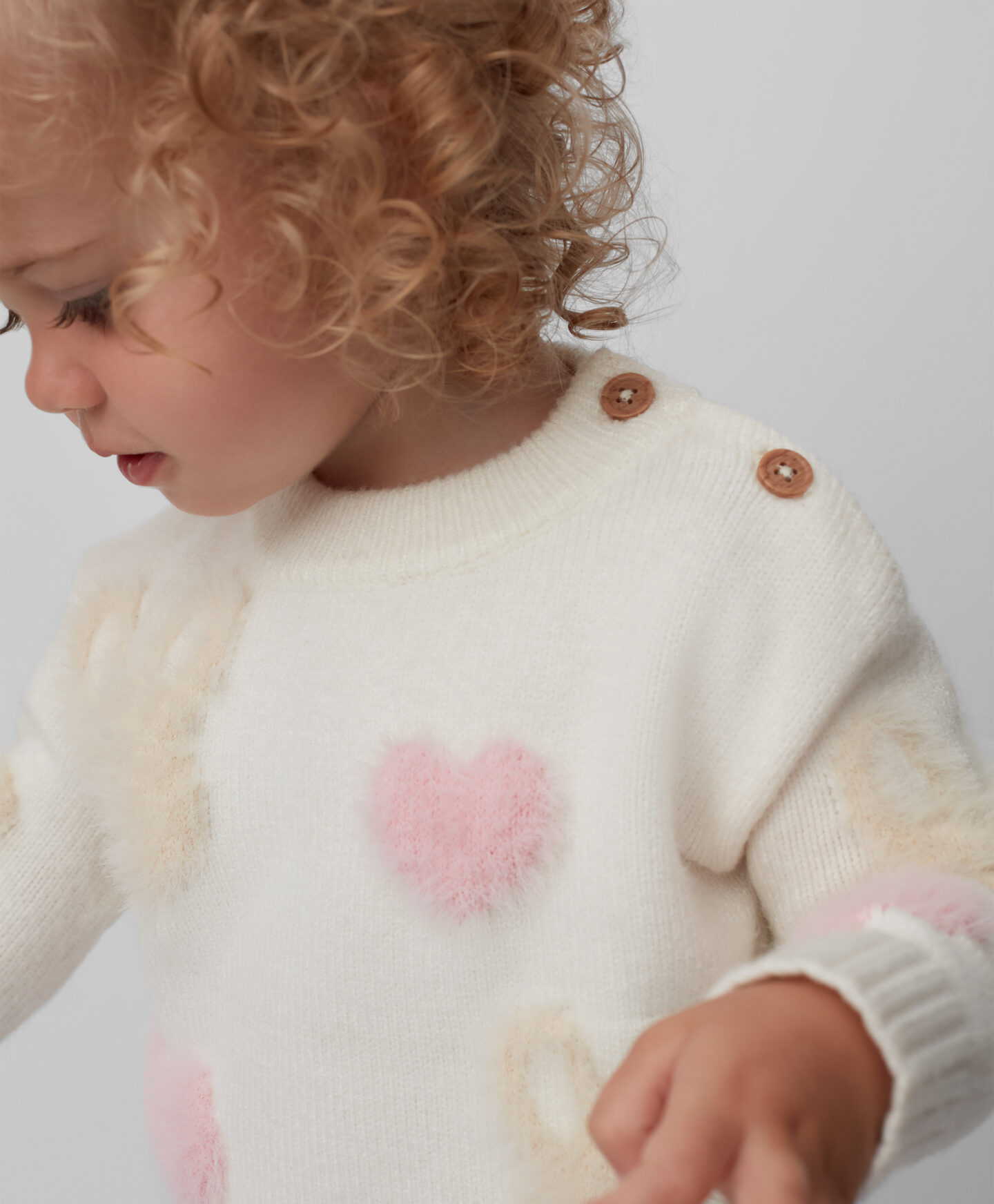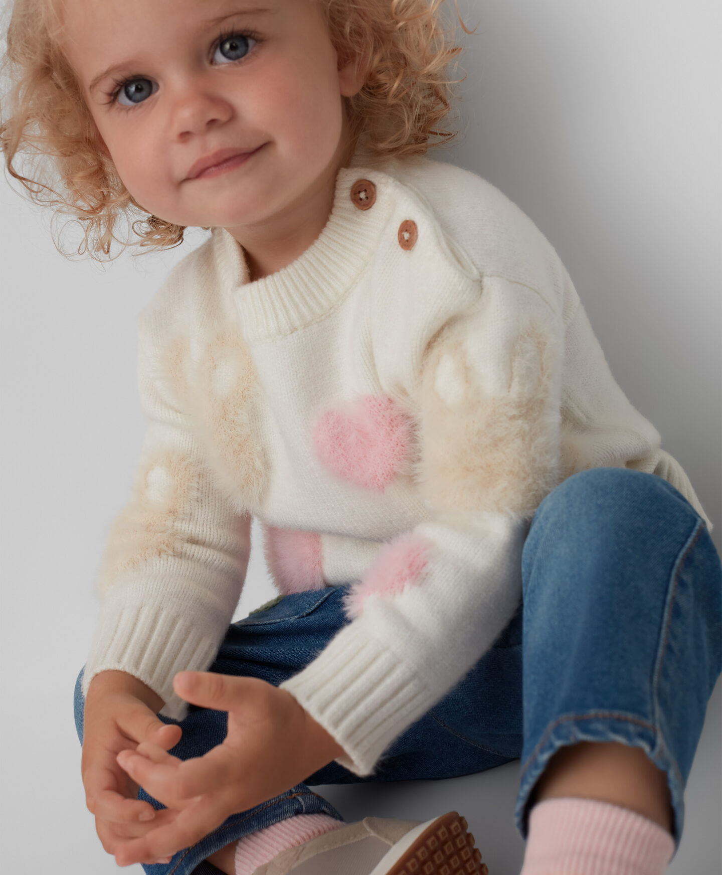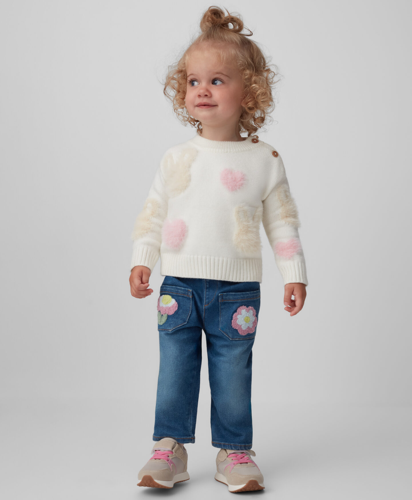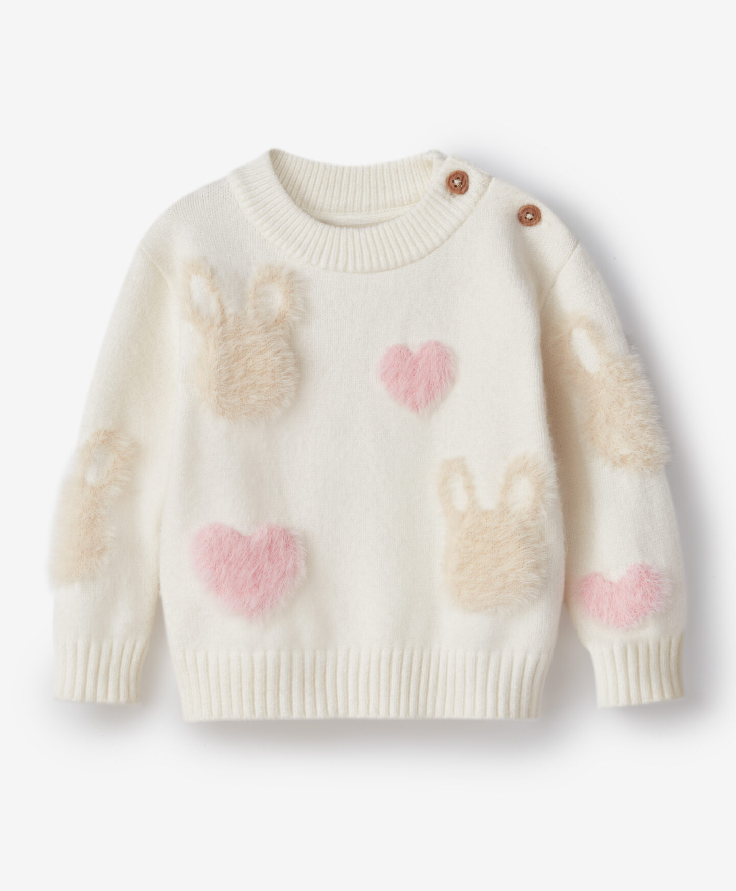 Džemper za bebe devojčice sa dugmićem na ramenu je udobna opcija za svaki dan. Kopčanje na dugmiće olakšava oblačenje vaše devojčice, a dezen sa motivima zečeva i srca daće šarm svakom autfitu. Džemper je topao, mekan i nežan prema koži.
