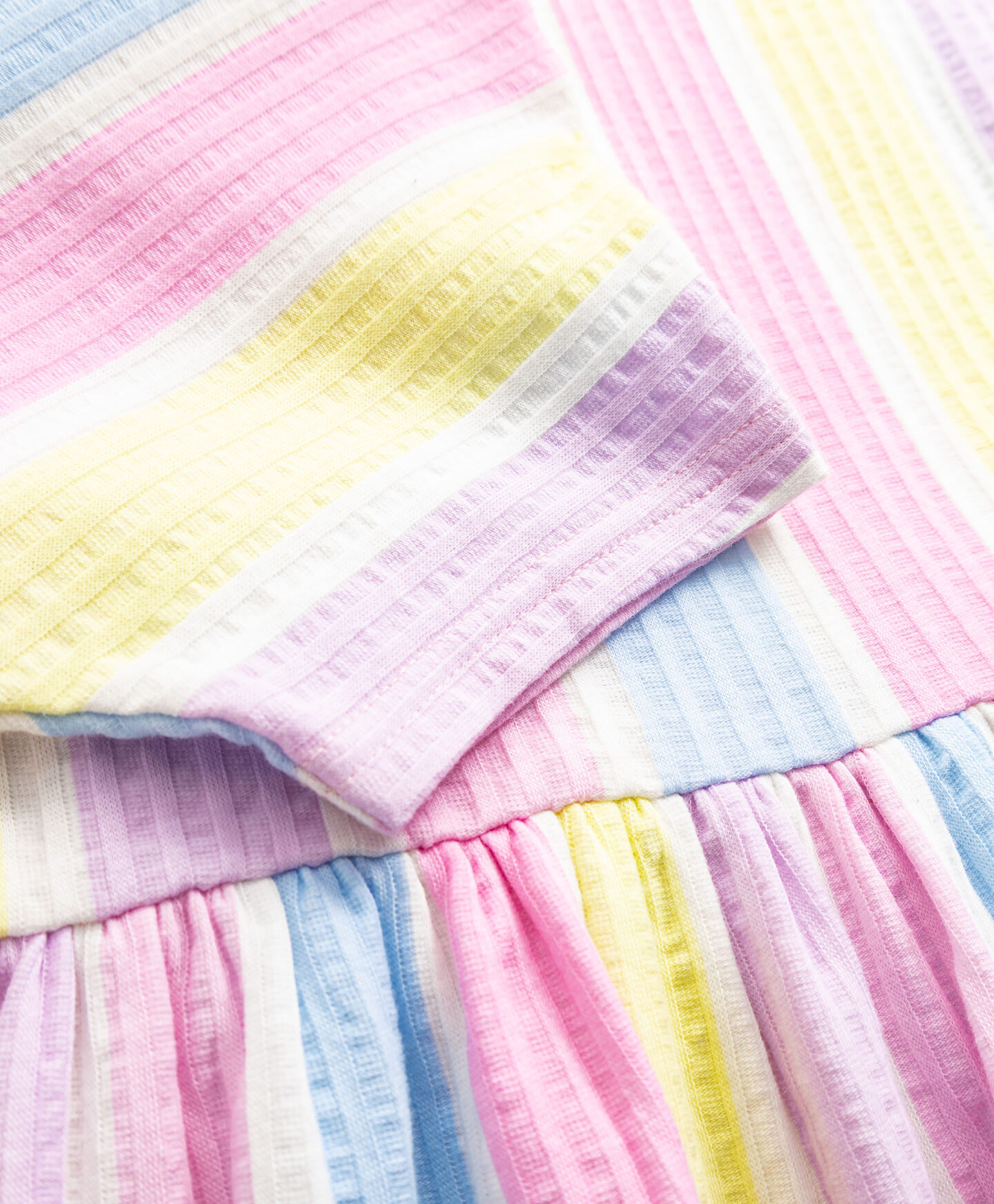 Ova haljina za devojčice od 100% pamuka spaja bezvremeni stil i udobnost. Pastelne pruge su jedan od najvećih trendova ove sezone. Haljina je dizajnirana tako da omogućava slobodu pokreta, dok blago zvonasta suknja daje lakoću i poseban šarm