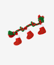 Igračka za pse – tegljač sa čarapama ima šareni dizajn i meke dodatke u obliku crvenih čarapa. Jako uže obezbeđuje izdržljivost, dok plišani elementi podstiču hvatanje. Kombinacija boja izaziva praznično raspoloženje, pružajući psu zanimljivu aktivnost koja nudi kretanje i zabavu.