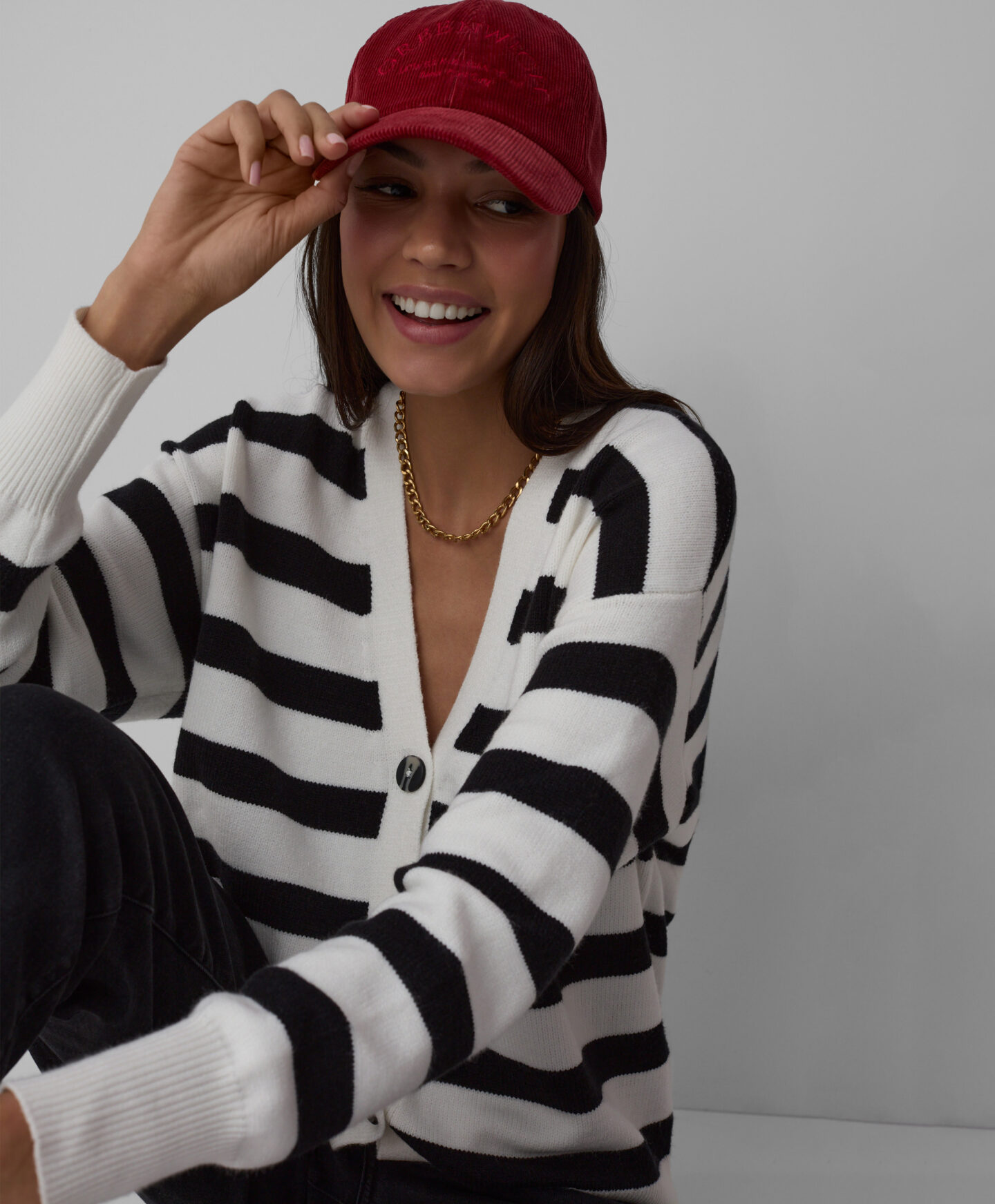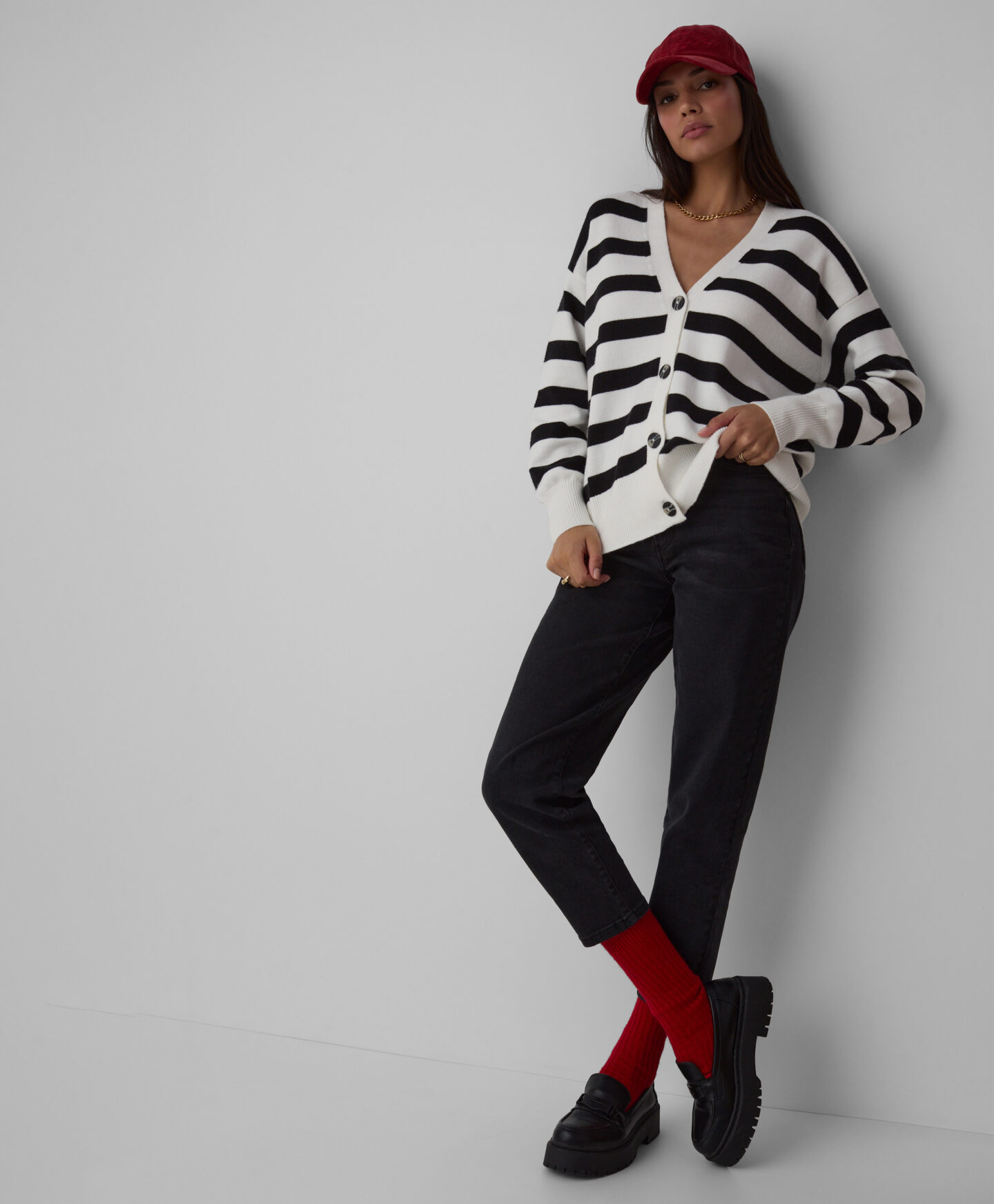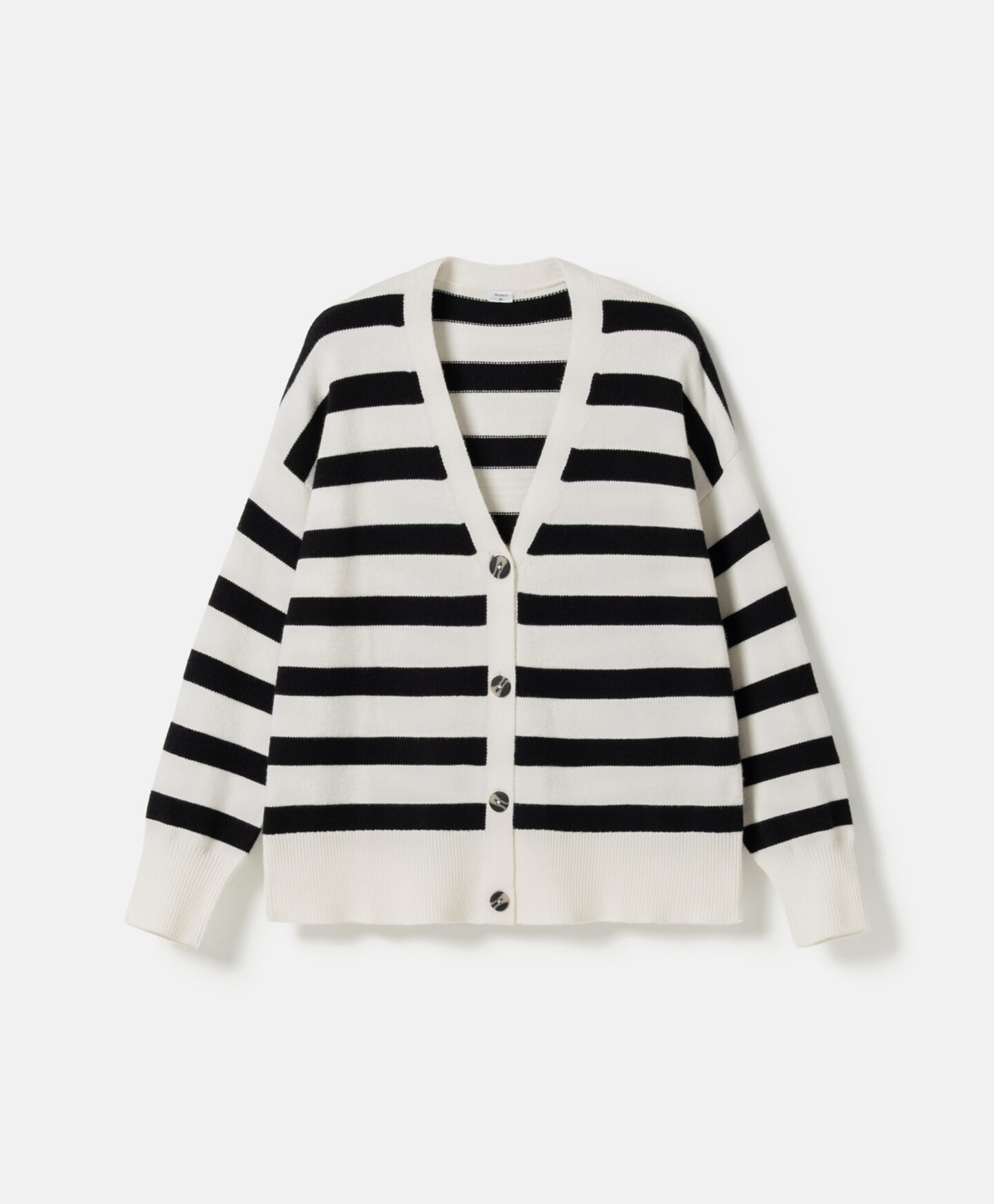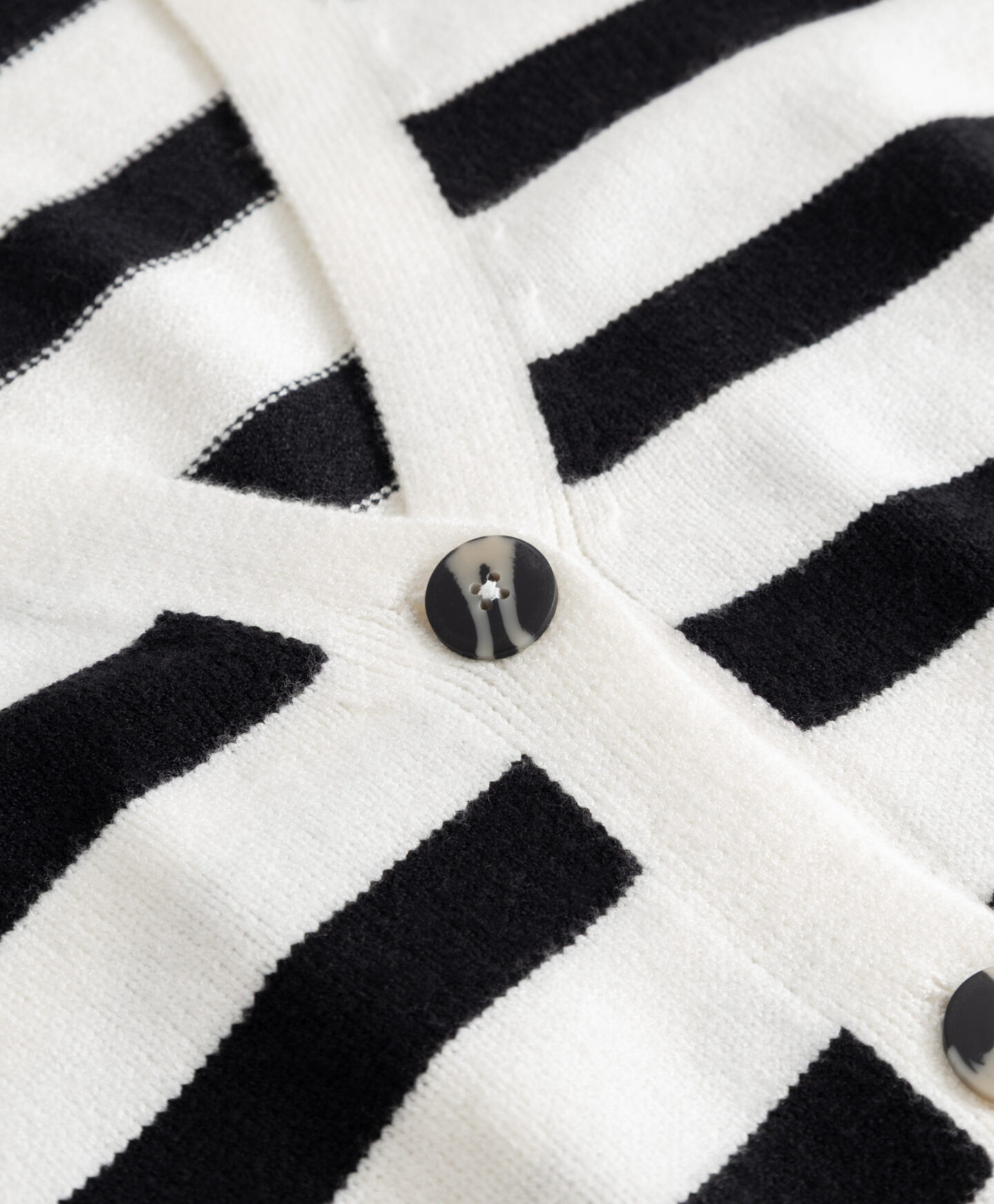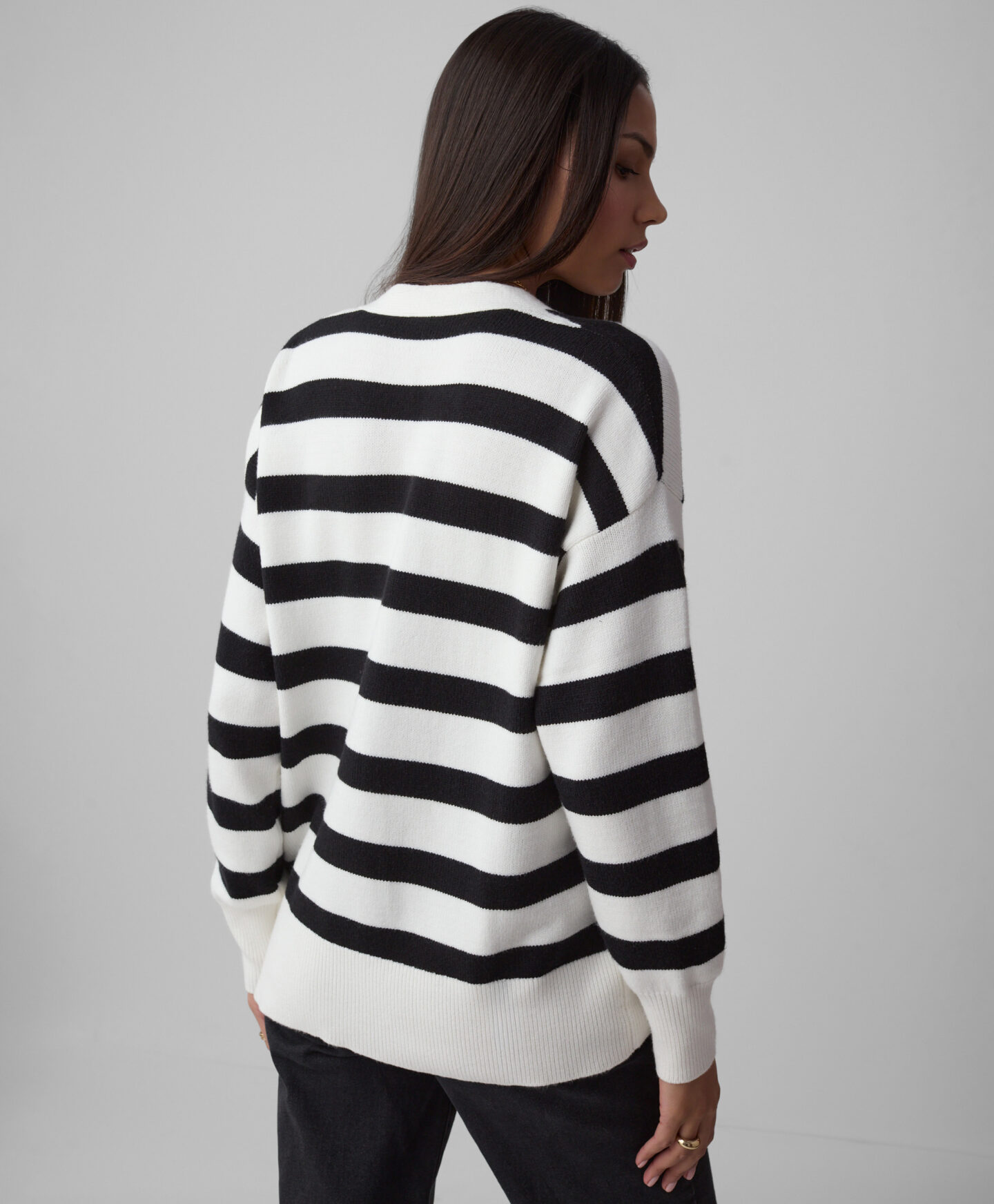 Kardigan za žene na crno-bele pruge, širokog kroja, idealan je izbor za sve koji vole udoban klasičan stil. Prugasti dezen nikada ne izlazi iz mode i odlično izgleda i uz elegantne pantalone i uz klasične farmerke. Mekani materijal sa viskozom nežno obavija kožu i pruža toplinu tokom hladnih zimskih dana. Proizvod je dostupan u dve boje.