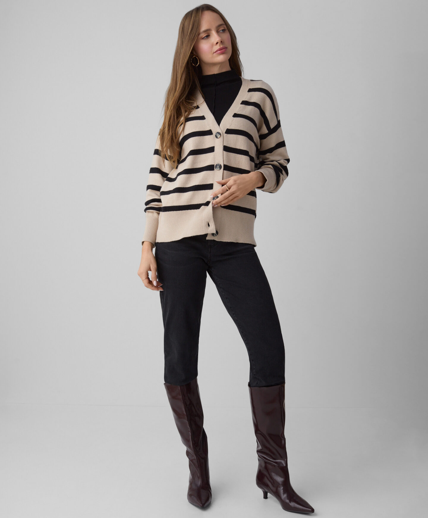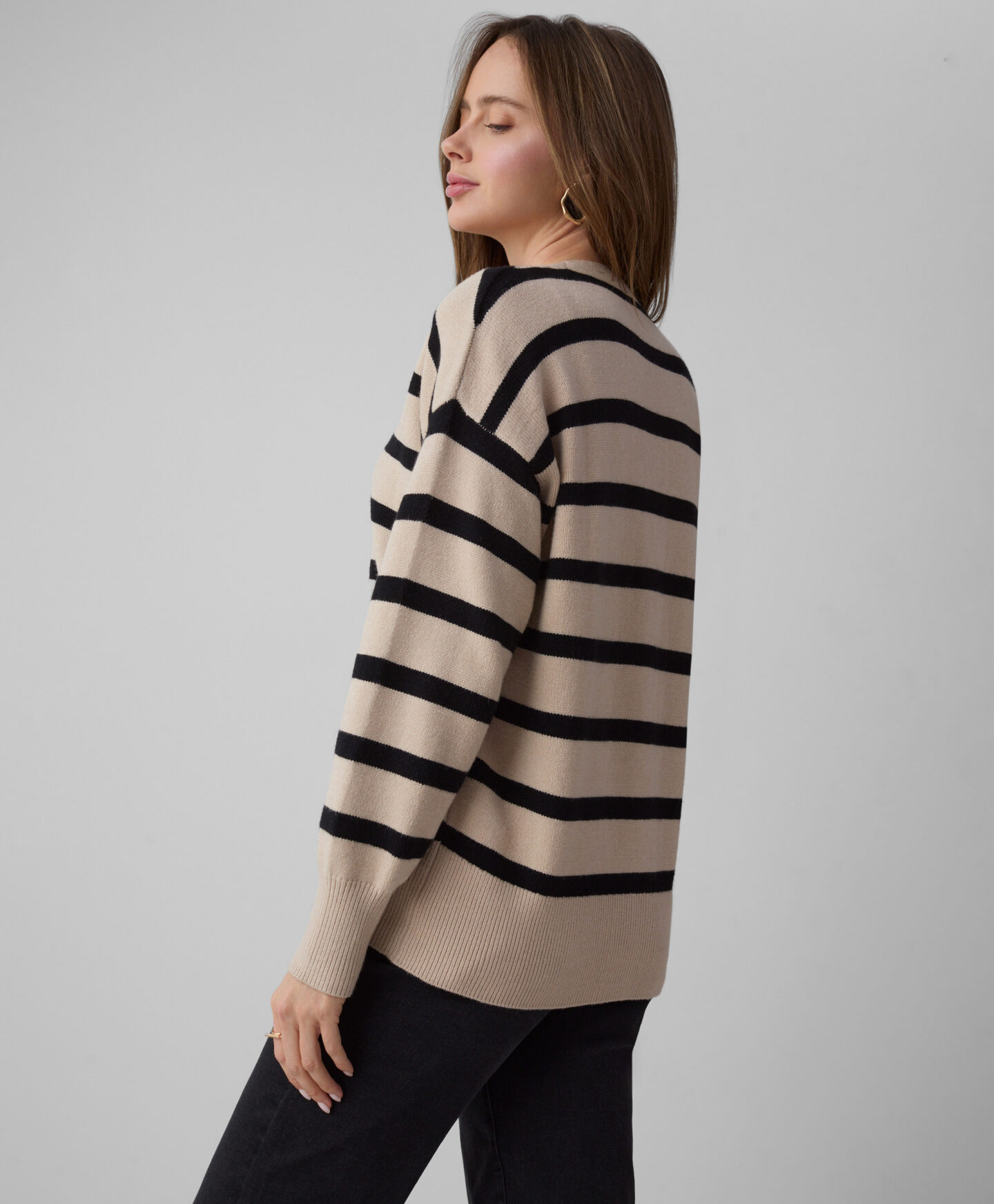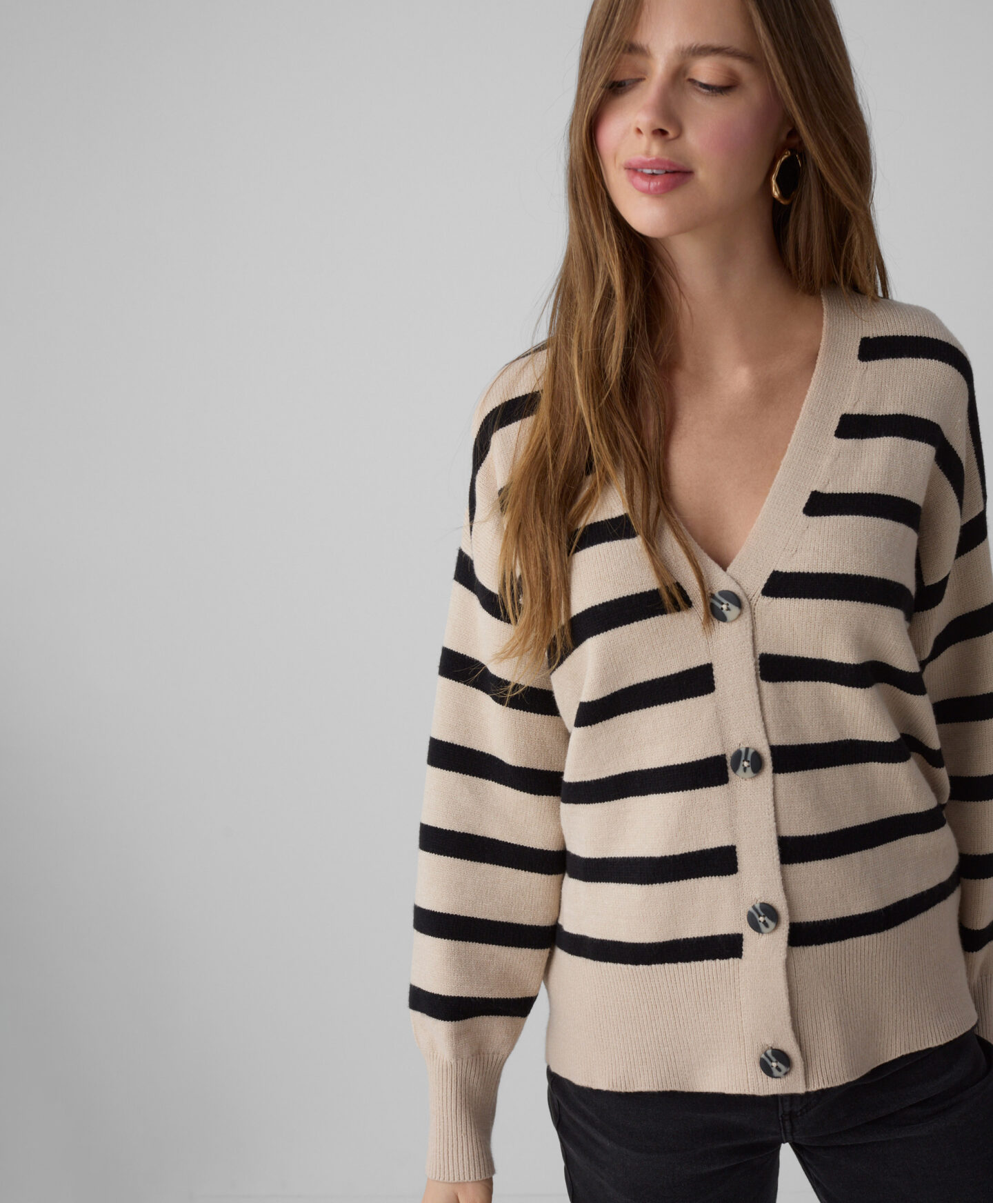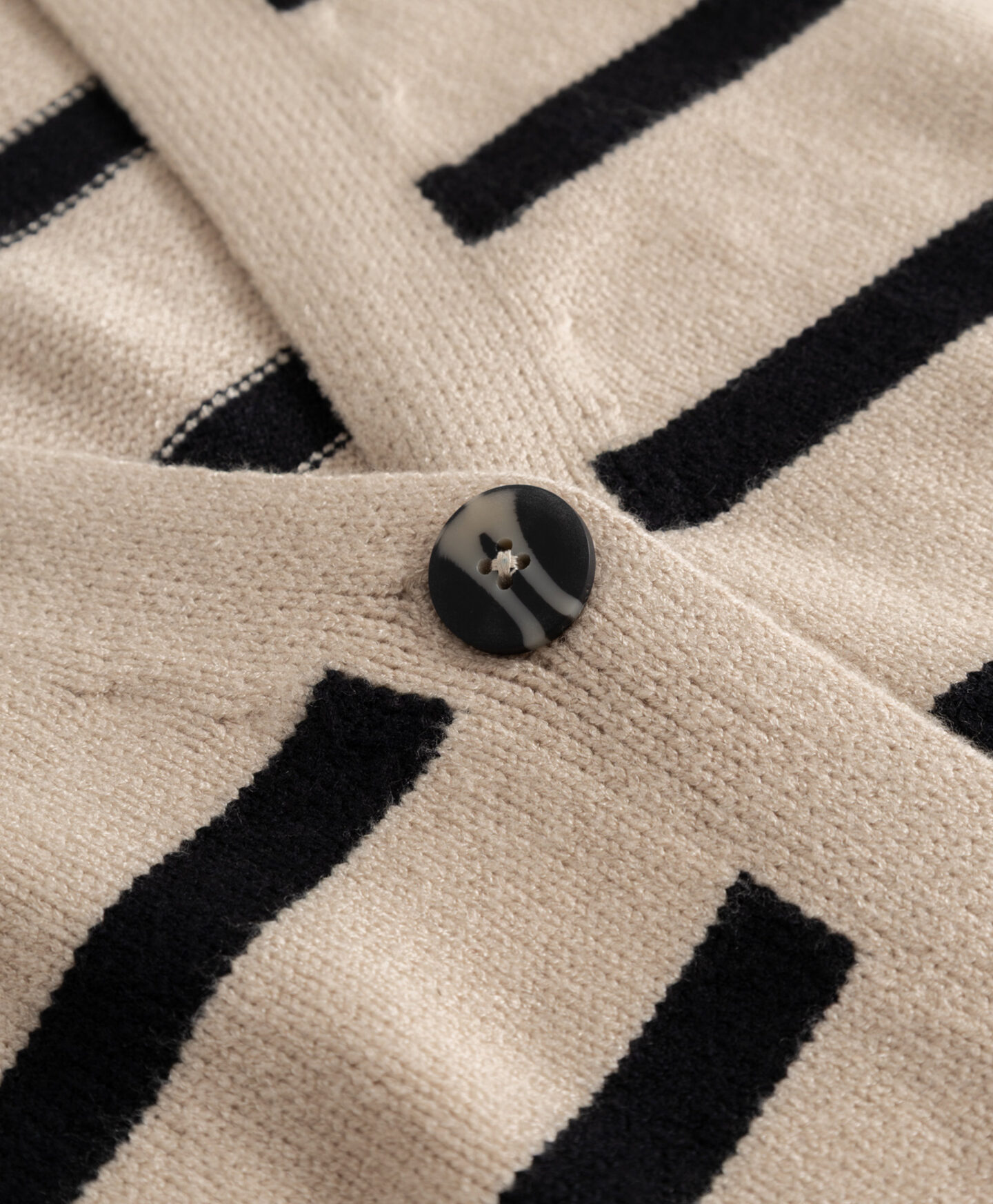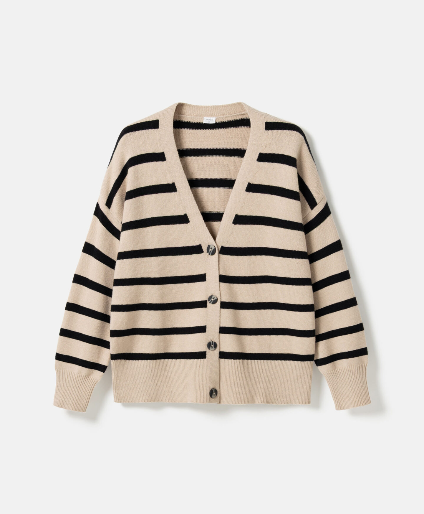 Kardigan za žene na crno-bež pruge, širokog kroja, idealan je izbor za sve koji vole udoban klasičan stil. Prugasti dezen nikada ne izlazi iz mode i odlično izgleda i uz elegantne pantalone i uz klasične farmerke. Mekani materijal sa viskozom nežno obavija kožu i pruža toplinu tokom hladnih zimskih dana. Proizvod je dostupan u dve boje.