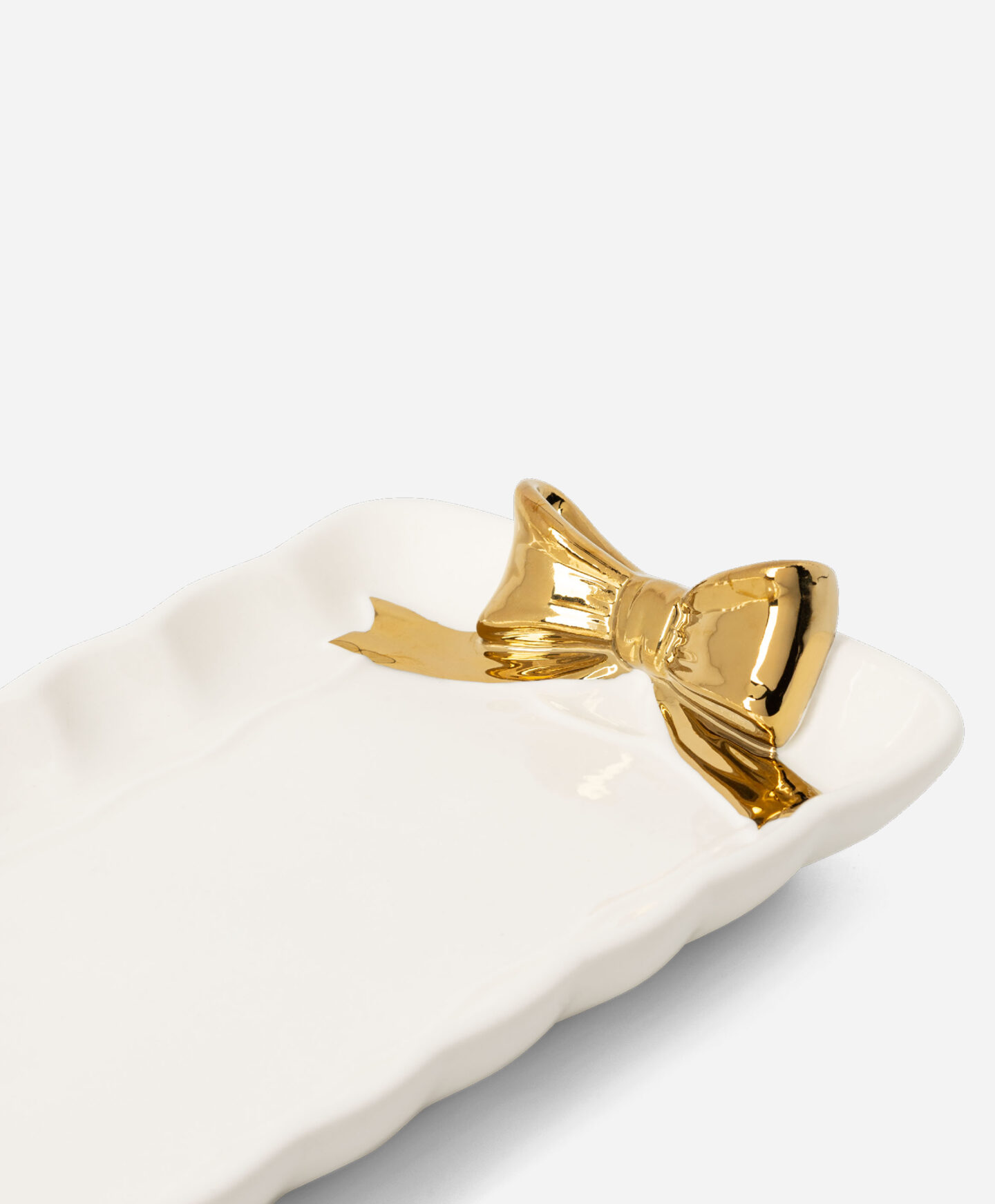 Keramički poslužavnik za tortu sa ukrasnim zlatnim mašnama je oličenje elegancije i dobrog stila. Napravljen od izdržljive keramike, ne samo da se lako čisti već i lepo izgleda na stolu. Sjajna završna obrada reflektuje svetlost, čineći tanjir centralnom tačkom aranžmana. Idealan je za serviranje kolača, voća ili grickalica gostima.