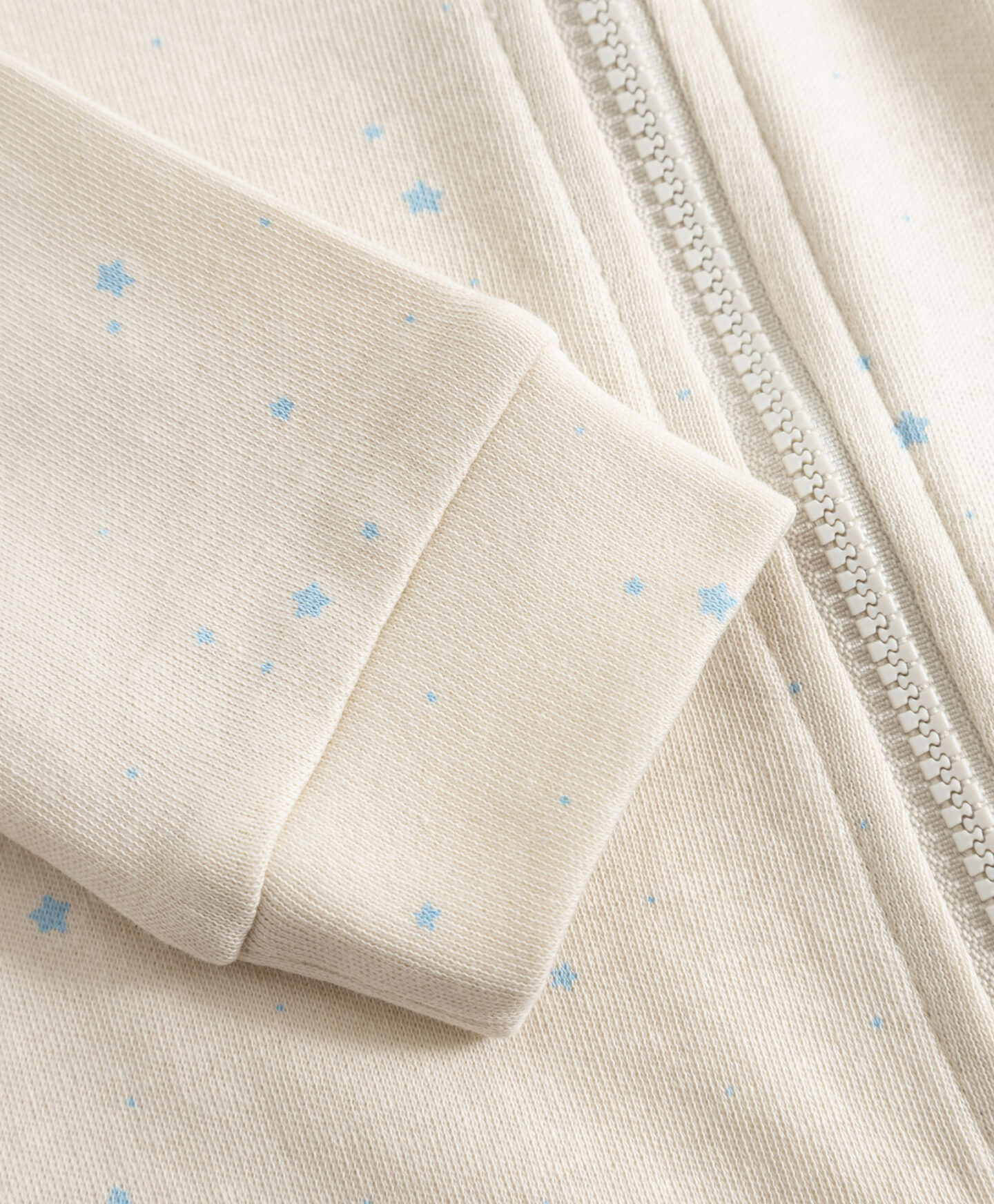 Kombinezon za bebe dečake od 100% organskog pamuka ima praktično kopčanje rajsferšlusom sa prednje strane, što oblačenje i presvlačenje čini brzim i jednostavnim. Dugi rukavi i nogavice nežno prate telo, pružajući toplinu i udobnost pri svakom pokretu. Suptilan motiv zvezdica unosi dozu šarma u vaše zajedničke trenutke.