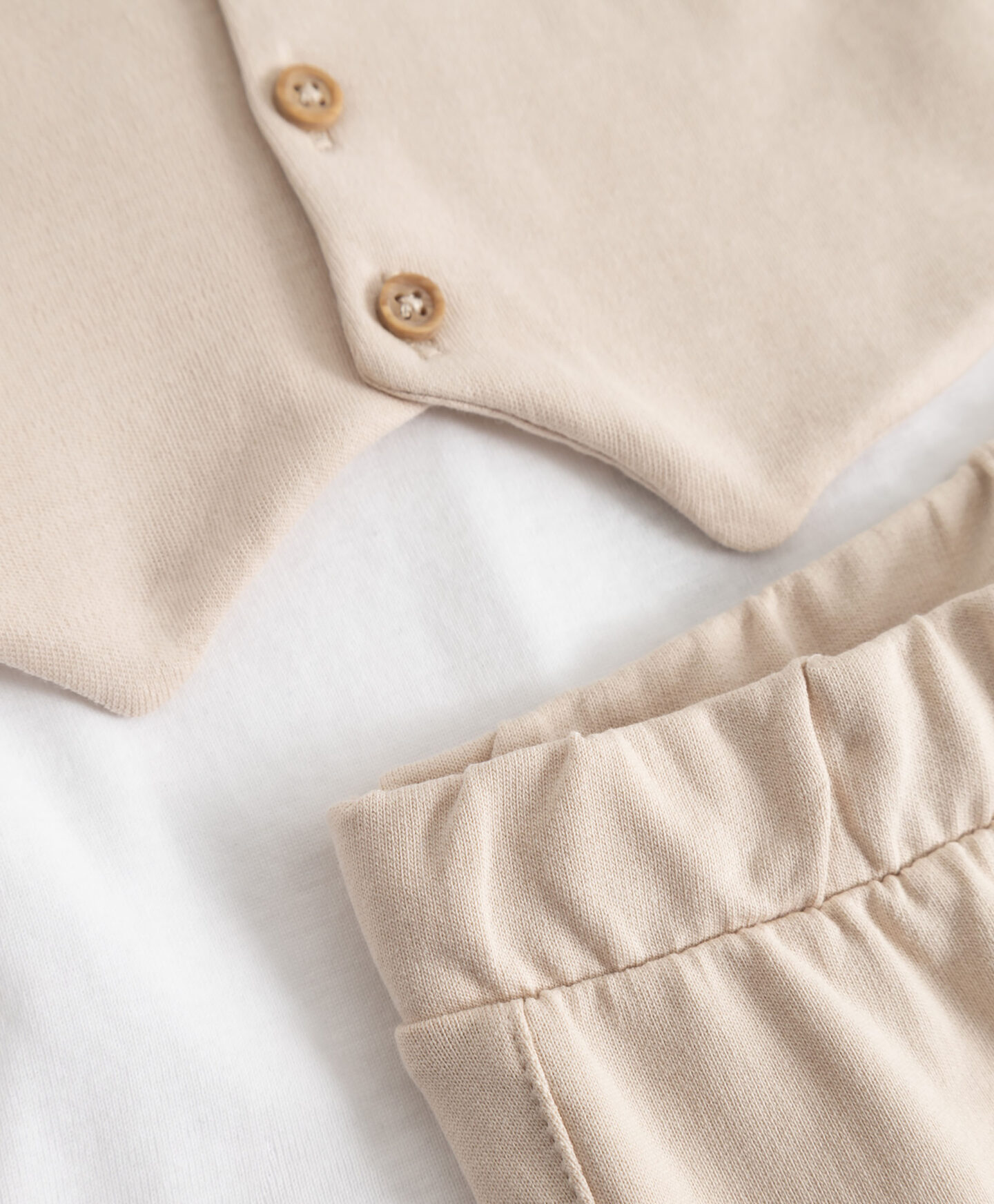 Komplet za dečake sadrži bodi sa prslukom i pantalone. To je spremna kombinacija za posebne prilike. Mekani materijal pruža prijatan osećaj na koži, a istovremeno garantuje udobnost i slobodu pokreta. Kopčanje na drikere olakšava oblačenje bodija, pa je promena pelena brza i jednostavna. Pantalone sa elastičnim pojasom savršeno se prilagođavaju malom stomaku.