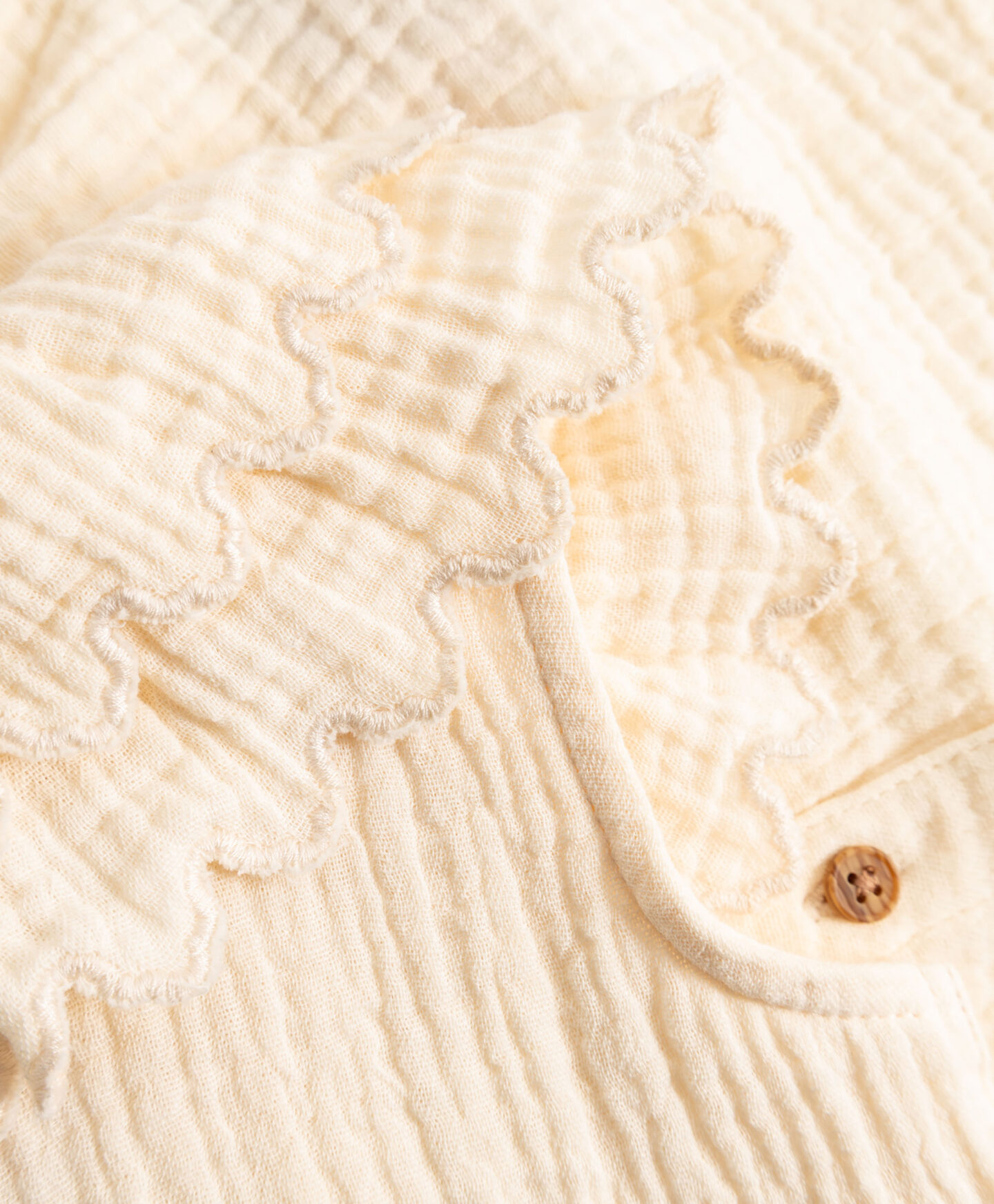 Košulja za bebe devojčice 100% pamuk, izrađena od prirodnog, prozračnog pamučnog muslina, izuzetno je nežna i mekana, idealna za osetljivu bebinu kožu. Dva slatka volana stvaraju nežan i moderan dizajn, savršen za posebne prilike. Udoban kroj i prijatan materijal pružaju maksimalnu udobnost tokom nošenja. Košuja se može kombinovati sa šortsem iz iste kolekcije i zajedno čine usklađen komplet.