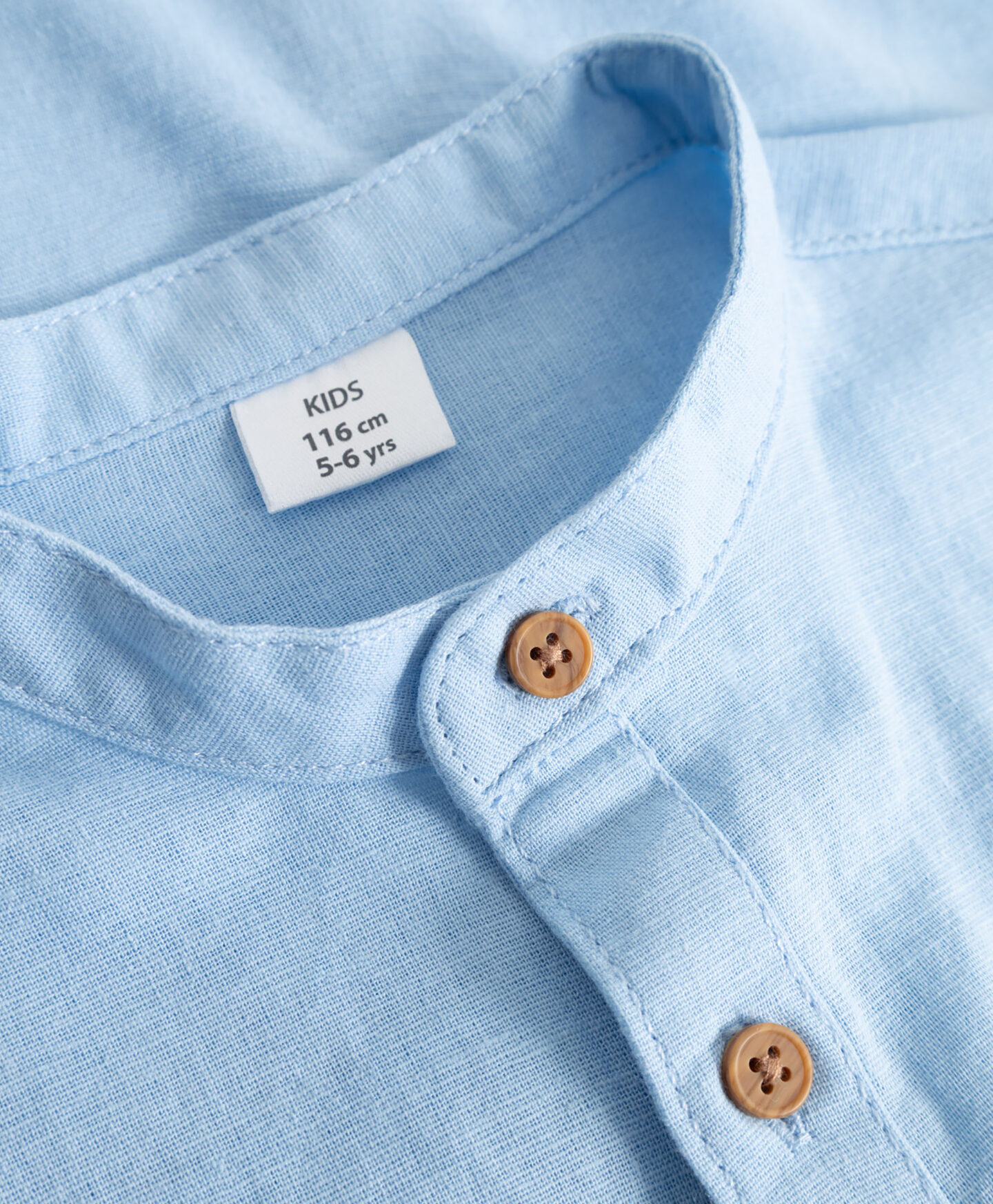 Ova košulja za dečake u svetloj teksas nijansi savršen je izbor za porodična okupljanja. Dodatak lana obezbeđuje prozračnost i prijatan osećaj tokom nošenja. Braon dugmići i mala kragna u kontrastu sa plavom bojom daju košulji formalniji i moderan izgled. Praktična dugmad na rukavima omogućavaju lako zavrtanje i zakopčavanje, čime se stil može prilagoditi ležernijim kombinacijama.