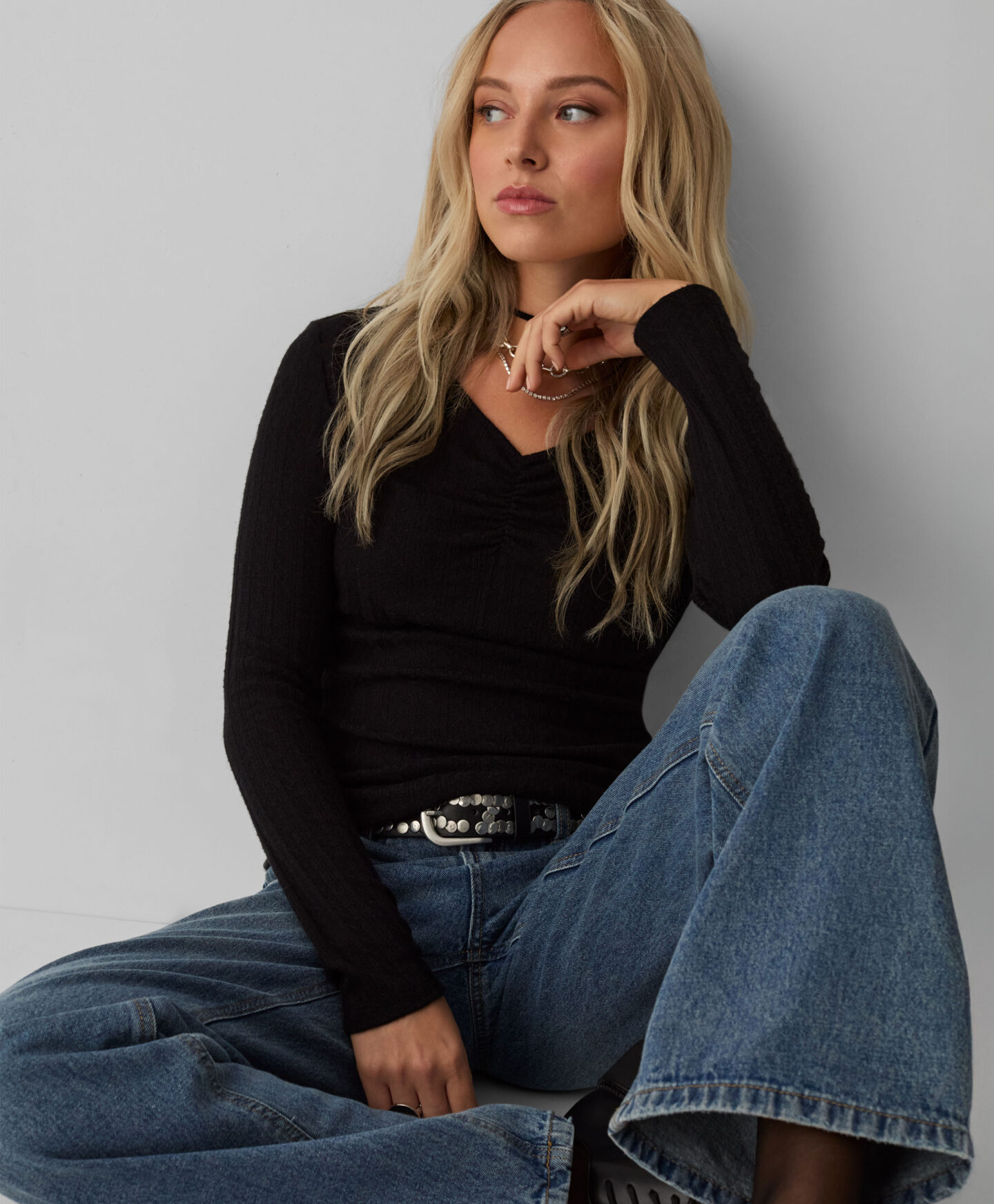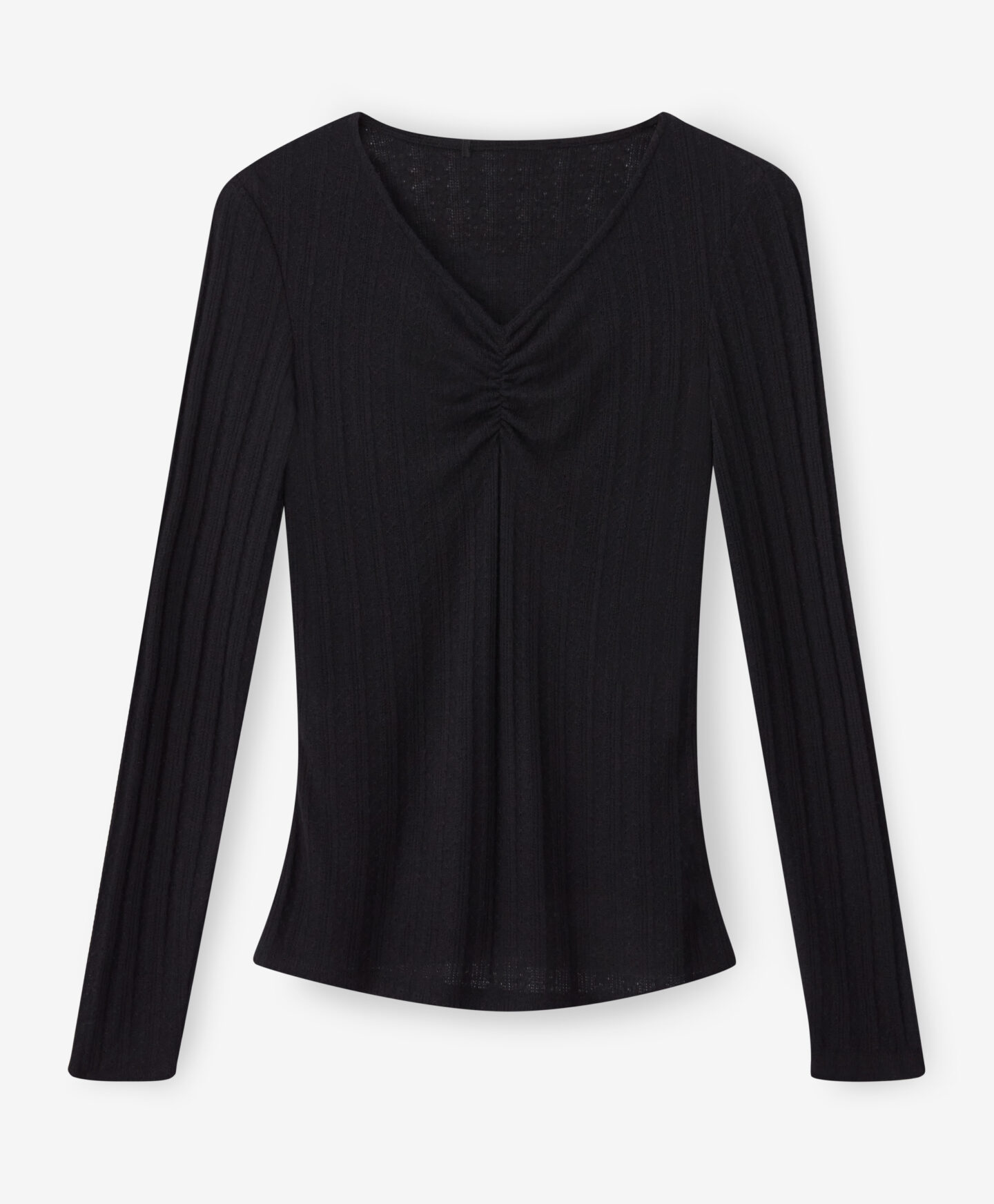 Majica sa dugim rukavima i naborima za žene namenjena je svim ženama koje vole klasičan stil. Odlično će poslužiti ispod ležernijeg sakoa ili džempera tokom hladnih dana, pružajući dodatni sloj topline. Nabor na dekolteu je ženstveni akcenat koji ističe figuru. Crna boja čini ovu majicu pogodnim za kombinovanje sa praktično svim.