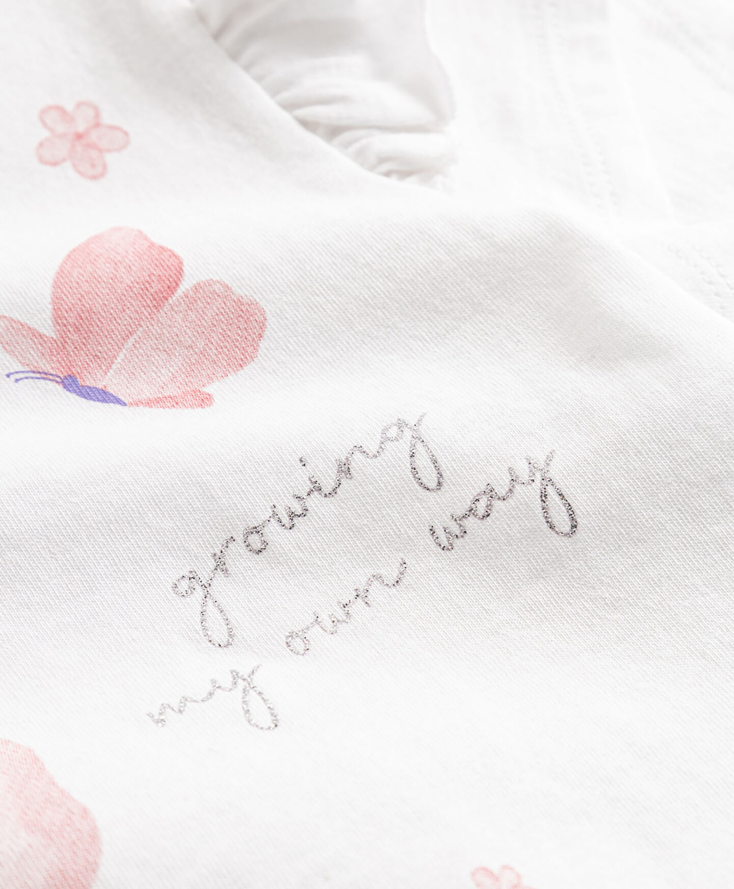 Ova majica sa motivom leptira od 100% pamuka savršen je izbor za sve ljubiteljke ovih nežnih insekata. Prirodan pamuk pruža udobnost i visoku prozračnost tokom nošenja. Kratki rukavi idealni su za tople dane, dok šarmantni volani na rukavima daju lepršavu i ženstvenu notu. Savršeno se kombinuje sa lepršavim suknjama i pantalonama.