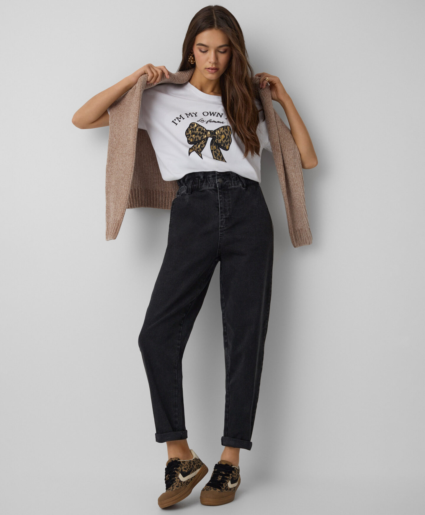 Majica za žene sa mašnom napravljena od 100% pamuka, savršena je i za svakodnevno nošenje i za posebne prilike. Materijal je prijatan za kožu i garantuje udobnost tokom celog dana. Mašna na prednjoj strani je suptilan, ali upečatljiv akcenat koji dodaje šarm svakoj odevnoj kombinaciji.