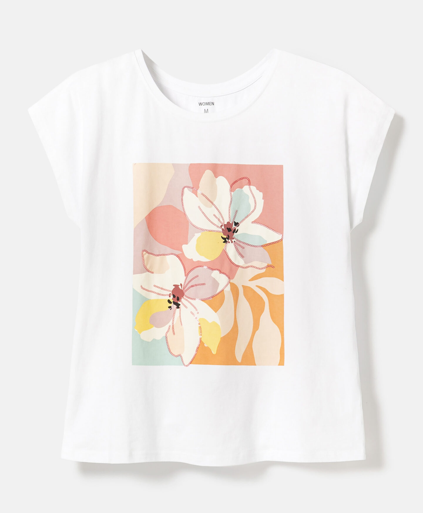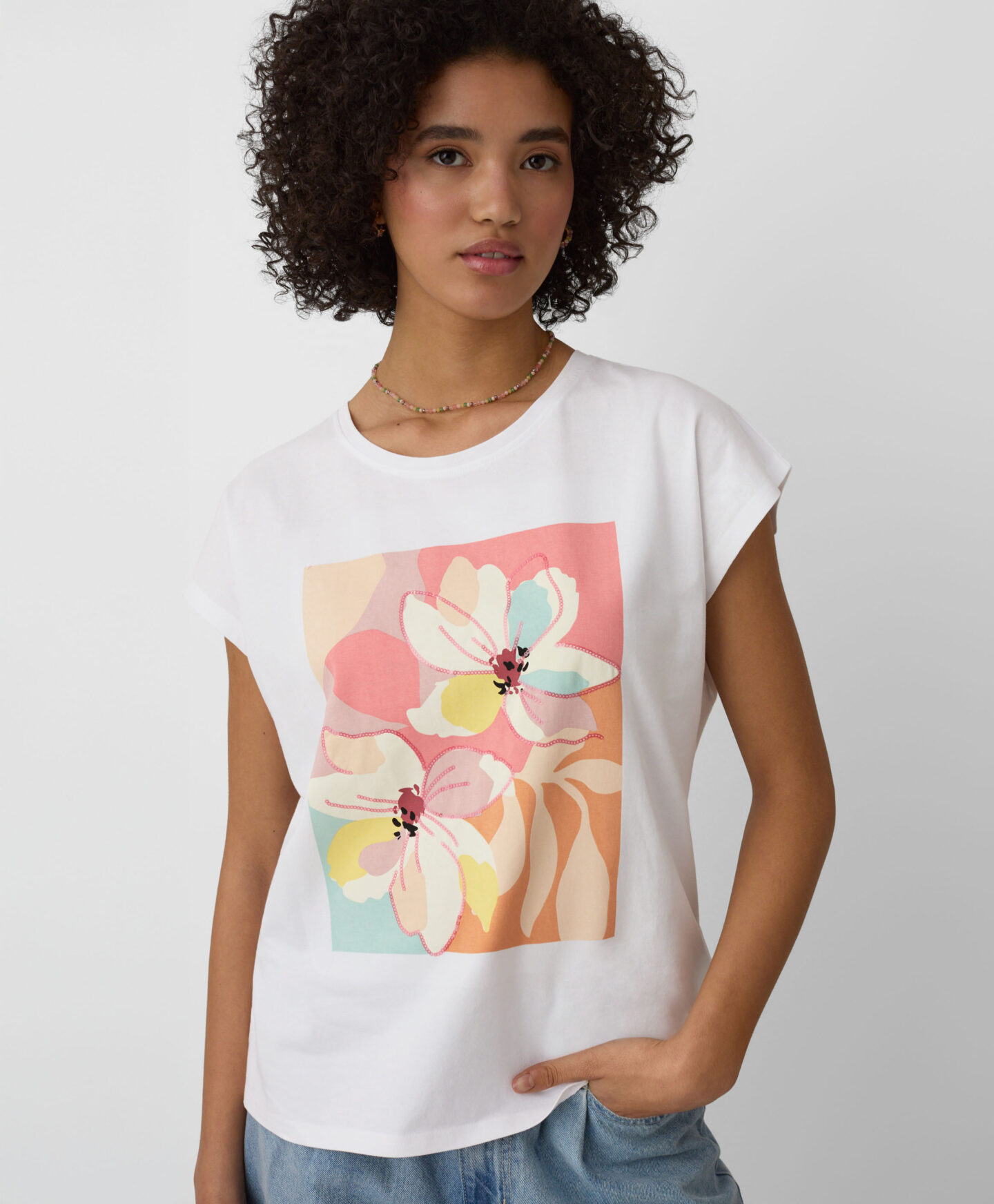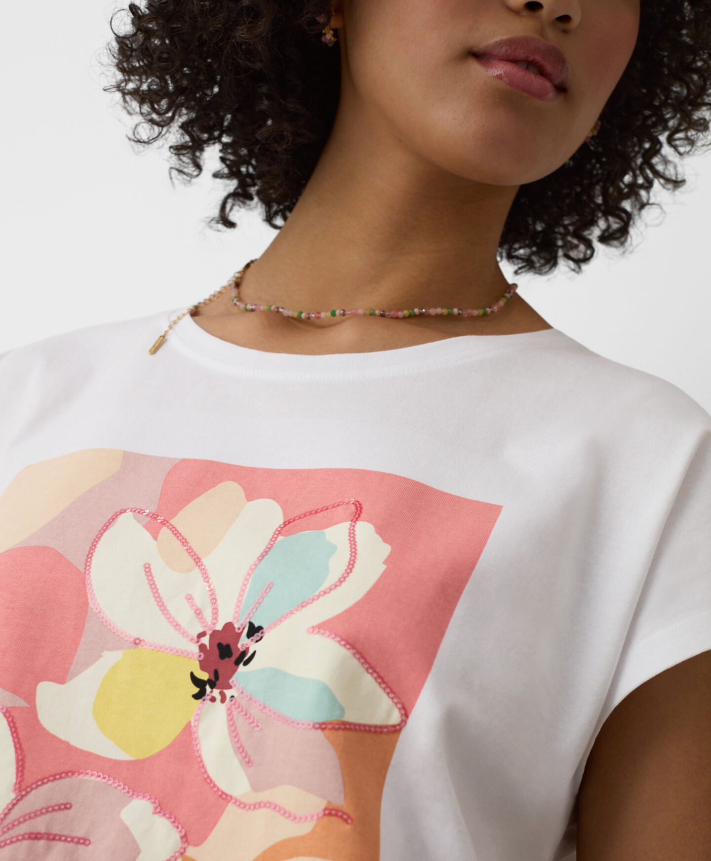Ova majica za žene sa visokim sadržajem pamuka i dodatkom elastina lepo pristaje uz telo. Print na prednjem delu sa cvetom ukrašenim šljokicama oduševiće sve ljubiteljke floralnih detalja. Majica je udobna, prozračna i omogućava koži da diše. Savršena je za kombinovanje uz omiljene farmerke, trenerku ili elegantne cigaret pantalone.