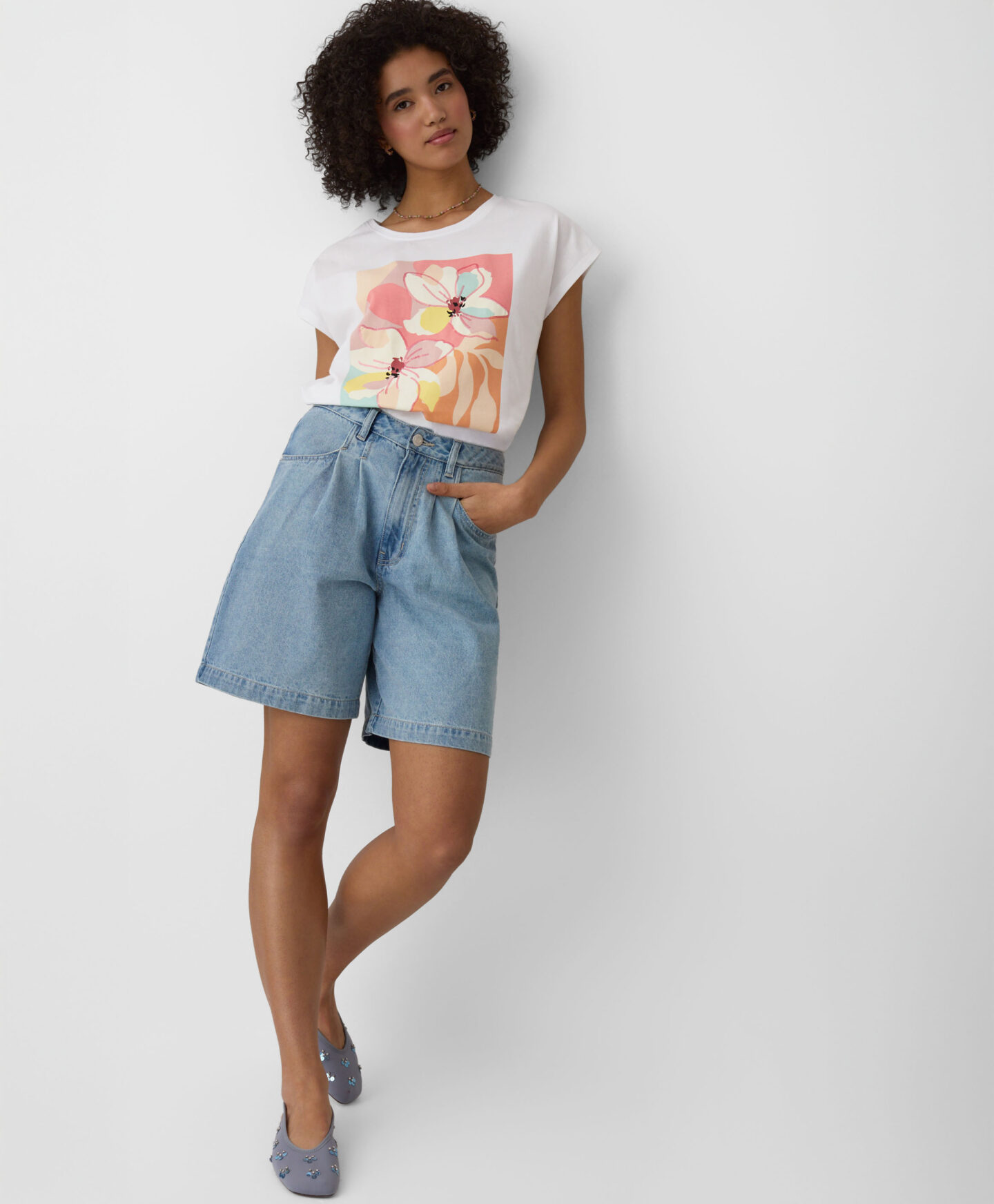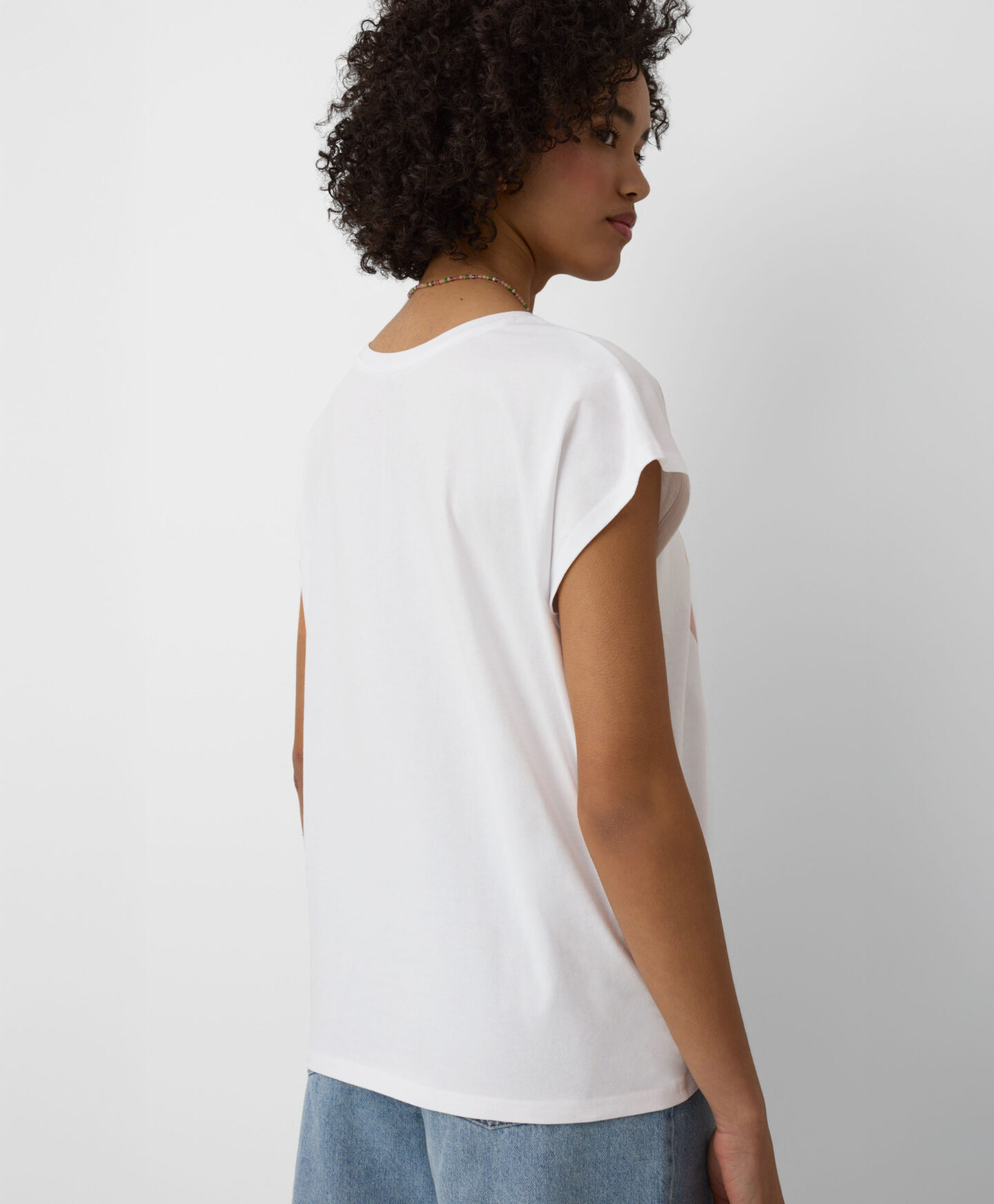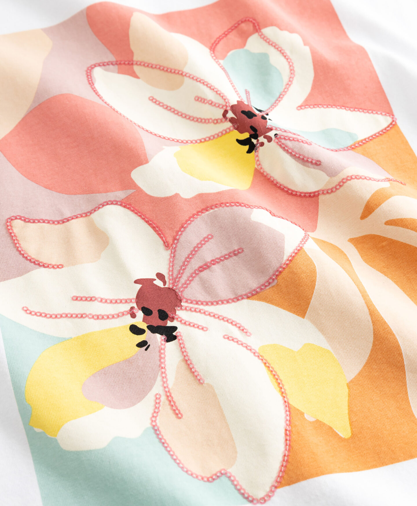 Ova majica za žene sa visokim sadržajem pamuka i dodatkom elastina lepo pristaje uz telo. Print na prednjem delu sa cvetom ukrašenim šljokicama oduševiće sve ljubiteljke floralnih detalja. Majica je udobna, prozračna i omogućava koži da diše. Savršena je za kombinovanje uz omiljene farmerke, trenerku ili elegantne cigaret pantalone.