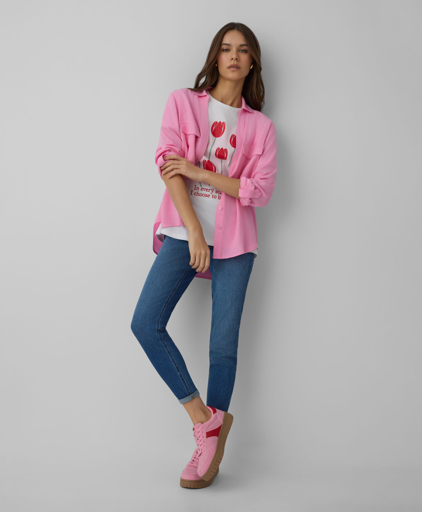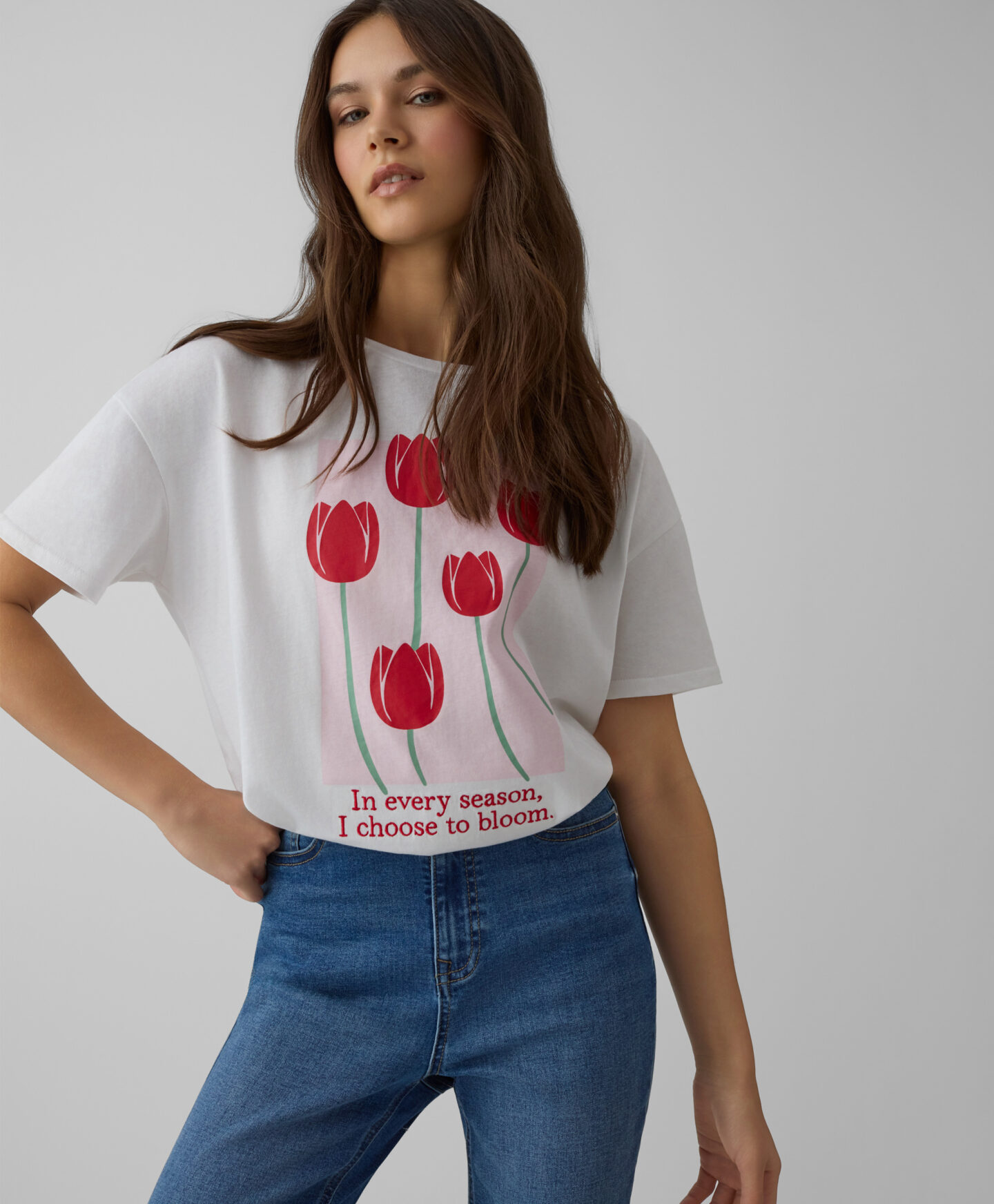Majica za žene sa cvetnim motivom 100% pamuk, odličan je izbor za svakodnevno nošenje. Univerzalna je i lako se uklapa u različite kombinacije. Mekana i prozračna tkanina pruža udobnost pri nošenju, a šarmantan cvetni print na prednjem delu dodaje svežinu svakoj kombinaciji.