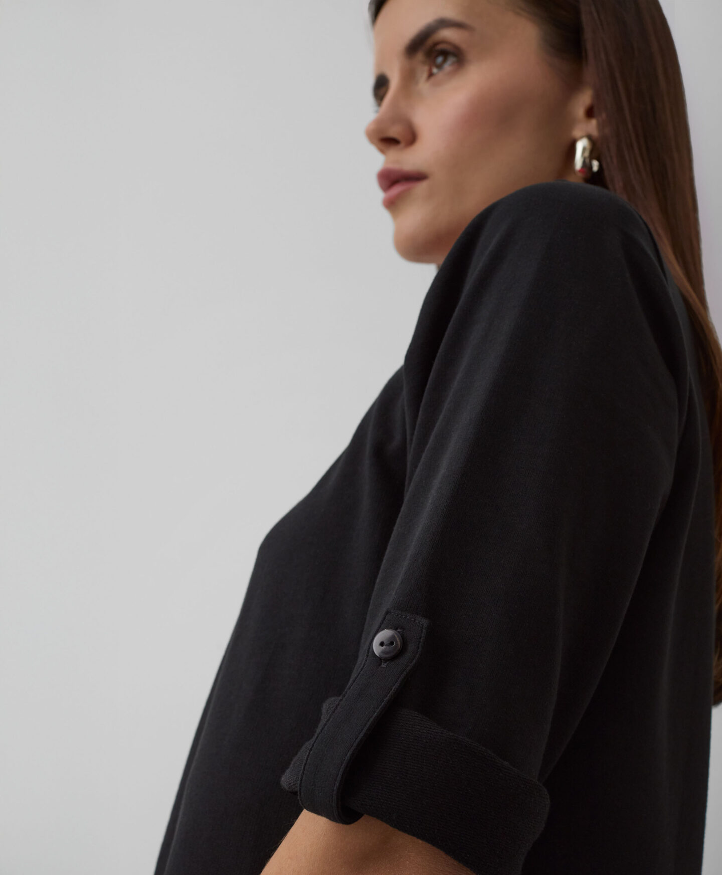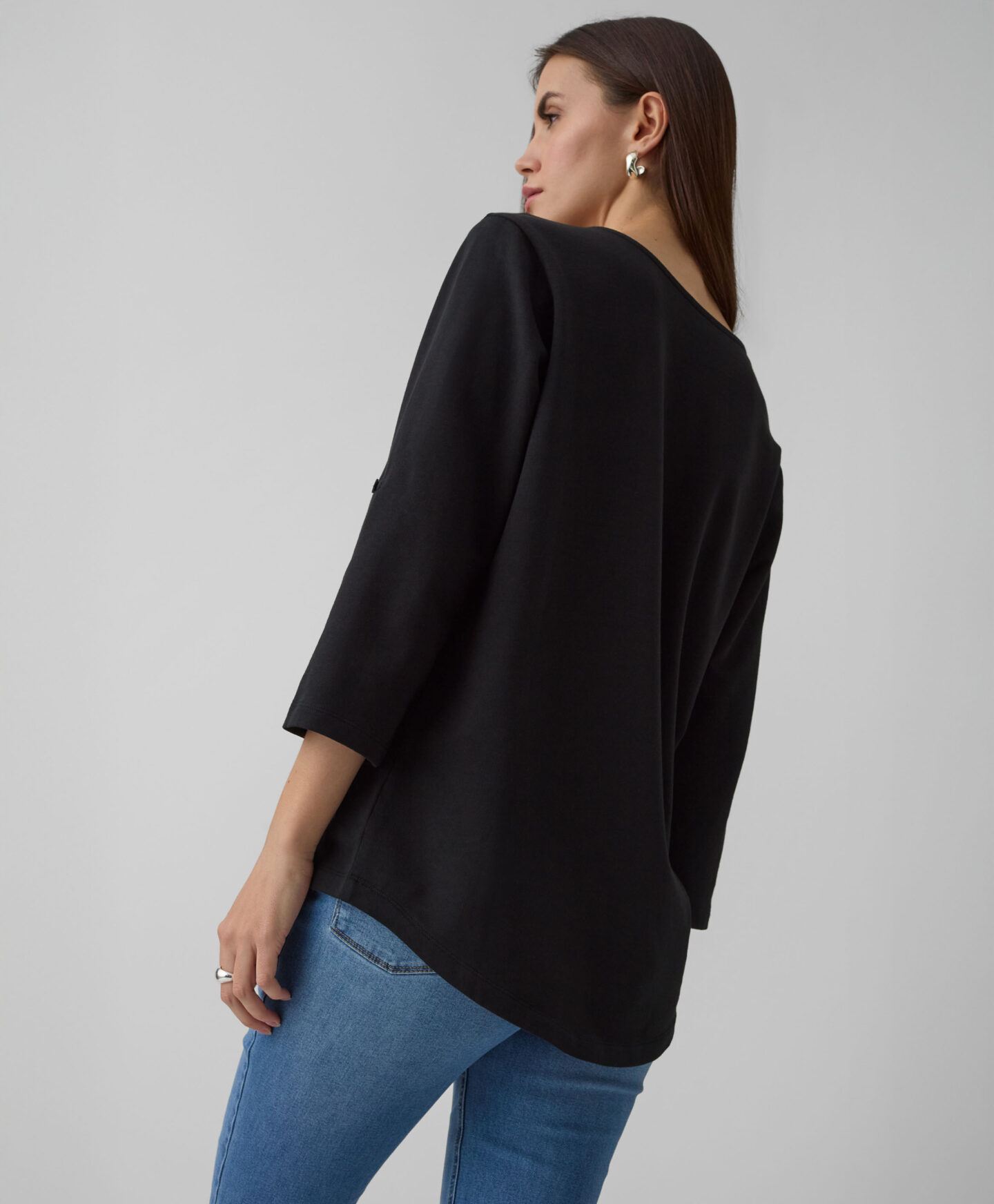 Majica za žene sa zaobljenim porubom i podvrnutim rukavima donosi klasičan kroj sa modernim detaljem. Univerzalna crna boja i mekani materijal sa visokim sadržajem pamuka učiniće da vam ova majica postane omiljena! Izgleda odlično u kombinaciji sa vašim omiljenim farmerkama, elegantnim ili sportskim pantalonama. Idealna je za šetnju vikendom uklopljena sa prslukom, u kancelariji ispod sakoa, ali i u kombinaciji sa mekom bluzom tokom opuštanja kod kuće.