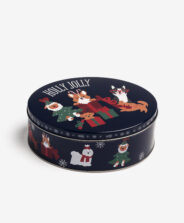 Okrugla limena kutija se ističe svojom teget bojom i veselim prazničnim motivom. Savršena je za čuvanje slatkiša, ali i malih poklona, ili kao poklon pakovanje. Sa njom, čak i mali gest dobija magični karakter. U ponudi su dostupni različiti dezeni.
