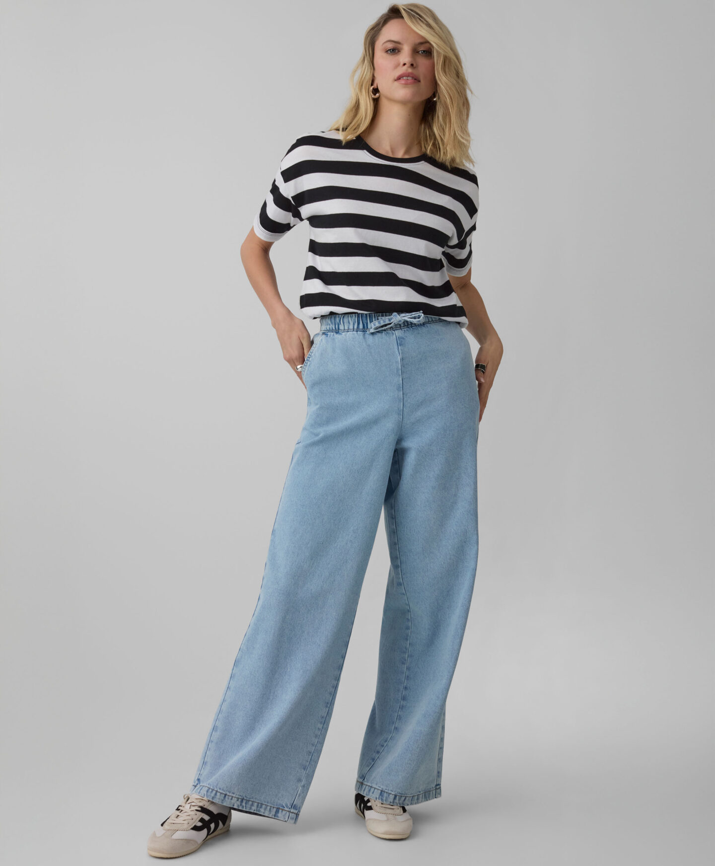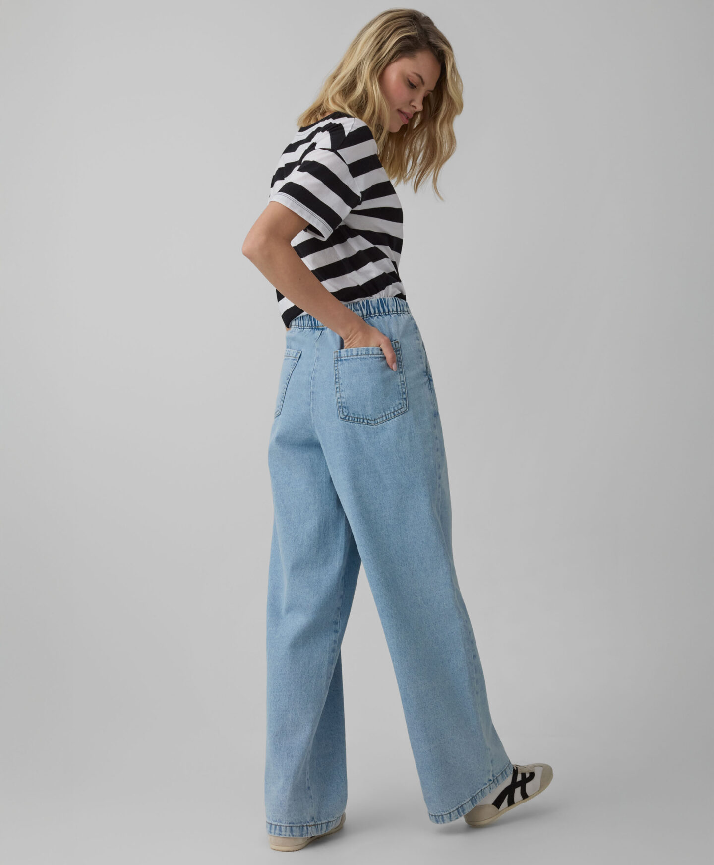 Farmerke za žene sa elastičnim pojasom imaju moderne široke nogavice. Nude slobodu pokreta, udobnost i elegantan izgled. Možete ih uklopiti i sa majicom i sa košuljom. Izgledaju sjajno kako tokom opuštanja kod kuće, tako i u šetnji na svežem vazduhu ili tokom kupovine.