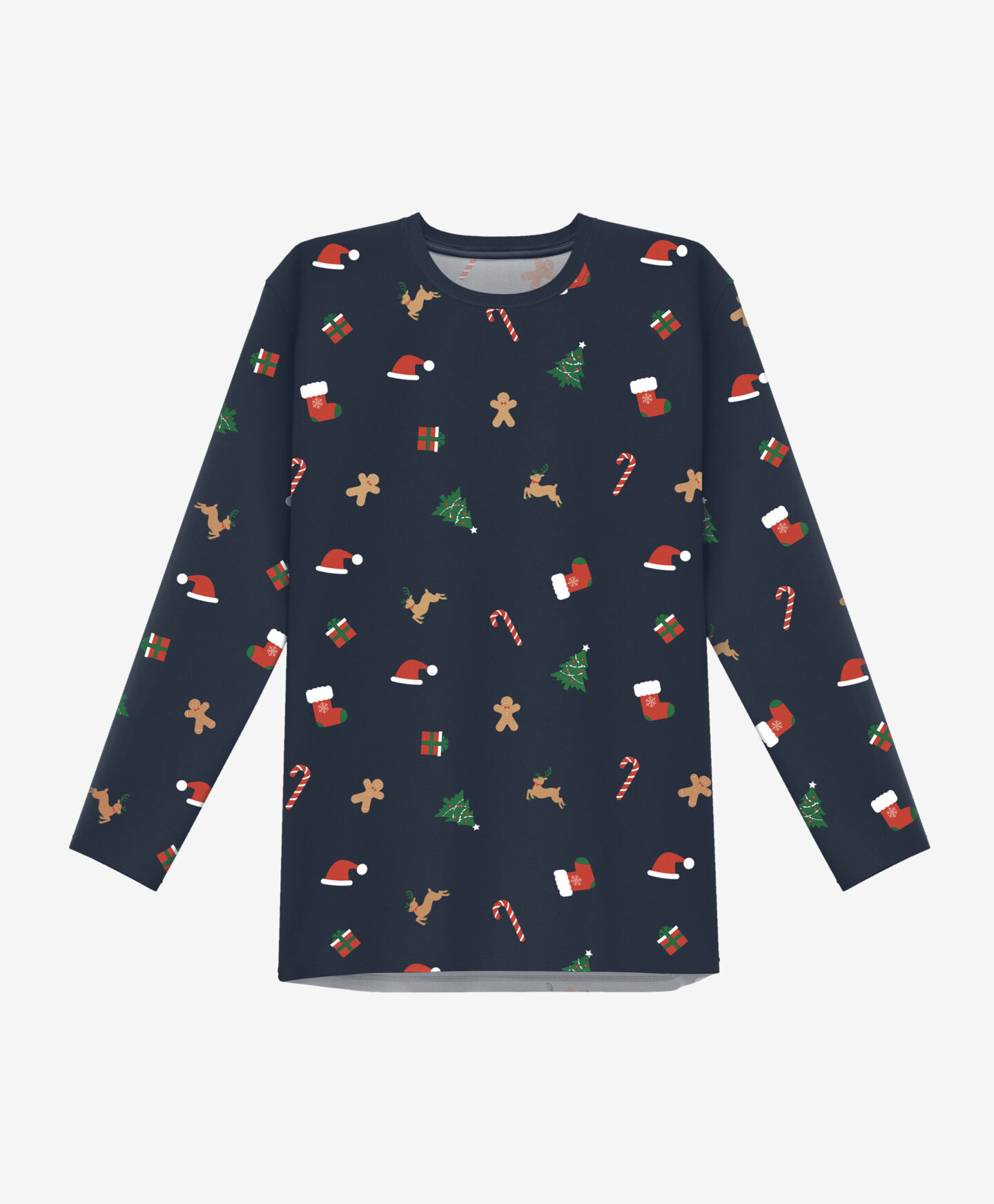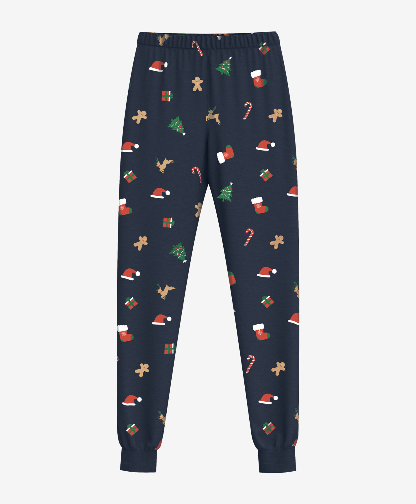 Ovaj komplet pidžame za muškarce sa prazničnom tematikom sastoji se od majice dugih rukava i pantalona. Tamna teget plava boja je naglašena prazničnim uzorkom poklona, jelki, medenjaka i štapića od šećera. To je savršen praznični poklon za ljubitelje slatkih uživanja. Dostupne su i pidžame za dečake.