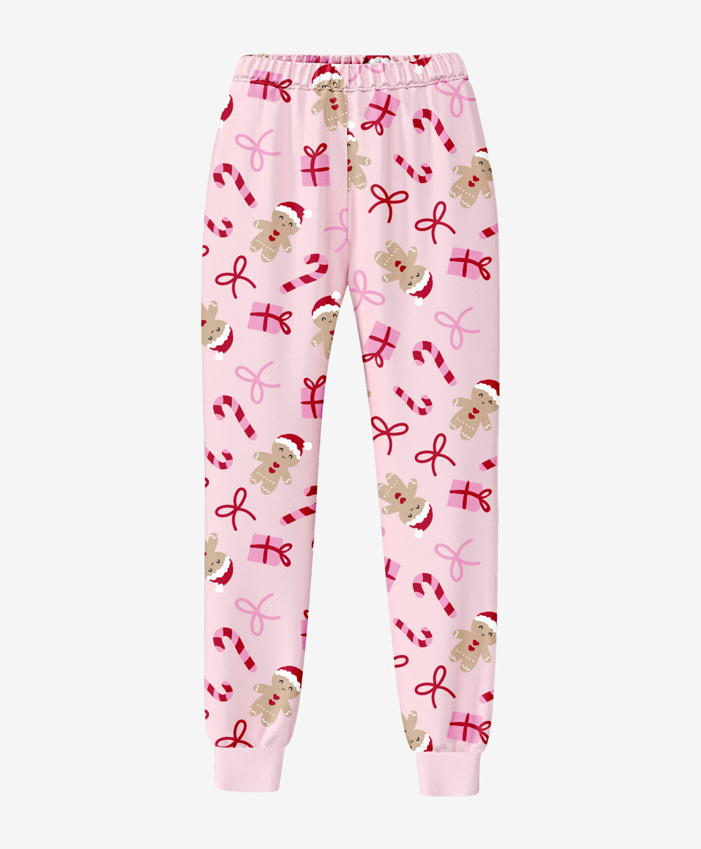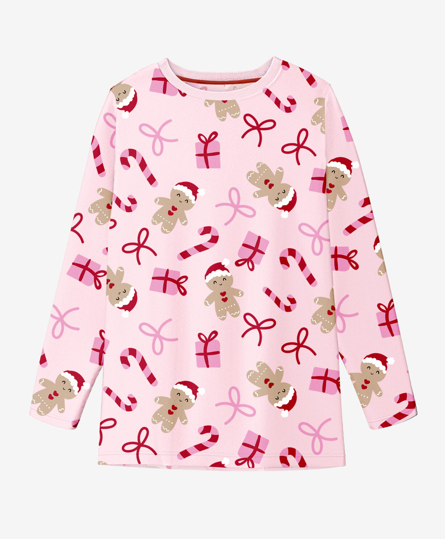 Pidžama od pliša za žene sa prazničnim dezenom medenjaka, poklona i mašne je odlična ideja za poklon. Komplet se sastoji od košulje dugih rukava i pantalona od mekog, toplog pliša, što ga čini savršenim za zimske noći.
