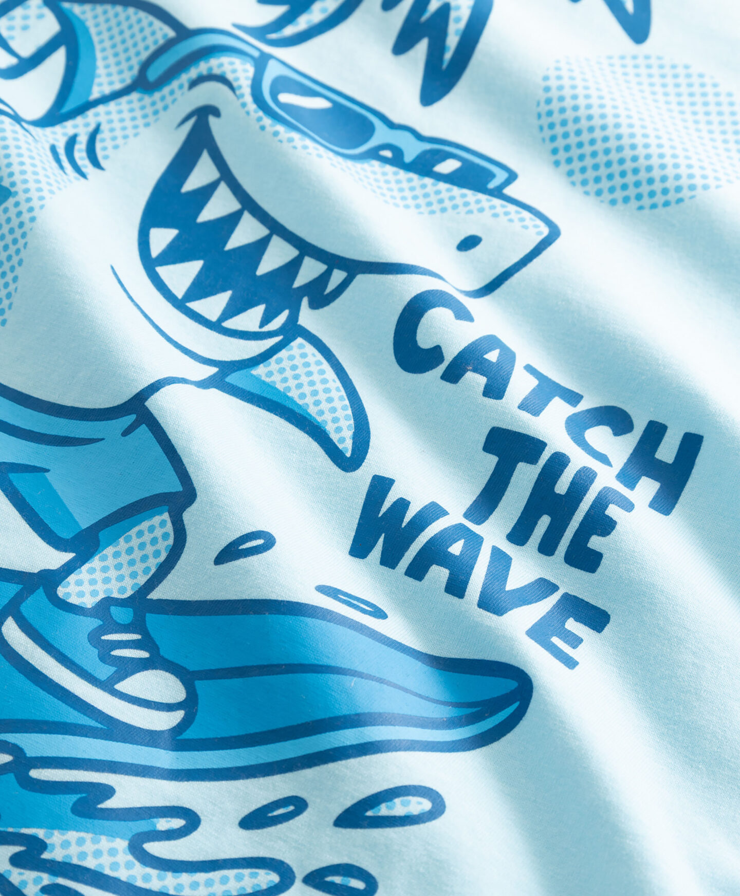 Plava majica za dečake od 100% pamuka pravi je hit ove sezone. Pamuk omogućava koži da diše čak i tokom najintenzivnije igre na suncu. Materijal je mekan i izdržljiv. Upečatljiv motiv na prednjoj strani nikada ne izlazi iz mode!