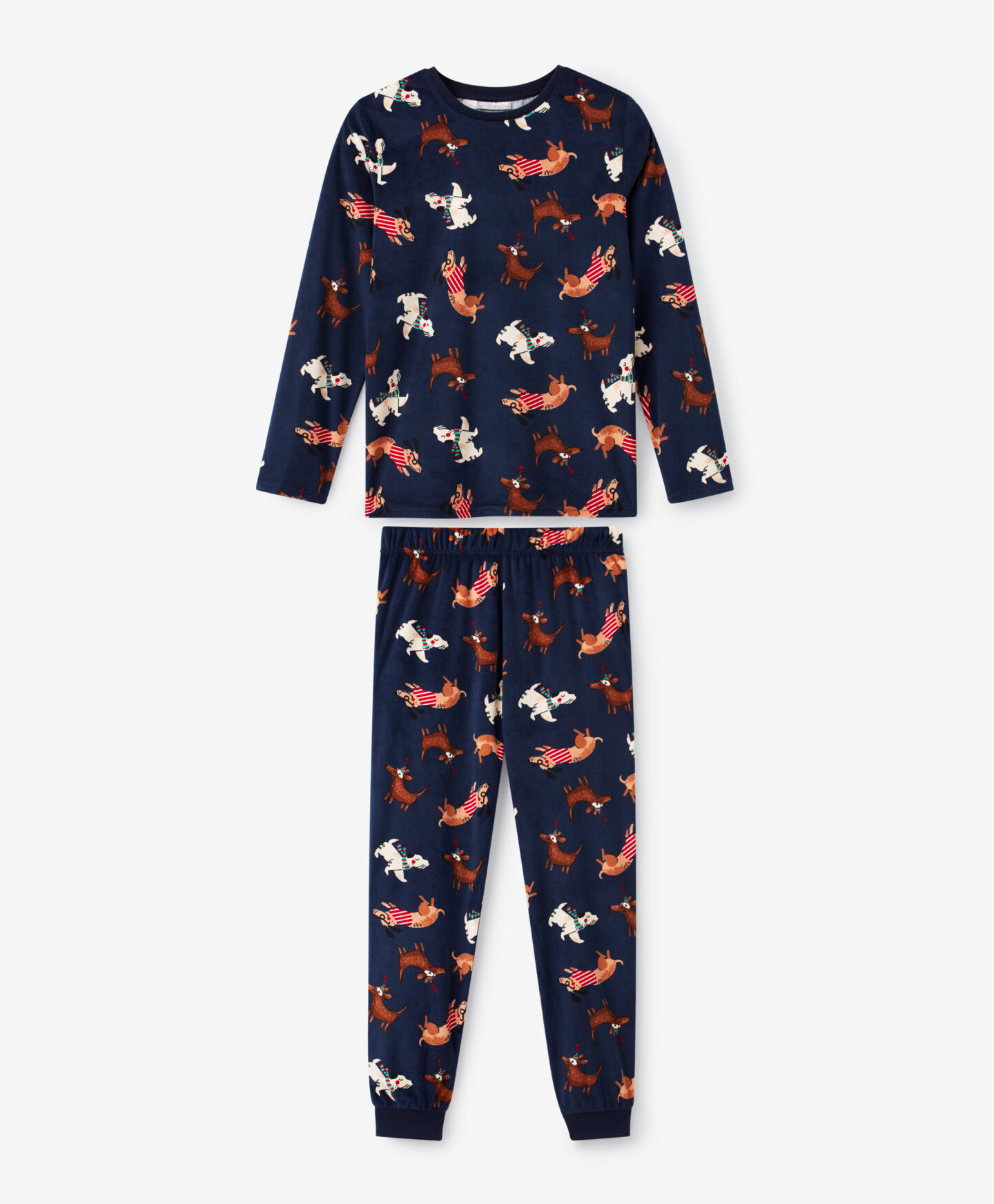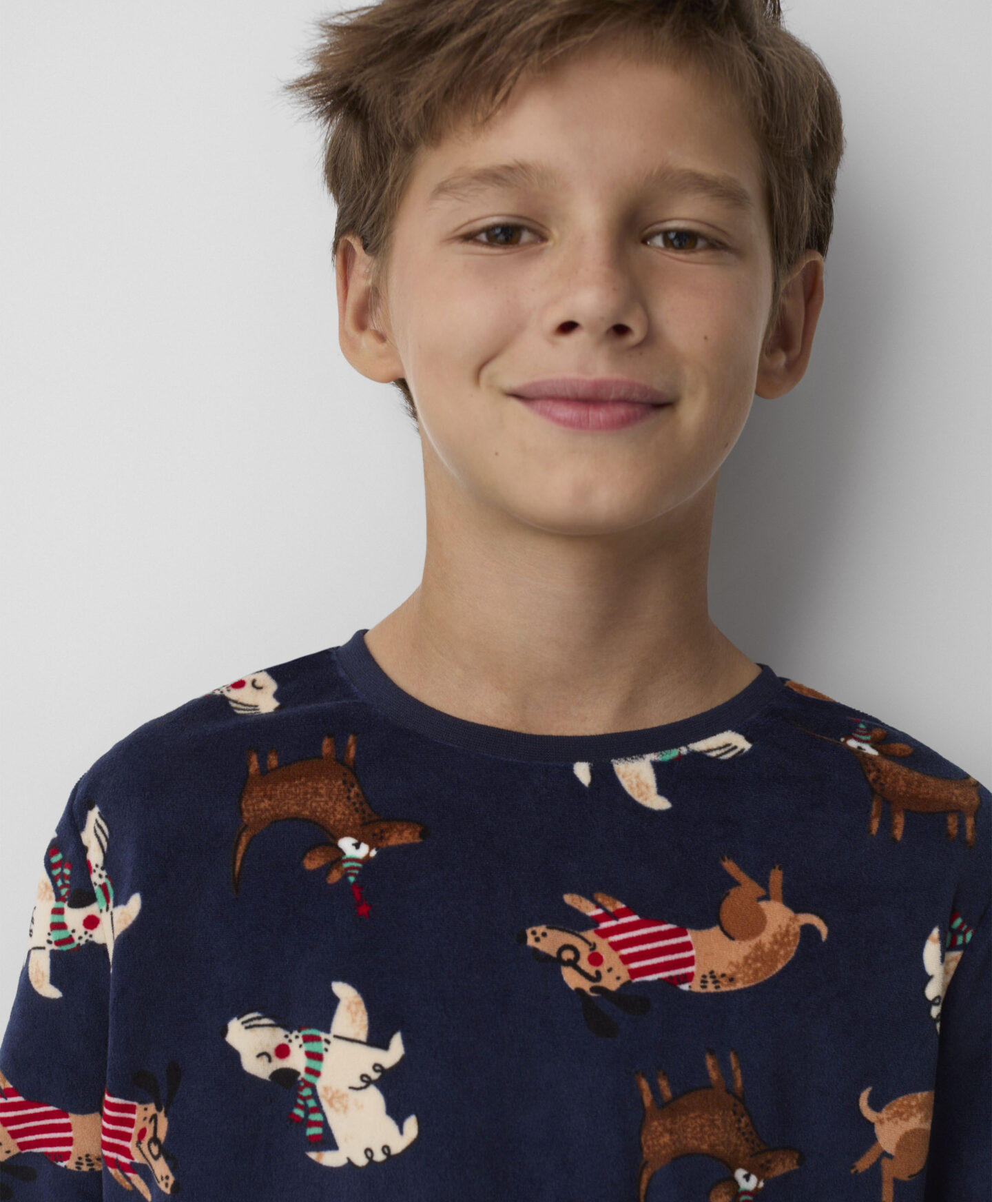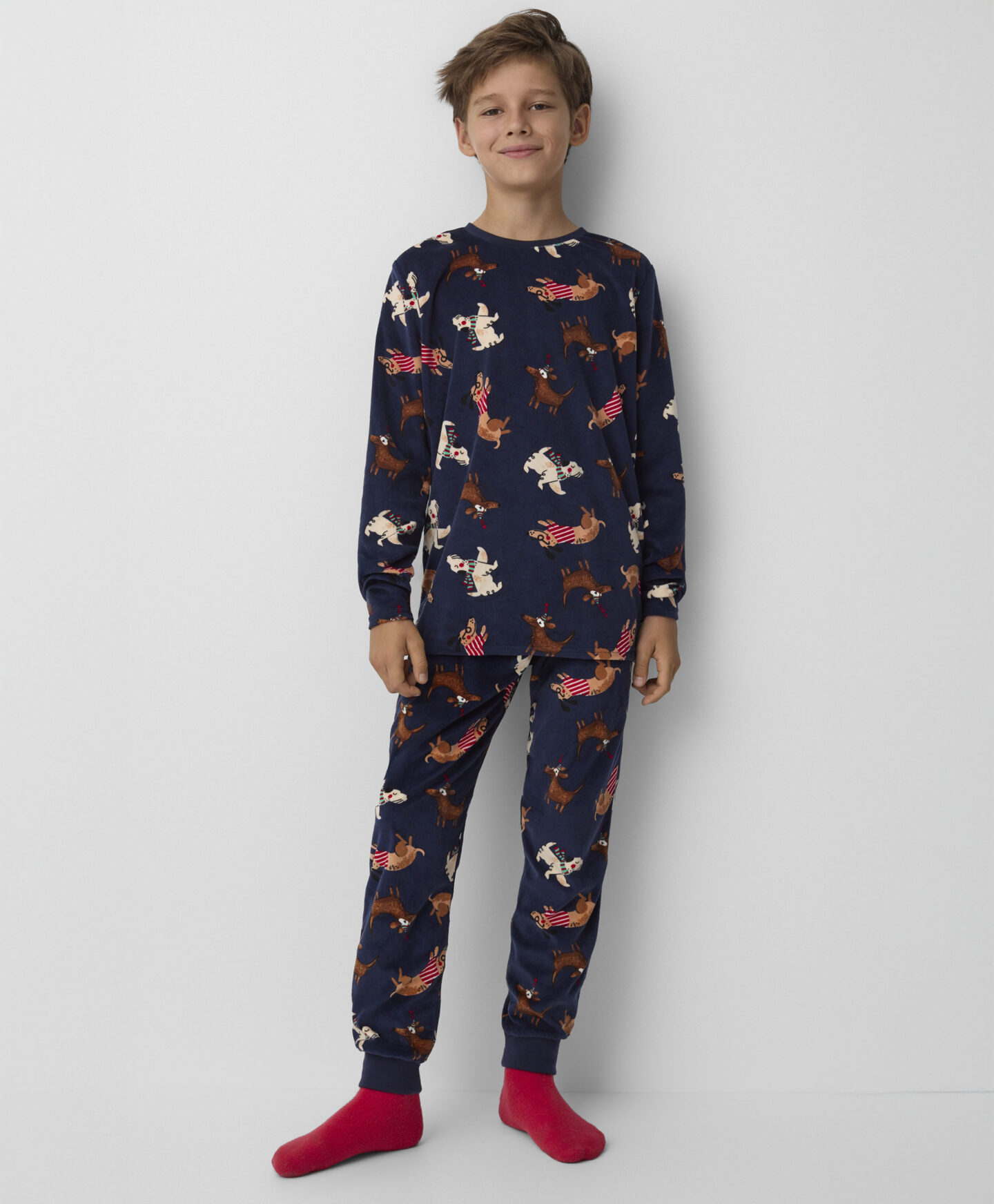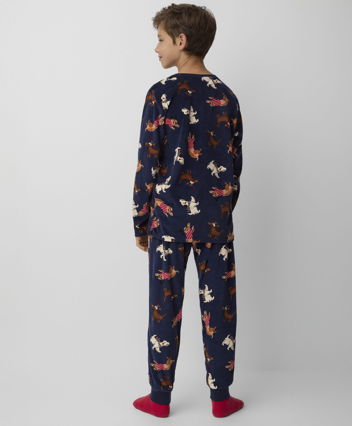 Plišana pidžama za dečake sa dezenom pasa obezbeđuje udobnost za spavanje i slobodu kretanja. Napravljena od mekog i prijatnog pliša, idealna je za hladnije noći. Garantuje toplinu i udobnost. Razigrani dezen sa motivima pasa učiniće da je svaki dečak poželi obući pre spavanja.
