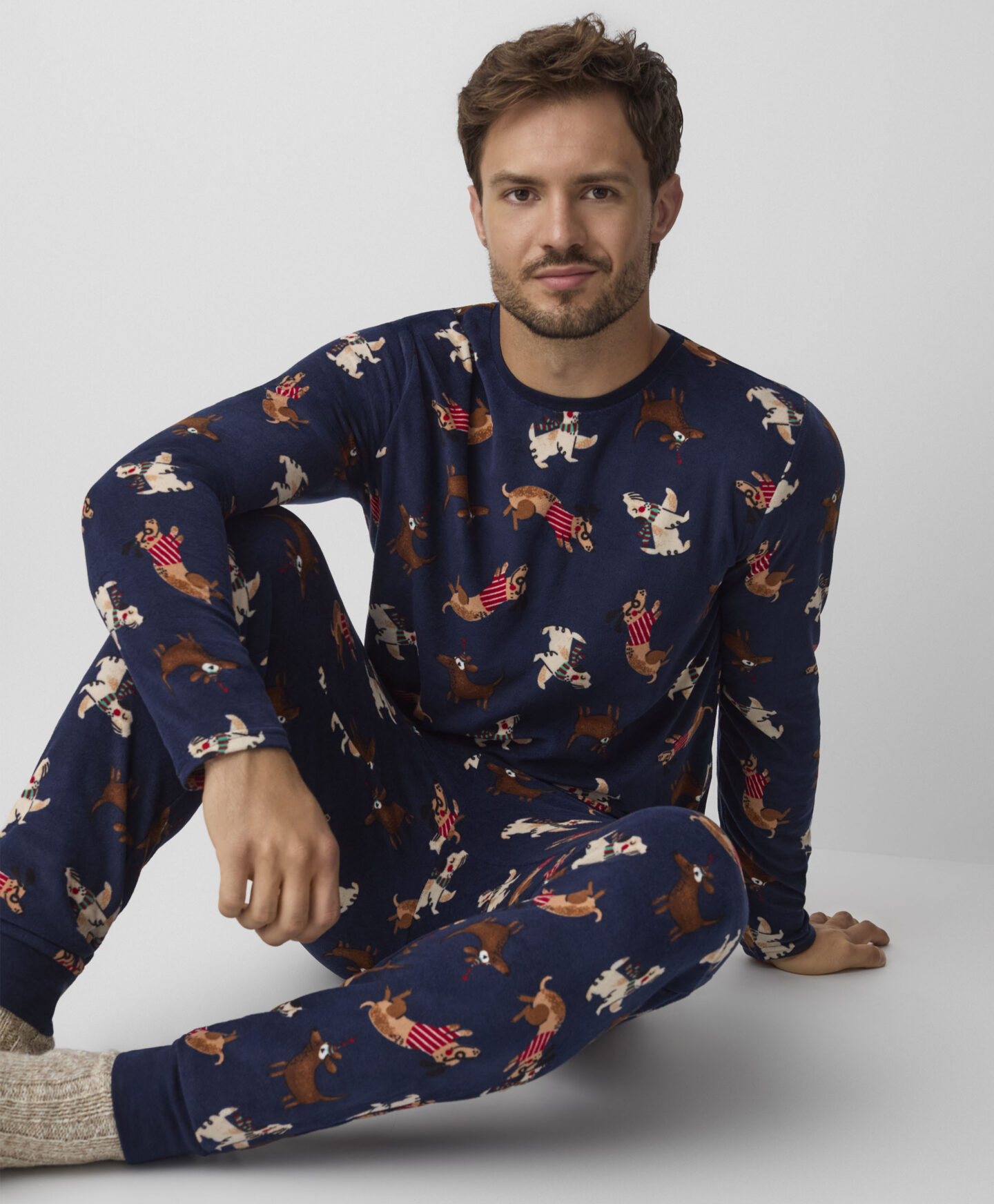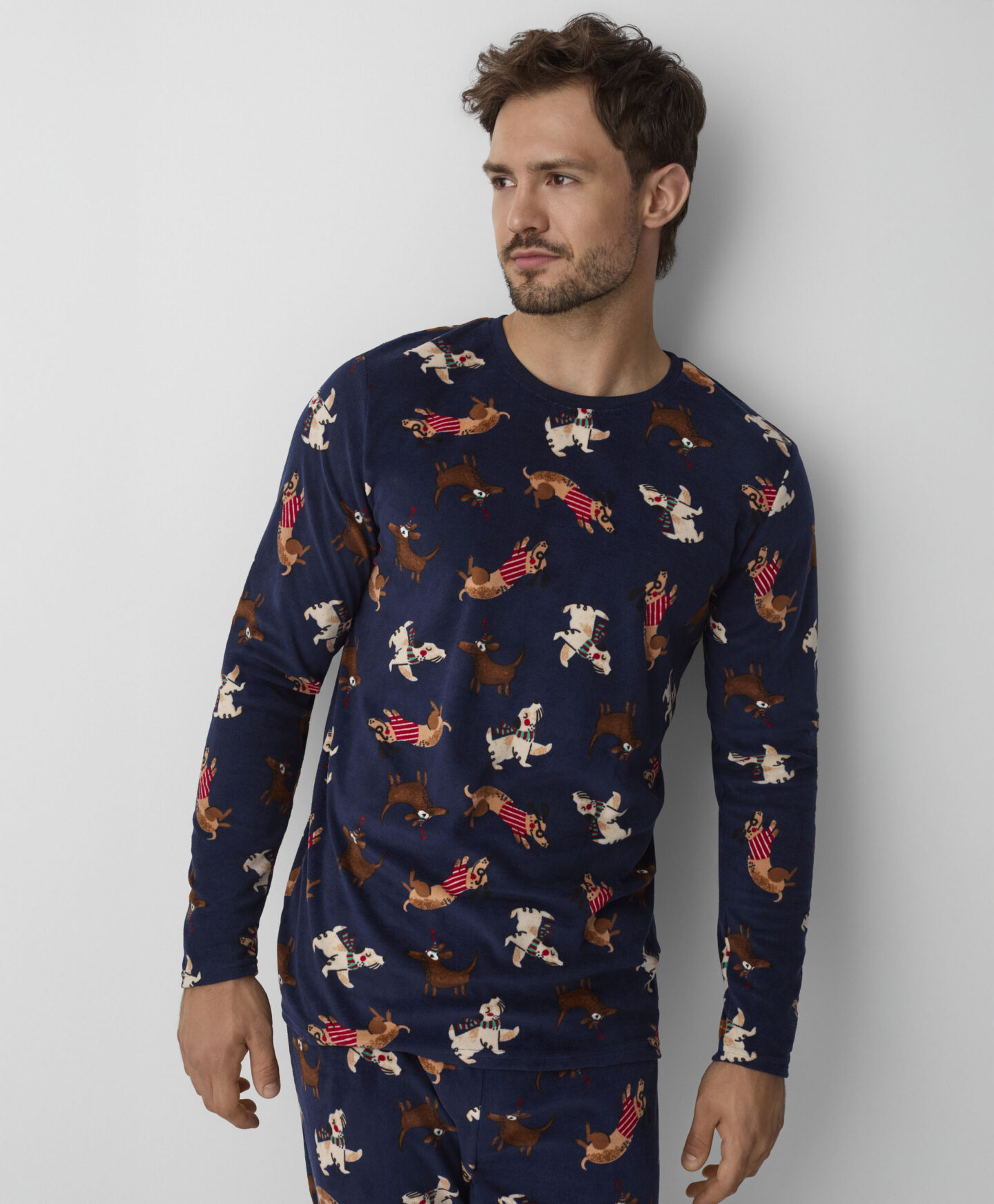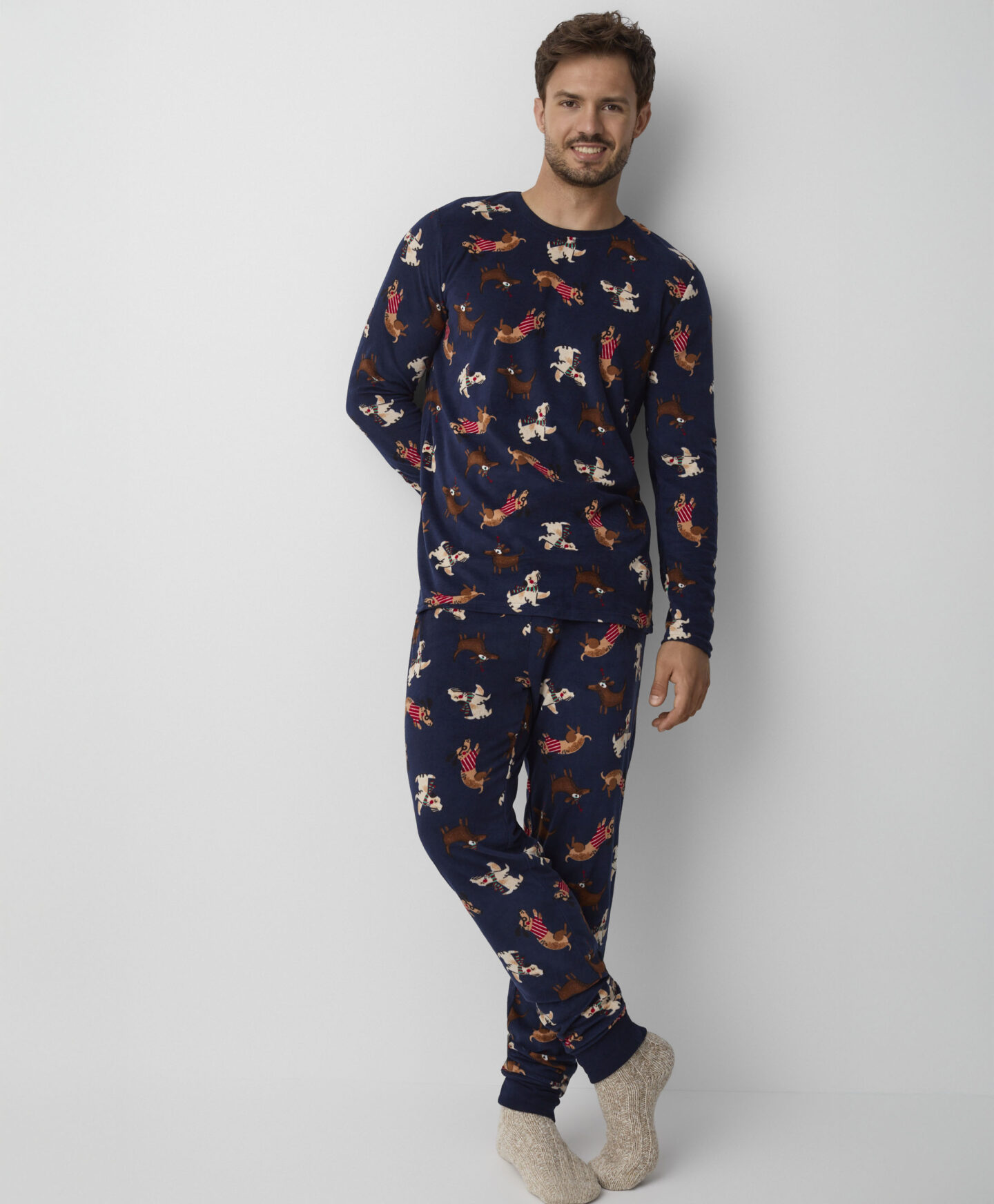 Plišana pidžama za muškarce sa dezenom pasa idealna je za hladnije dane. Napravljena od mekog i prijatnog pliša, pruža toplinu, udobnost za spavanje i osećaj ušuškanosti. Razigrani dezen sa motivima pasa učiniće da je svake večeri poželite obući pre spavanja. Idealna je za ljubitelje pasa.