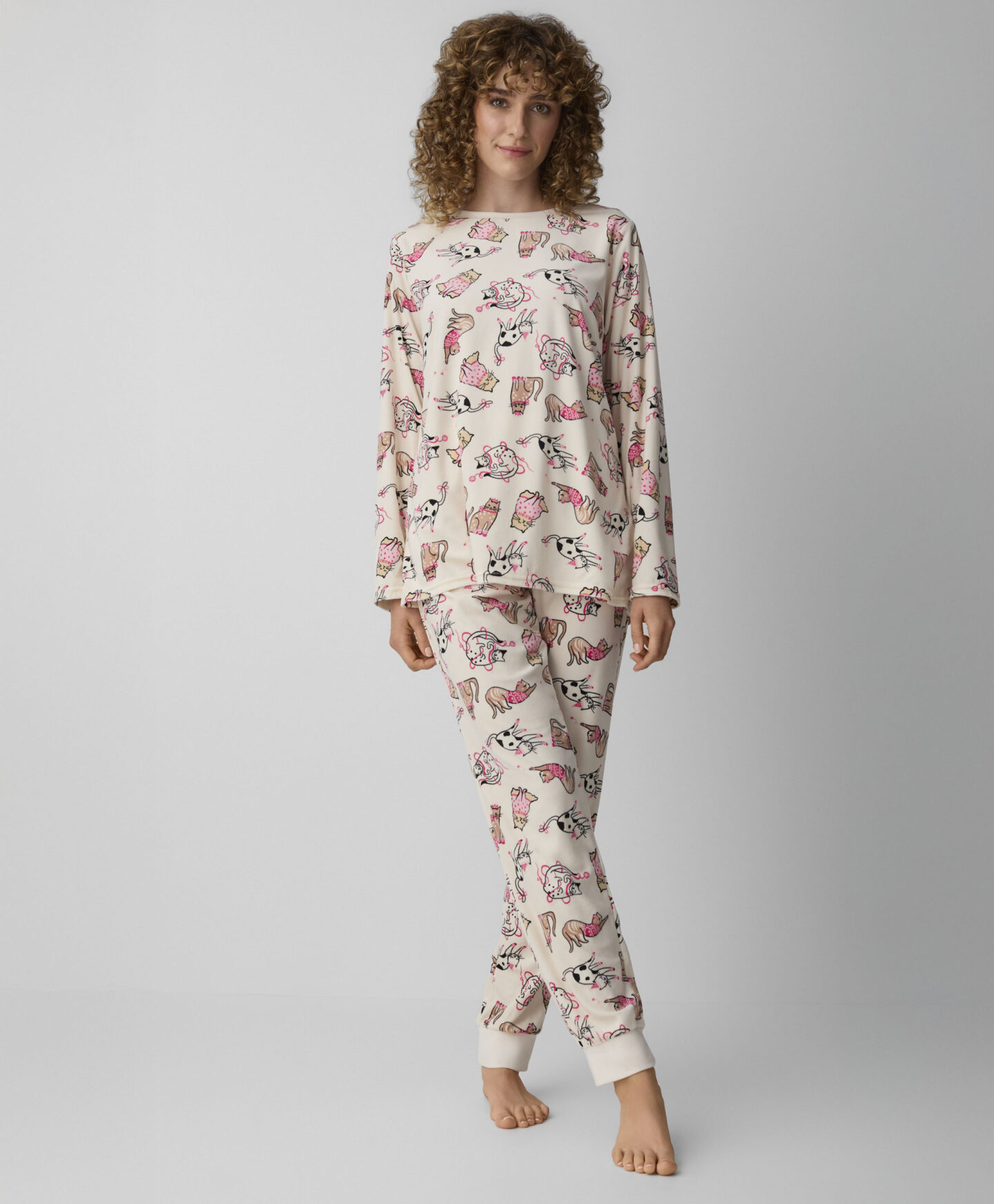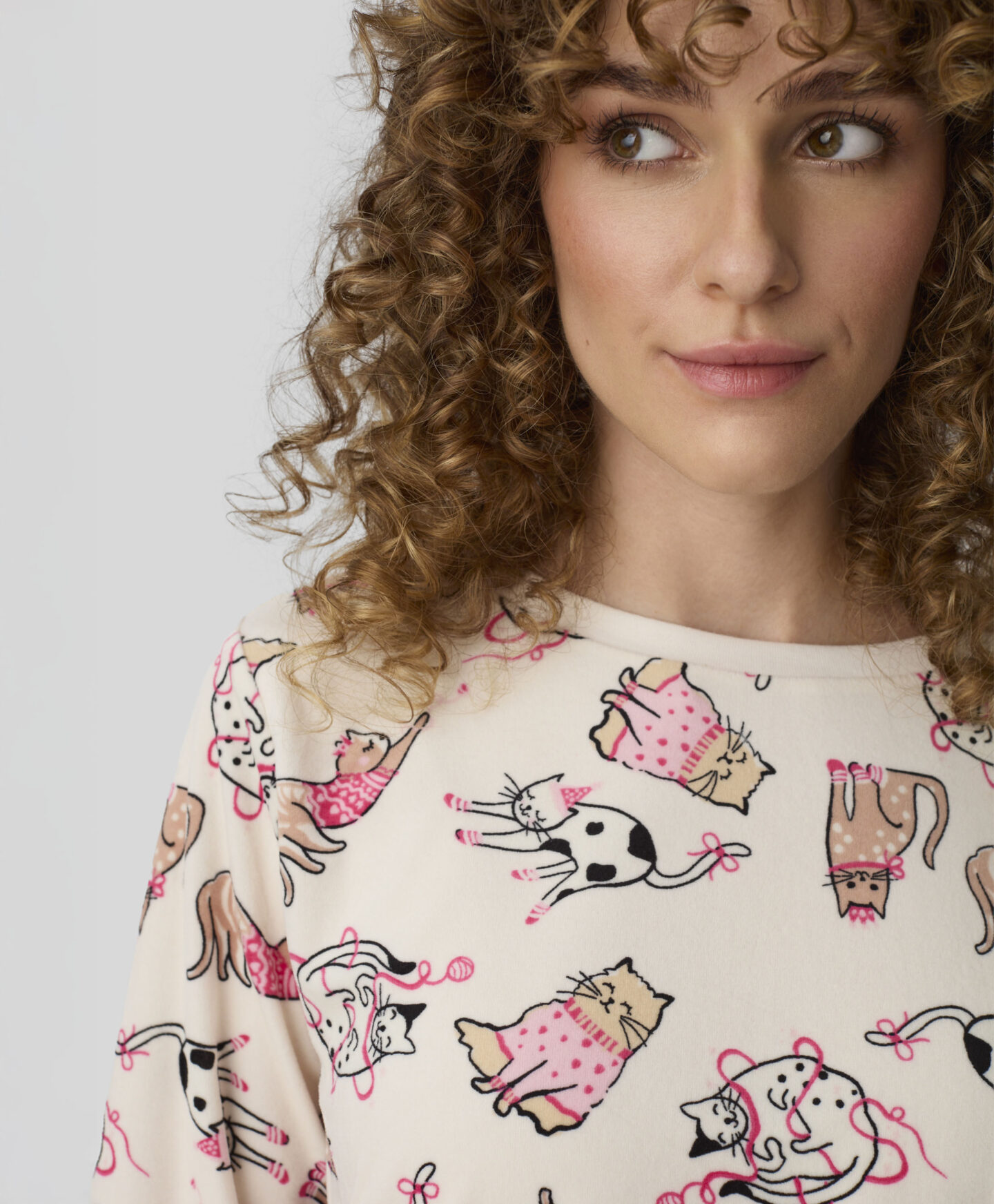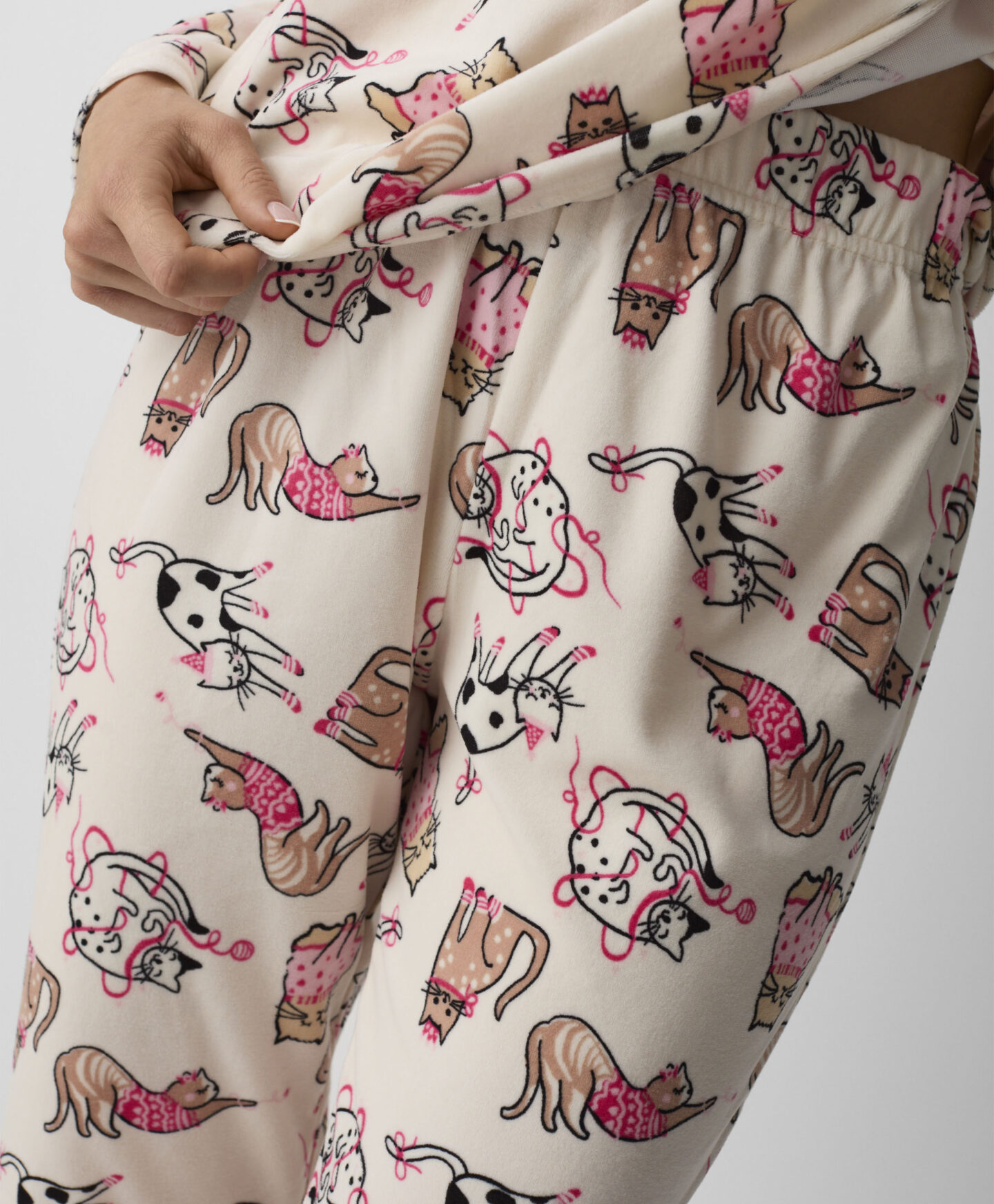 Plišana pidžama za žene sa dezenom mačaka idealna je za hladnije dane. Napravljena je od mekog i prijatnog pliša, pruža toplinu, udobnost za spavanje i slobodu kretanja. Šareni dezen sa motivima mačaka učiniće da poželite da je obučete pre spavanja.
