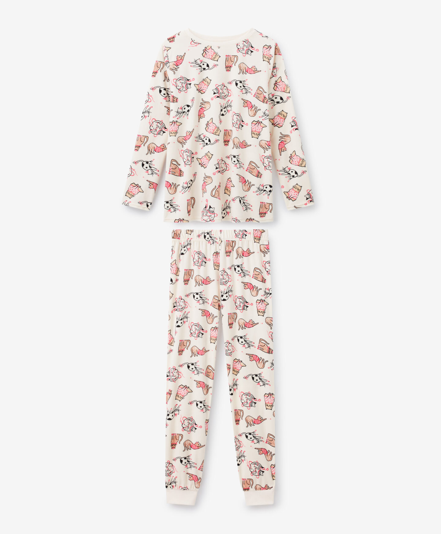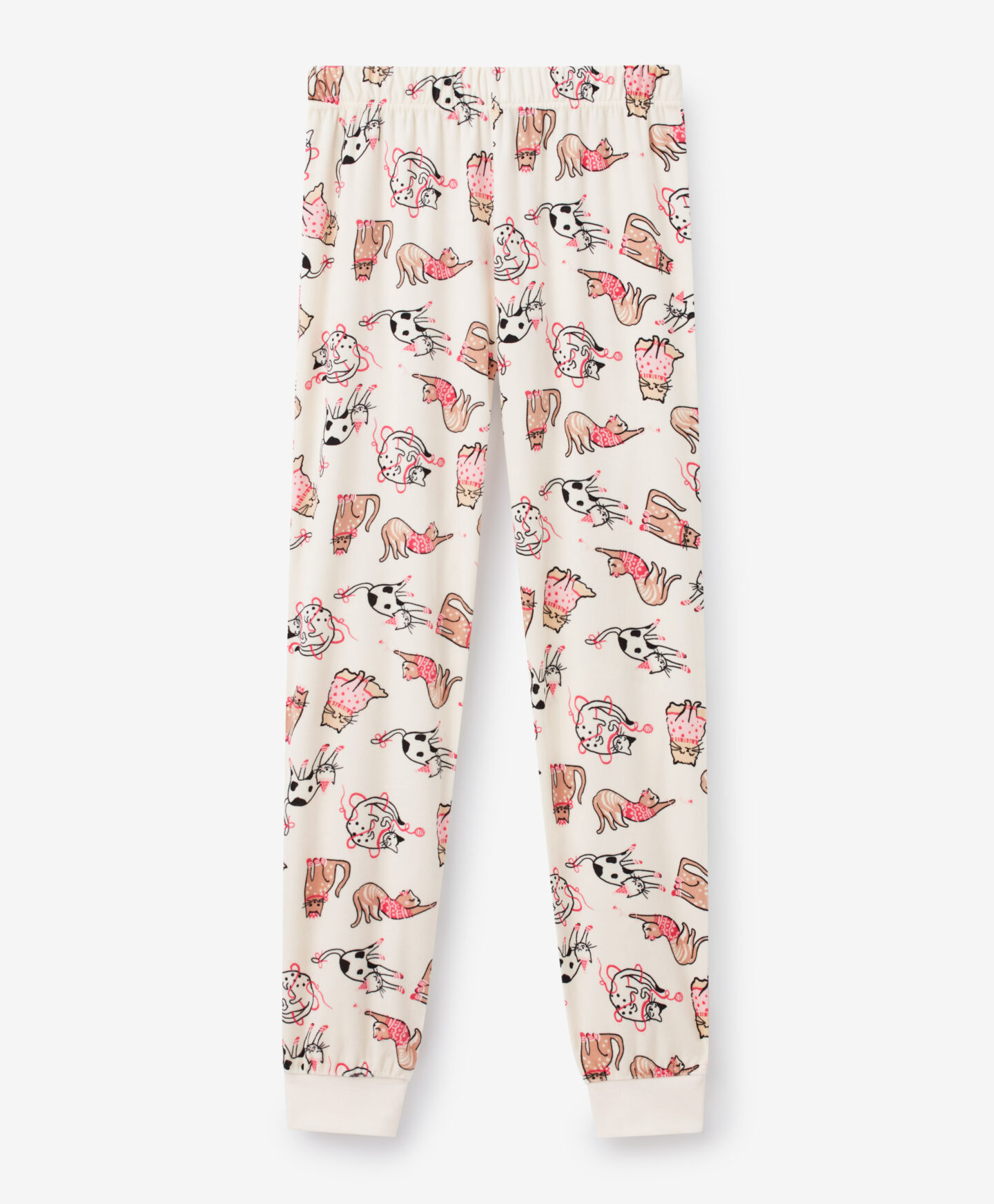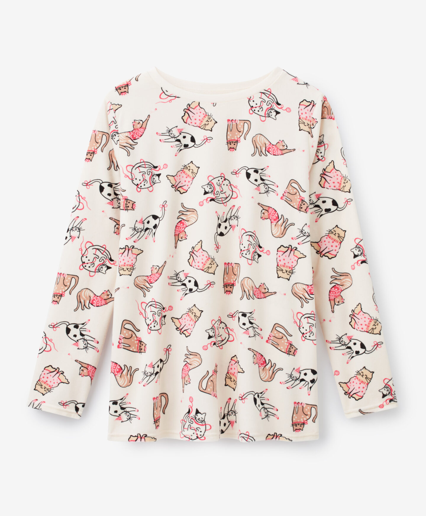 Plišana pidžama za žene sa dezenom mačaka idealna je za hladnije dane. Napravljena je od mekog i prijatnog pliša, pruža toplinu, udobnost za spavanje i slobodu kretanja. Šareni dezen sa motivima mačaka učiniće da poželite da je obučete pre spavanja.