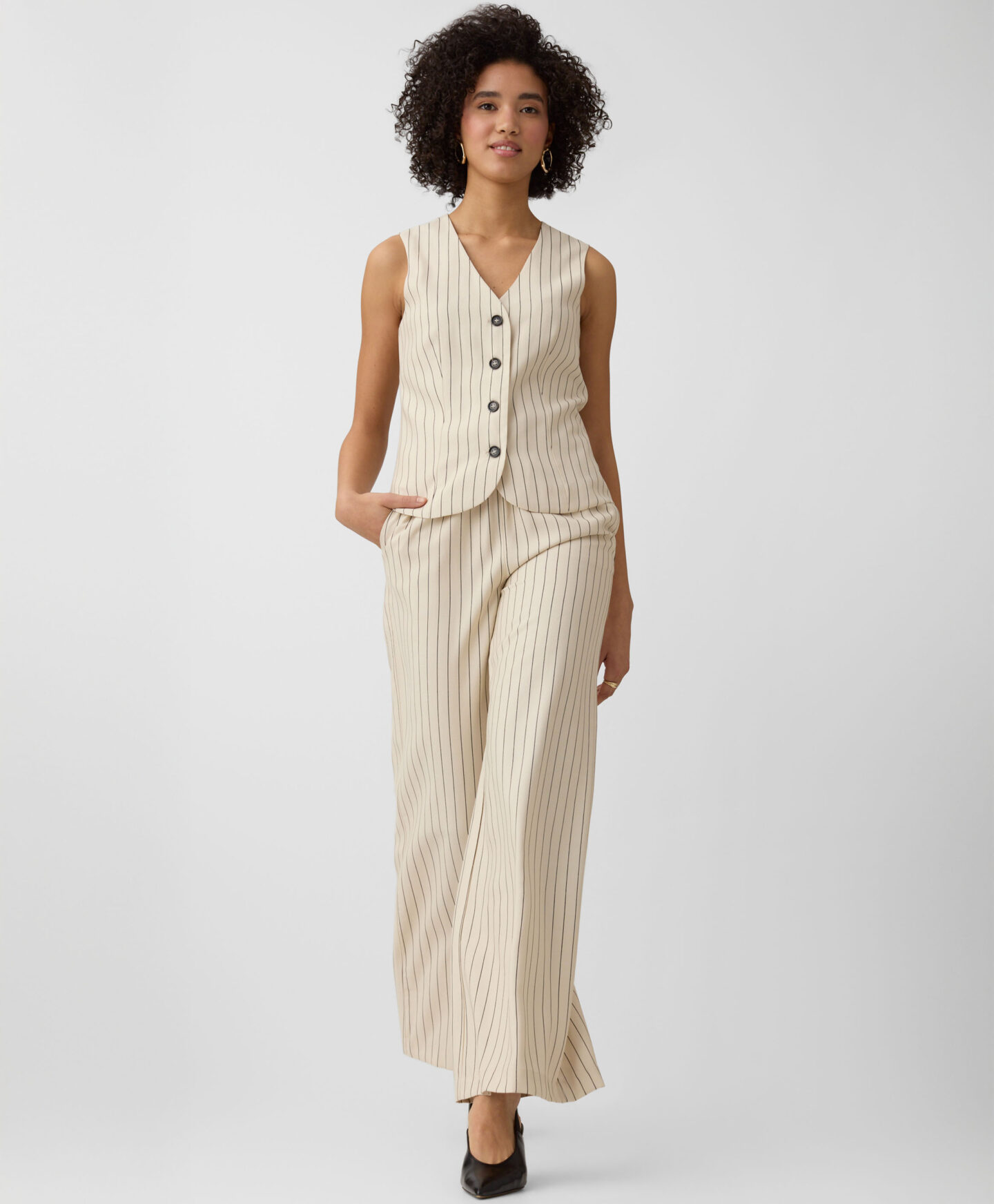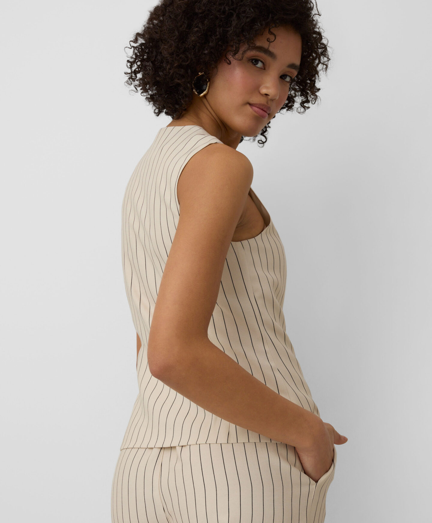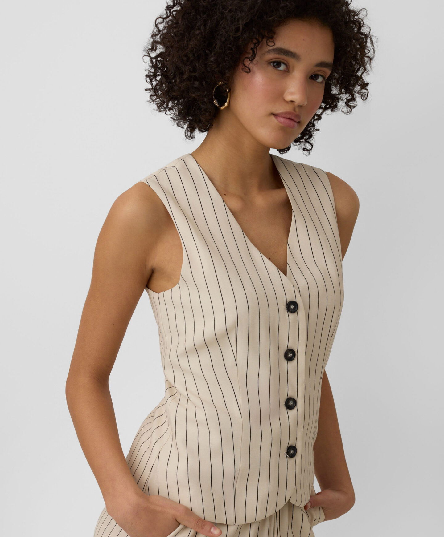 Ovaj prsluk za žene na pruge savršeno se uklapa uz odgovarajuće pantalone. Visok sadržaj viskoze čini ga laganim, prozračnim i idealnim za tople dane. Svedena paleta boja čini ga izuzetno zahvalnim za kombinovanje.