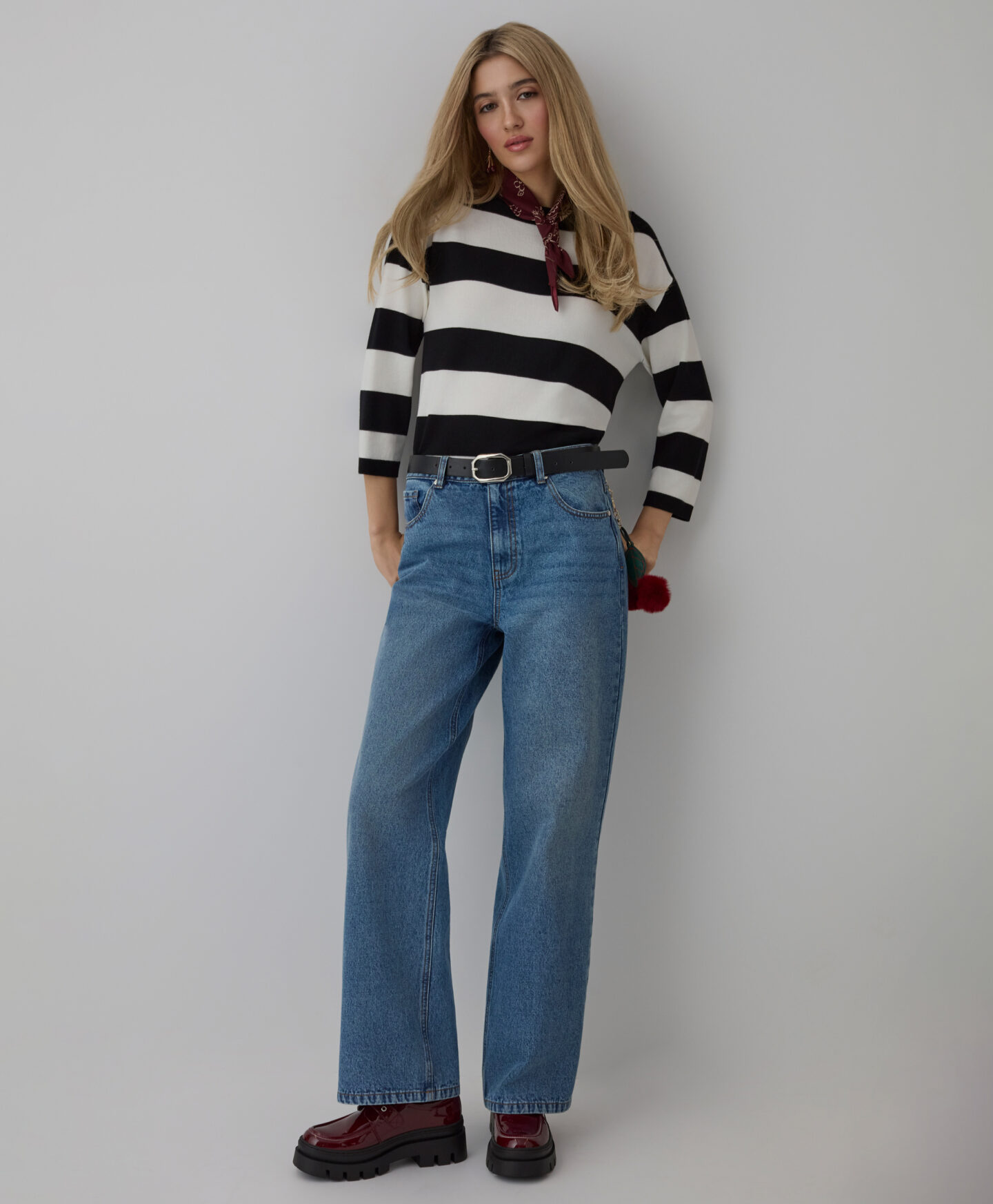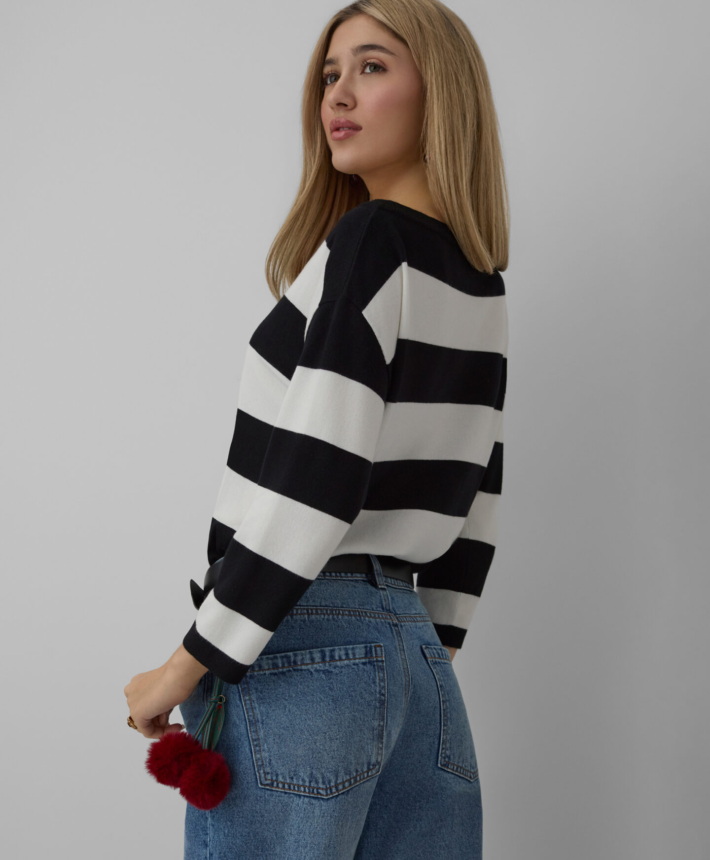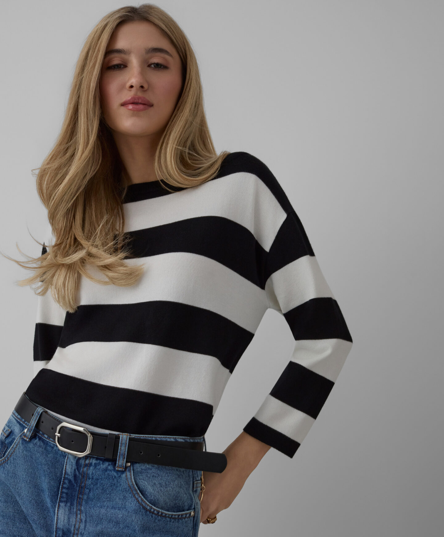 Prugasti džemper za žene ističe se svojim jedinstvenim krojem. Dodatak viskoze čini ga mekanim i prozračnim, pružajući udobnost tokom celog dana. Kimono stil daje mu poseban karakter i obezbeđuje slobodu pokreta.
