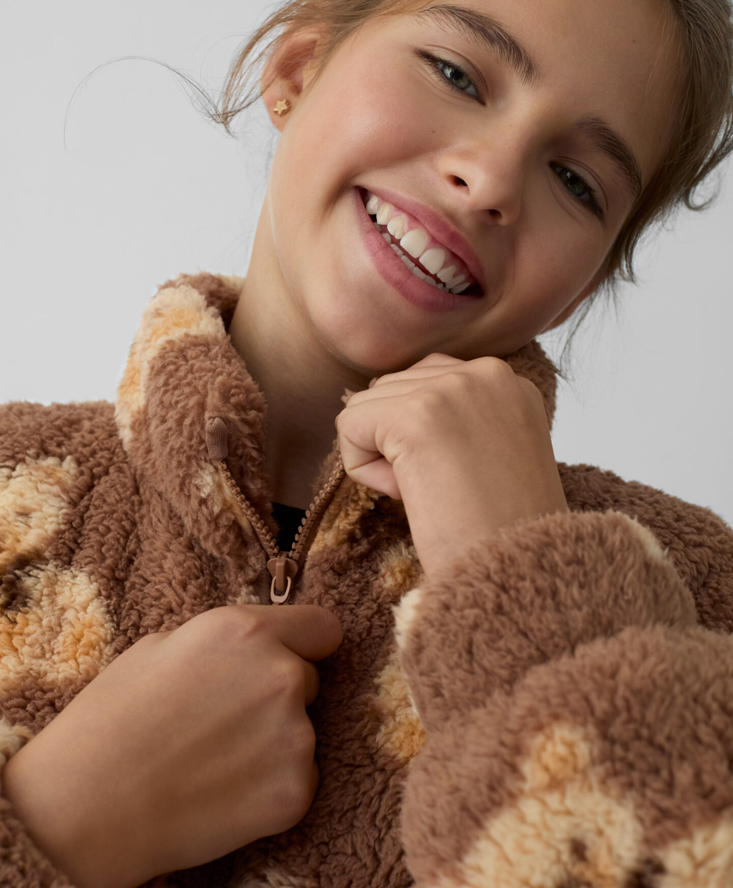 Šerpa gornji deo trenerke sa dezenom medvedića za devojčice dolazi sa rajsferšlusom. Kombinuje dobar stil, toplinu i udobnost. Napravljen je od mekanog materijala koji nežno obavija kožu deteta. Rajsferšlus celom dužinom osigurava brzo oblačenje i skidanje, dok opušten kroj omogućava slobodu kretanja, pružajući detetu potpunu udobnost.