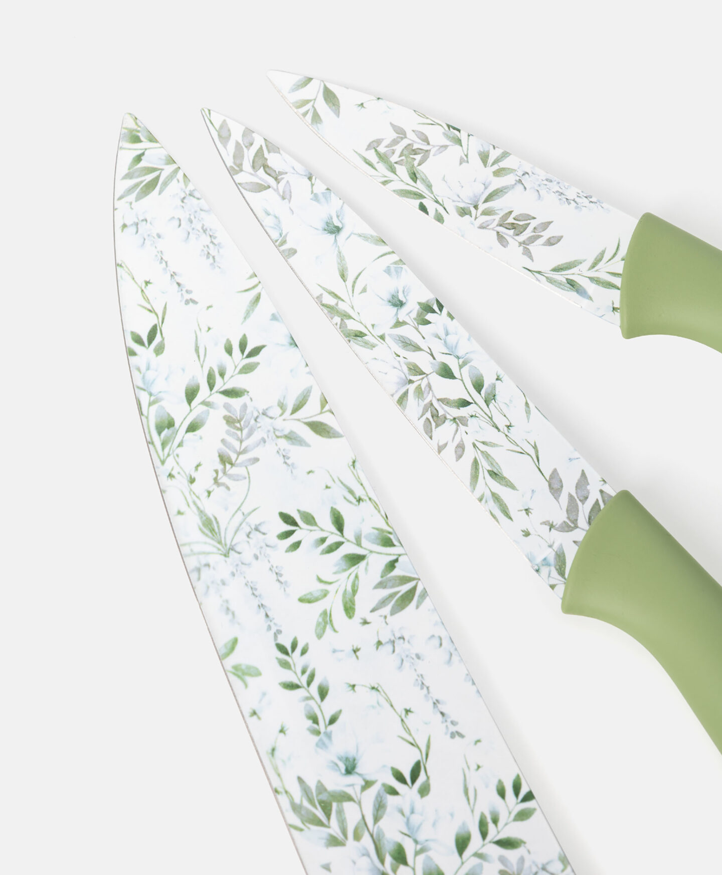 Set kuhinjskih noževa sastoji se od tri komada različitih veličina koji će unaprediti vašu svakodnevnu pripremu hrane. Savršeni su za sečenje mesa, ribe, povrća i voća, kao i za seckanje začinskog bilja. Nerđajući čelik dugo zadržava oštrinu, lako se čisti i otporan je na svakodnevnu upotrebu. Ergonomska drška u pastelno zelenoj boji i sečivo ukrašeno prolećnim motivom uneće boje u vašu kuhinju. U ponudi su i odgovarajuće daske za sečenje.