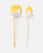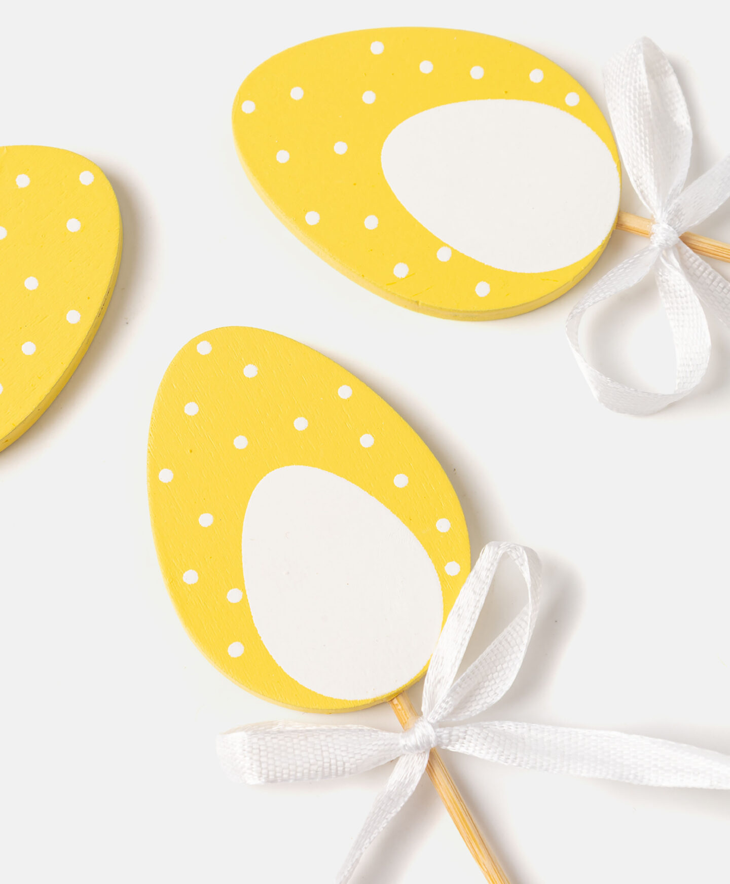 Set od 4 ukrasa na štapiću sa motivom jaja, elegantna je dekoracija inspirisana uskršnjim simbolima. Ovo je savršen set za ukrašavanje korpi, saksija sa cvećem ili buketa. Dostupno u više dezena.