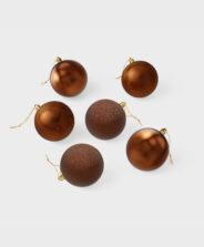 Set od 6 braon plastičnih kugli će naglasiti praznični karakter vaše jelke. Tople nijanse dodaju eleganciju i daju celom aranžmanu magičnu atmosferu. Ovo je klasik koji uvek prelepo izgleda među zelenim granama.