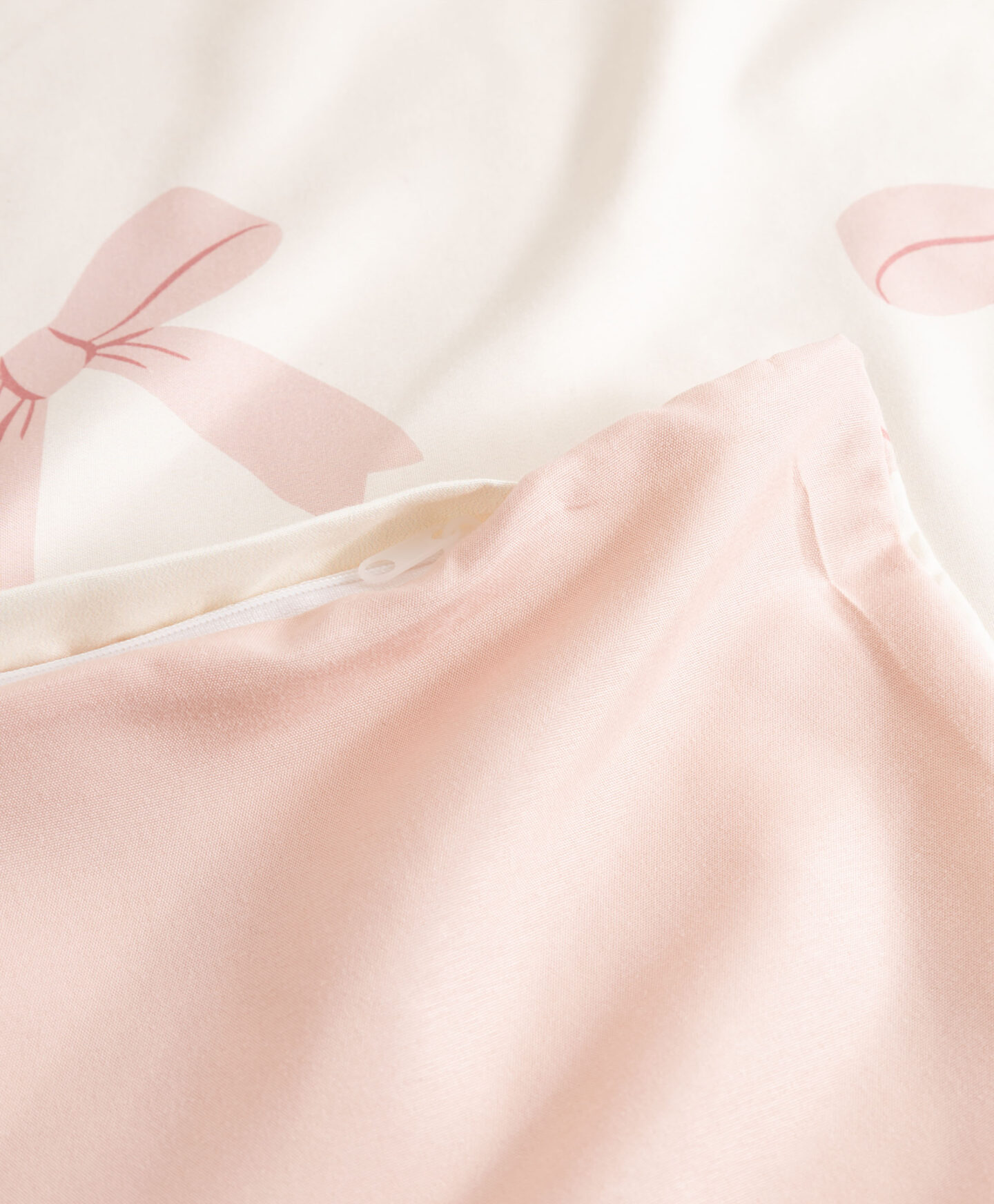 Set posteljine od mikrofibera sadrži dve jastučnice dimenzija 50 x 60 cm i navlaku za jorgan dimenzija 160 x 200 cm. Zahvaljujući praktičnom rajsferšlusu, menjanje posteljine je brzo i jednostavno. Dezen sa slatkim mašnama savršen je ne samo za dečiju sobu već i za sve ljubitelje mašni bez obzira na godine.