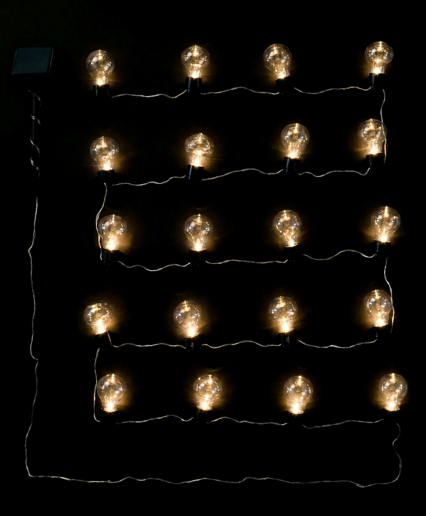 Solarni niz lampica sa sijalicama i 20 LED dioda radi bez dodatnih kablova i baterija zahvaljujući ugrađenom solarnom panelu. Sastoji se od 20 dekorativnih LED sijalica tradicionalnog izgleda koje stvaraju čarobnu i prijatnu atmosferu, idealne su za večernja druženja. Lampice se automatski uključuju u sumrak i isključuju u zoru, pružajući osvetljenje tokom cele noći bez dodatnog angažovanja.