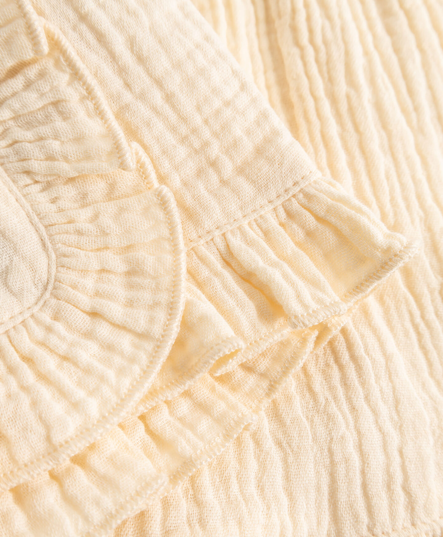 Šorts za bebe devojčice od 100% pamuka spaja šarm i praktičnost. Napravljen od prirodnog, prozračnog pamučnog muslina, izuzetno je nežan i mekan za osetljivu bebinu kožu. Slatki karneri daju mu nežan i elegantan izgled, savršen za posebne prilike. Udoban elastični pojas i široke nogavice čine ovaj model idealnim za aktivne bebe.