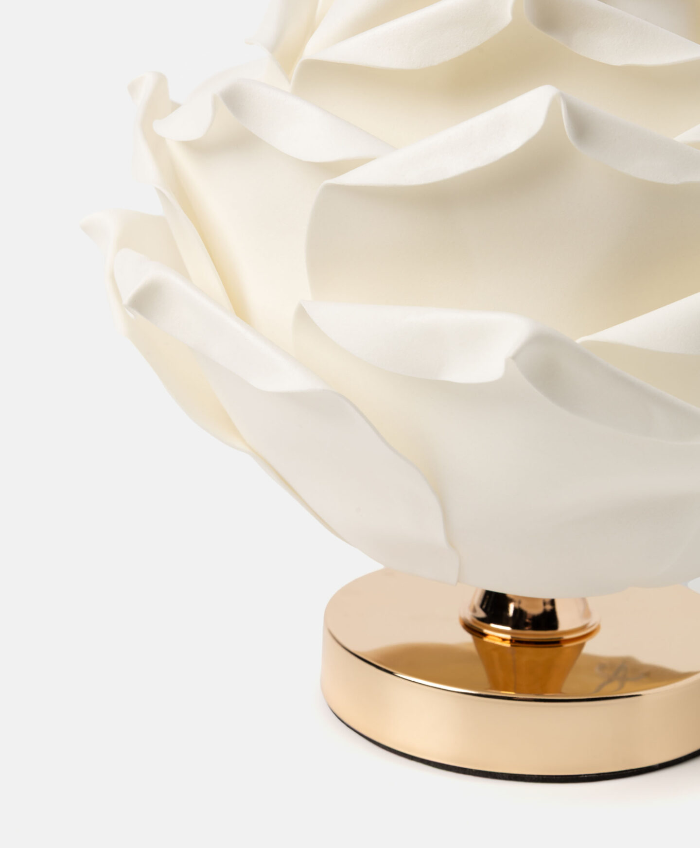 Stona lampa u obliku cveta privlači pažnju svojim jedinstvenim oblikom. Abažur podseća na zatvoreni cvetni pupoljak, sastavljen od nežnih latica krem boje. Kontrastno zlatno postolje daje lampi elegantan karakter koji se uklapa kako u klasično, tako i u modernije uređene enterijere. Suptilno svetlo stvoriće prijatnu i ušuškanu atmosferu u prostoru.