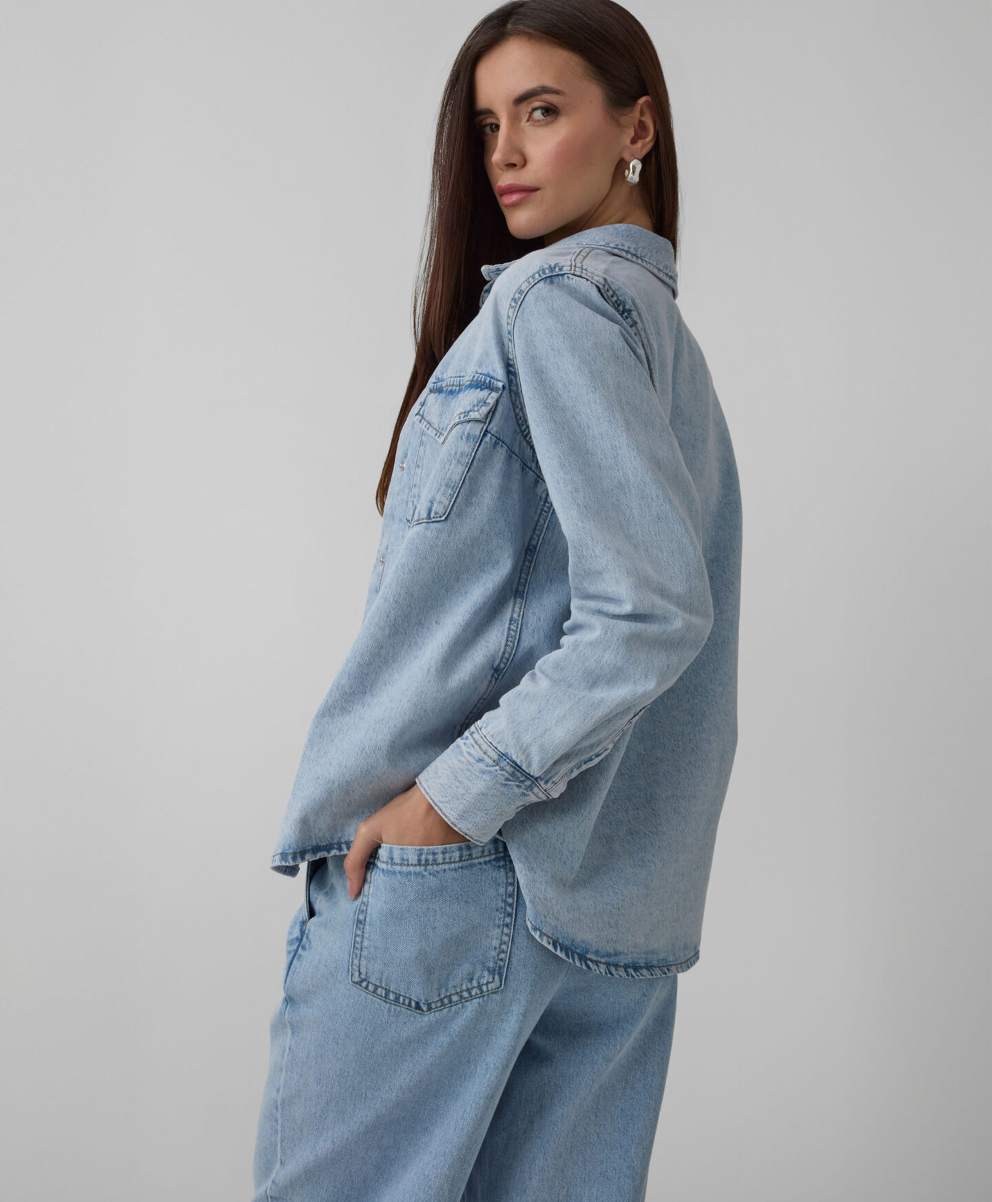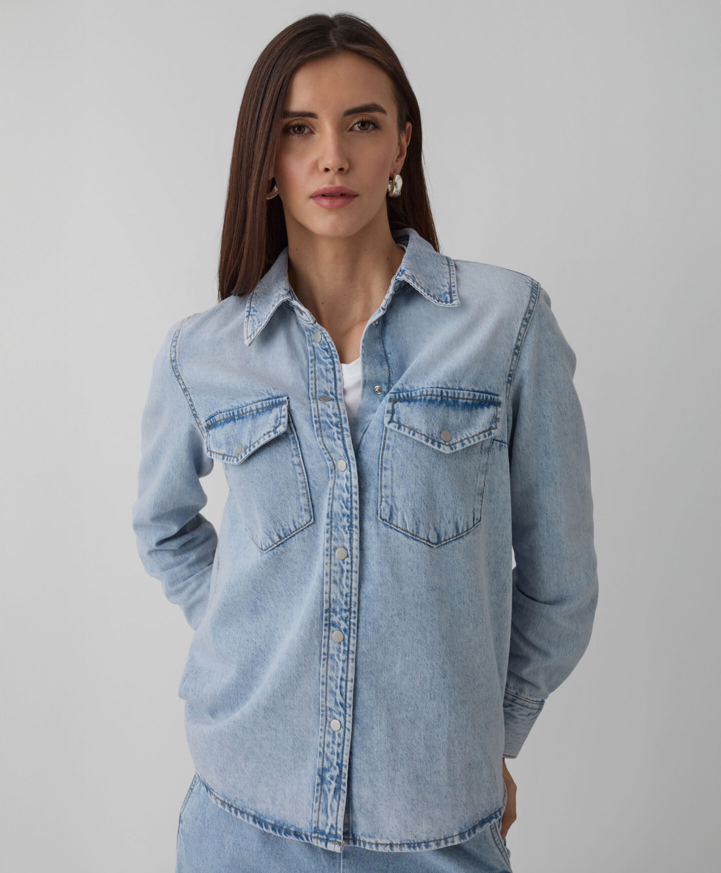 Teksas košulja za žene od 100% pamuka neizostavan je element garderobe svake ljubiteljke klasičnog stila. Teksas u prigušeno plavoj boji lepo će se uklopiti uz svaki komad u vašem ormaru – od pantalona do suknji, od ležernih do elegantnih kombinacija. Košulja se nežno prilagođava silueti, a pritom pruža potpunu slobodu kretanja i neviđenu udobnost pri nošenju. Džepovi na grudima su funkcionalni, ali dodaju i poseban karakter.