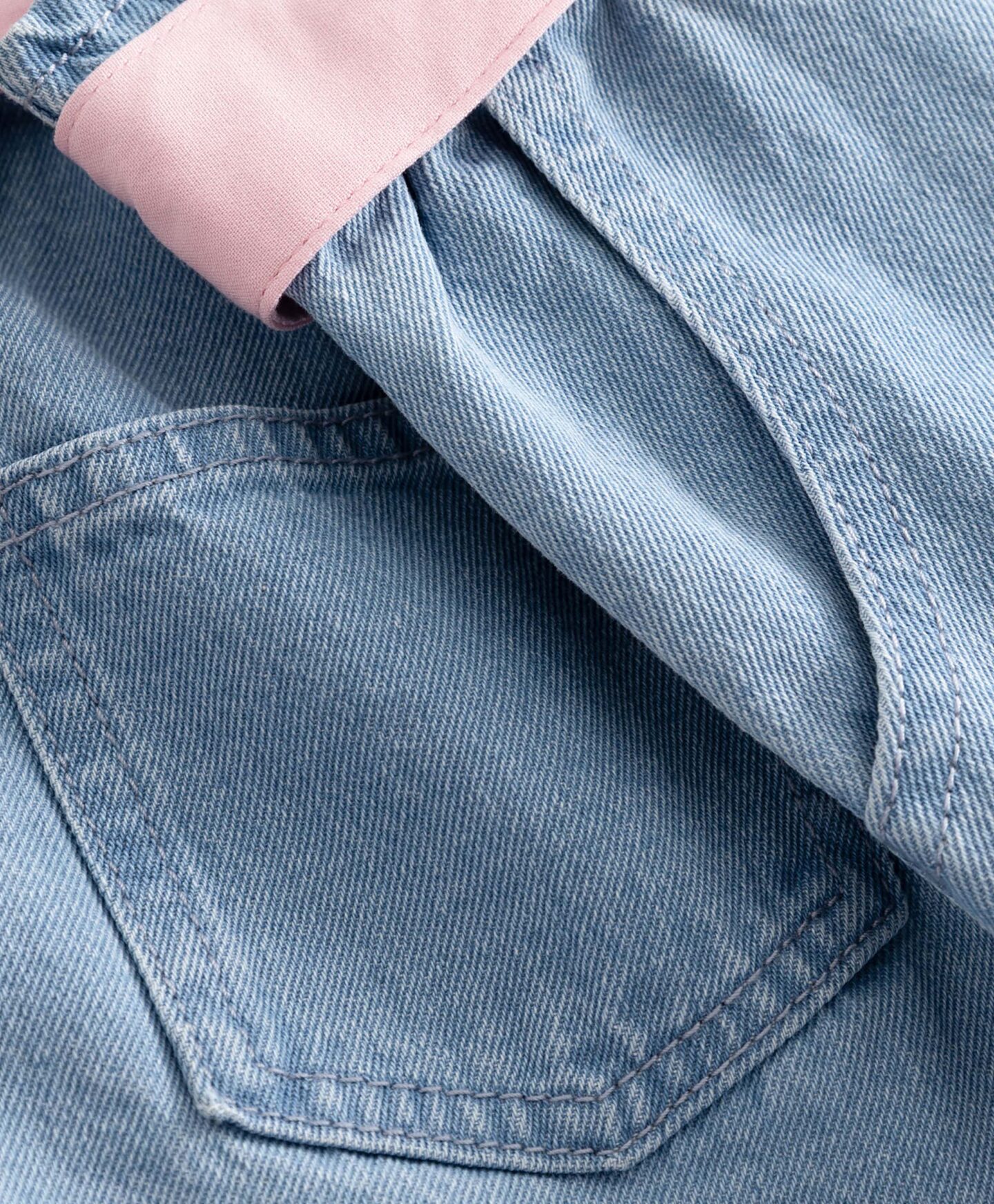 Ovaj teksas šorts za devojčice od 100% pamuka je prozračan i nežan prema koži. Upadljivi roze pojas daje mu dozu elegancije. Blago podvrnute nogavice i optimalna dužina čine ga modernim, ali i veoma praktičnim.
