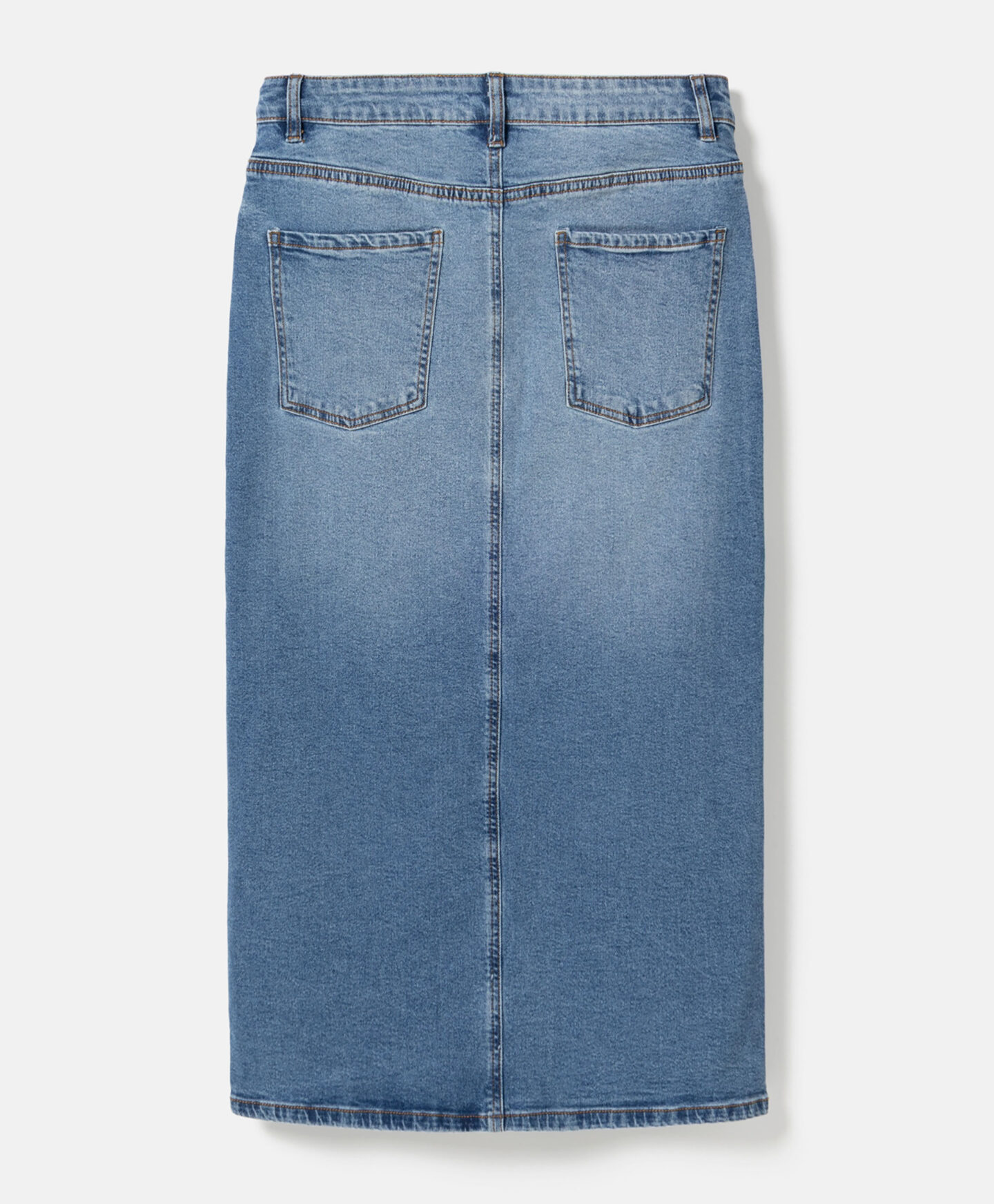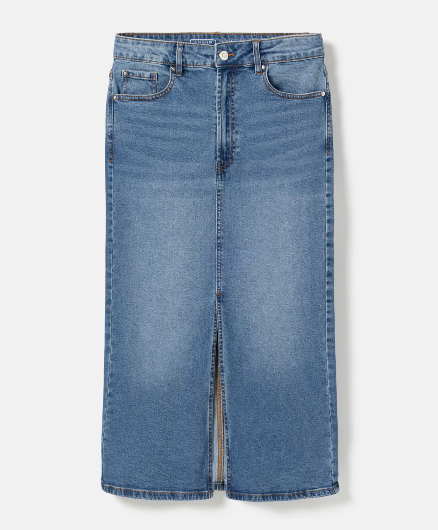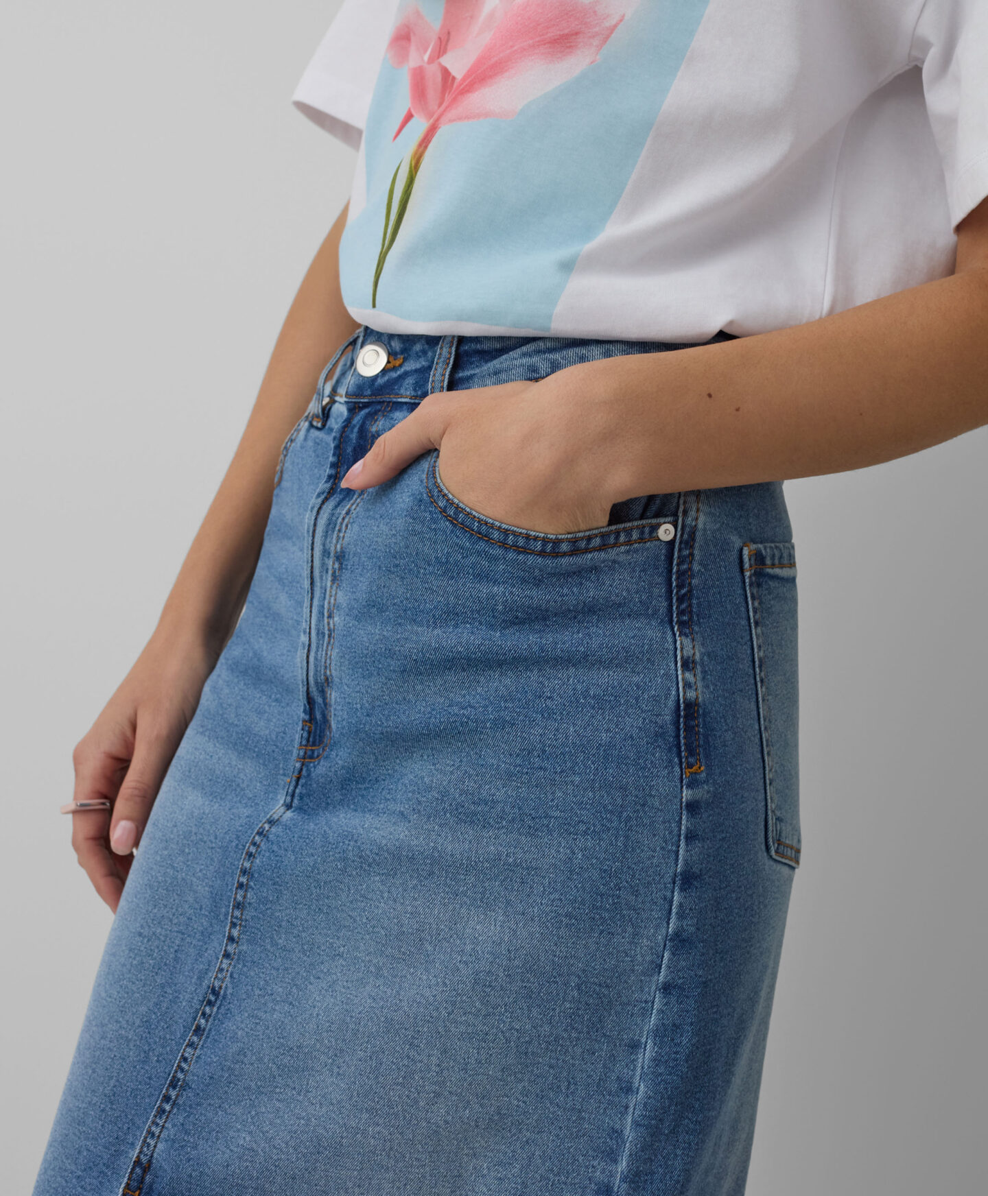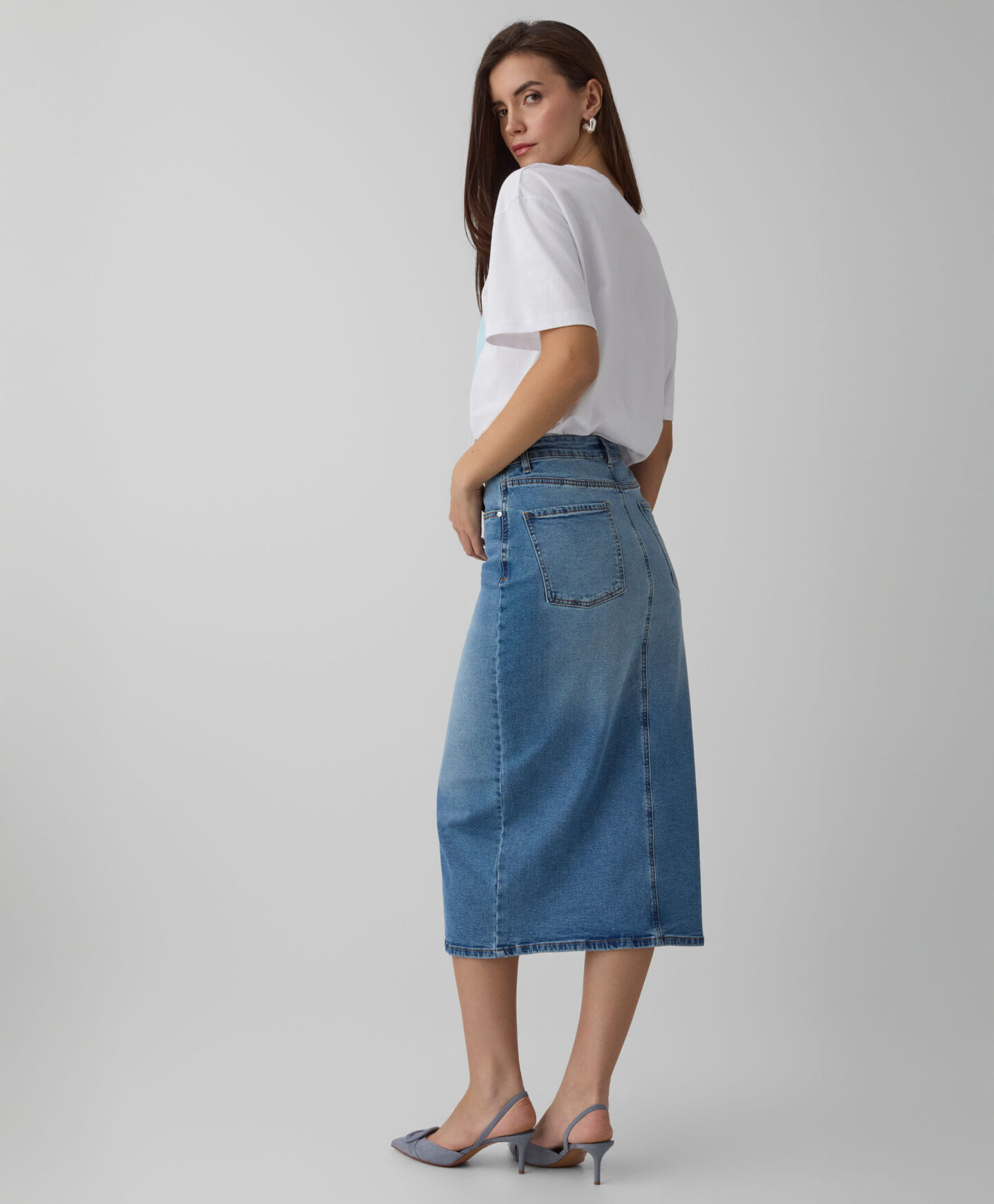 Teksas suknja sa šlicem napred savršeno ističe figuru. Univerzalni teksas se dobro slaže i sa klasičnim majicama, ali i sa elegantnim košuljama. Nudi istu slobodu pri odabiru obuće — izaberite patike za ležeran efekat ili visoke potpetice za elegantan izgled. Midi dužina čini suknju pogodnom za svaku priliku.